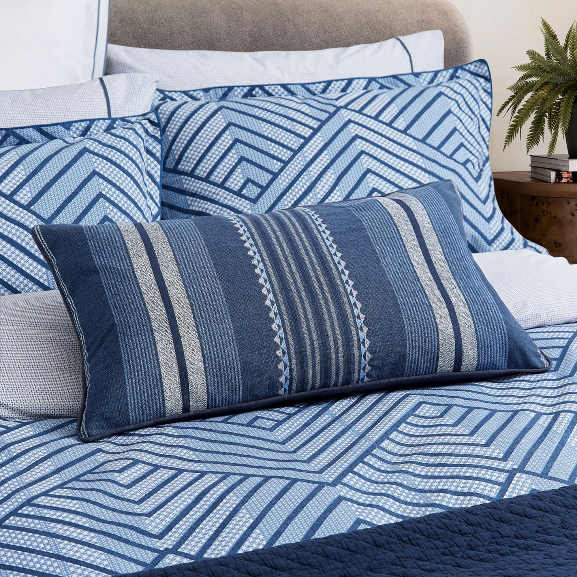 This textured cotton cushion features printed stripes in a charcoal and indigo colour palette, accented with embroidered detailing and a plain reverse. Pair with These square pillowcase pairs offer a simple, elegant way to add pattern to the bed, featuring a double layer of fabric around the outer edges of the pillowcases overlocked in charcoal grey and navy threads. Complete the look a generously sized cotton throw, coloured in deep indigo tones, featuring a quilted geometric tile pattern and plain bound edges.