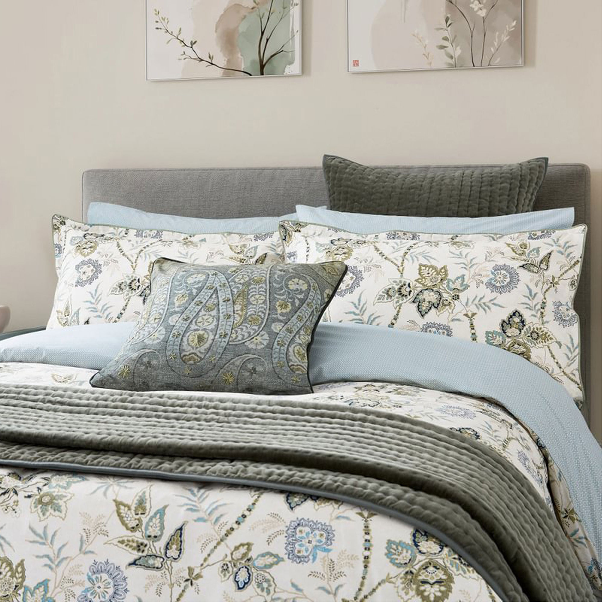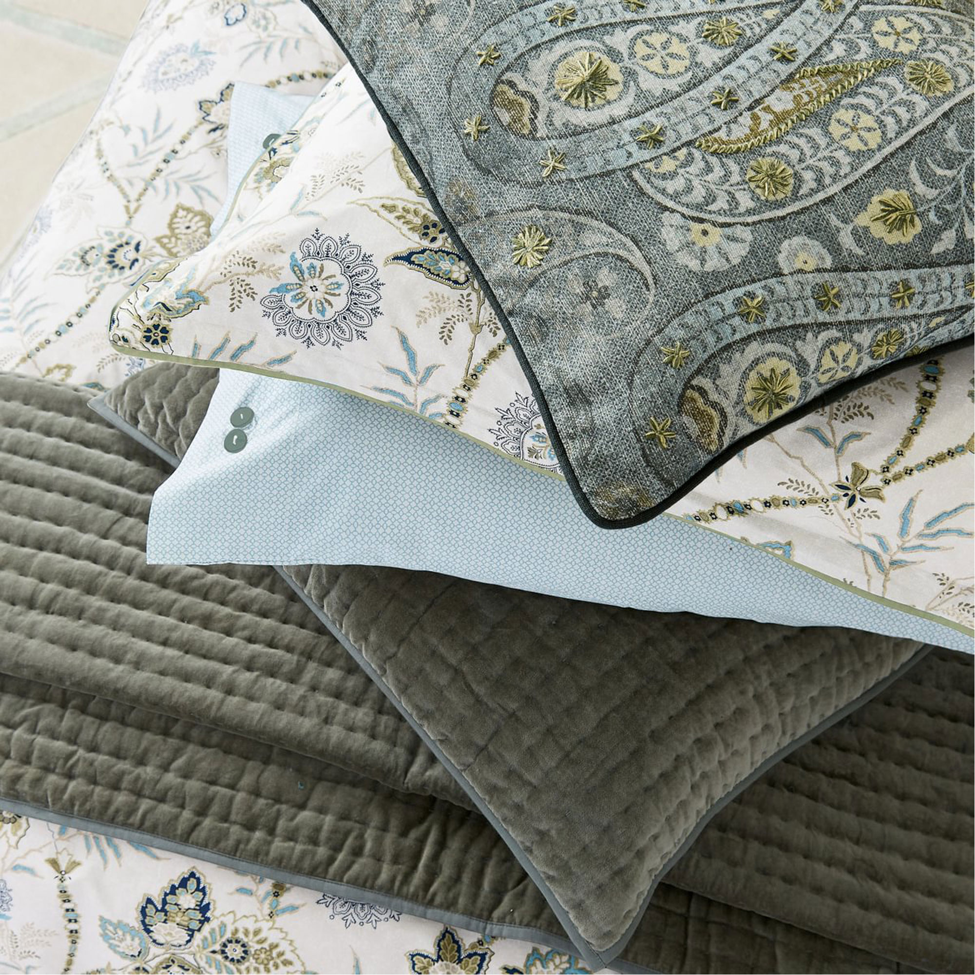 A textured cotton cushion digitally printed with an intricate paisley design with embroidered accents. It has a plain reverse and is finished with a piped edging. Pair with a green velvet sham featuring hand-quilted vertical lines with a green cotton reverse and bound edges. Complete the look with Tactile layers are introduced with the hand quilted green velvet throw, featuring a plain cotton reverse and bound edges.