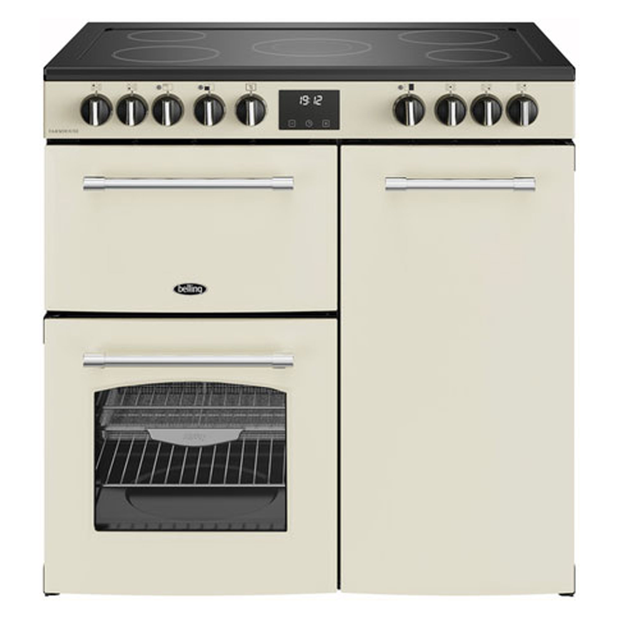 Bringing traditional charm with modern performance, the Belling Farmhouse FH90ECRM 90cm Electric Ceramic Range Cooker is designed for home cooks who love to prepare hearty meals with ease. With a spacious 157-litre cooking capacity, two ovens, and a separate grill, this electric range cooker is perfect for big batch cooking, Sunday roasts, and baking.