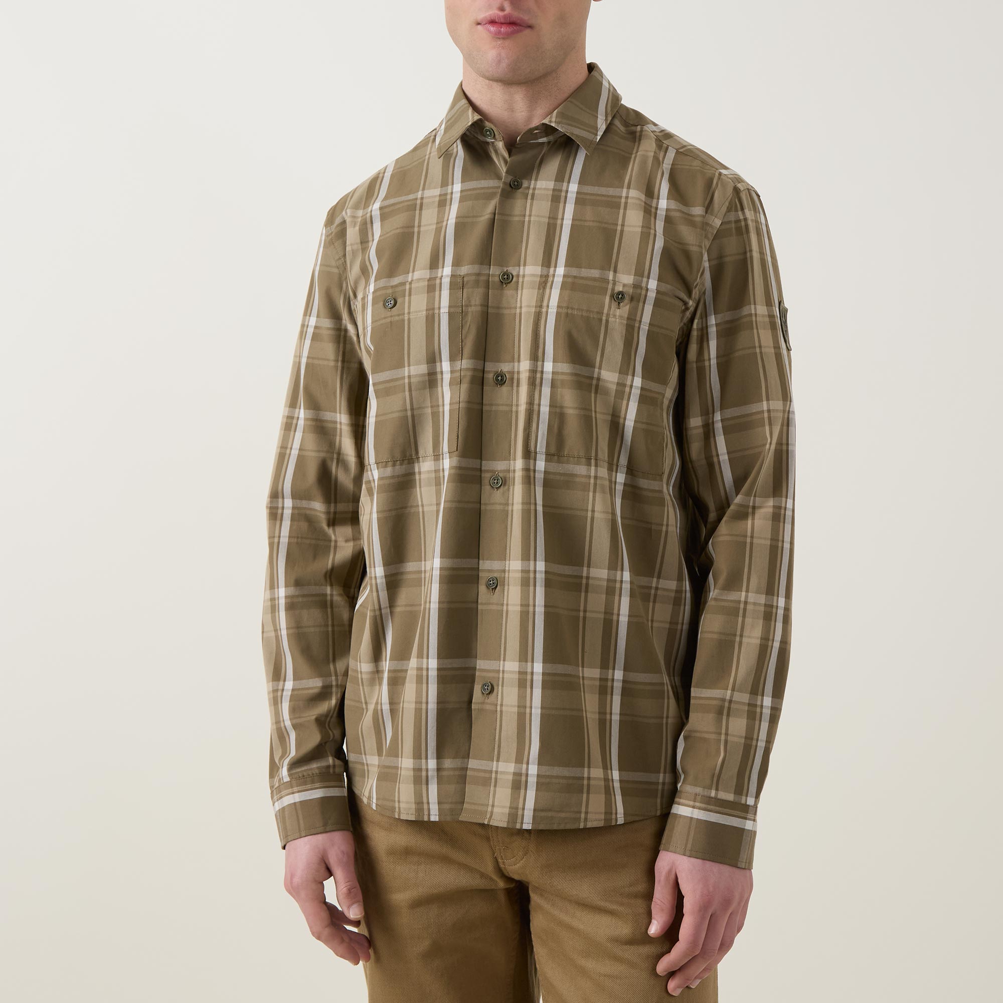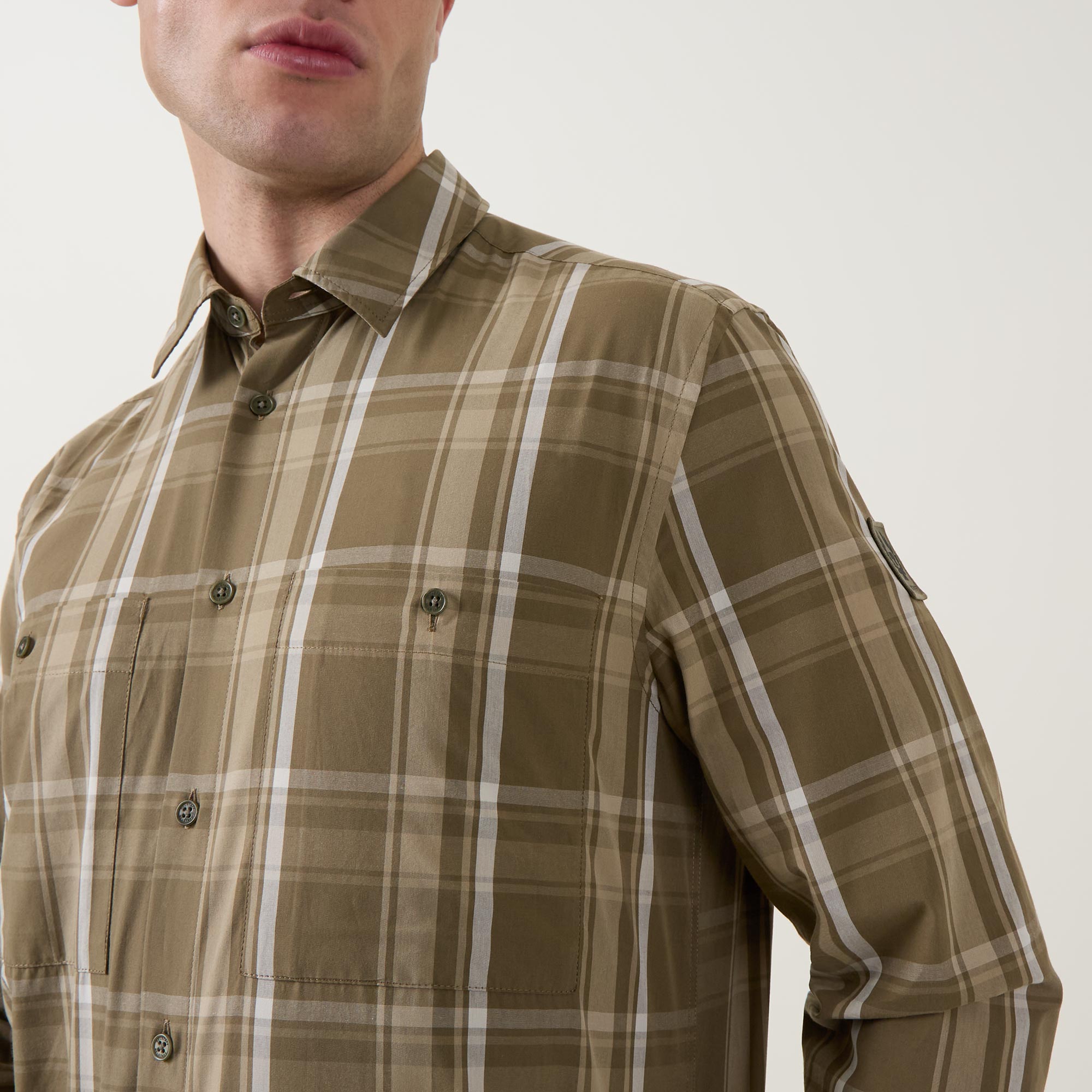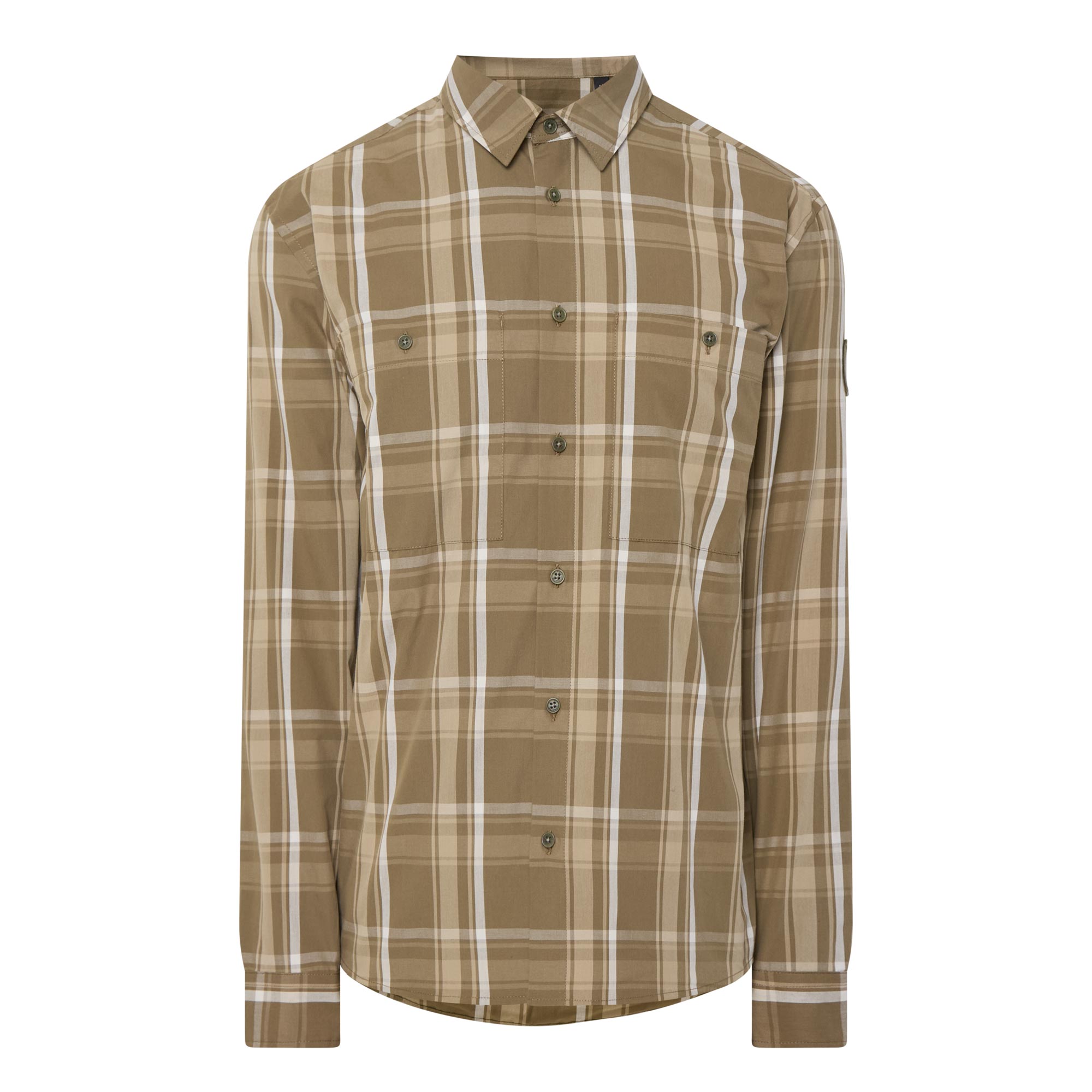 - Point collar, long sleeves, buttoned cuffs, front button fastening, two chest patch pockets with button closures, curved hem, check print, logo badge on the arm