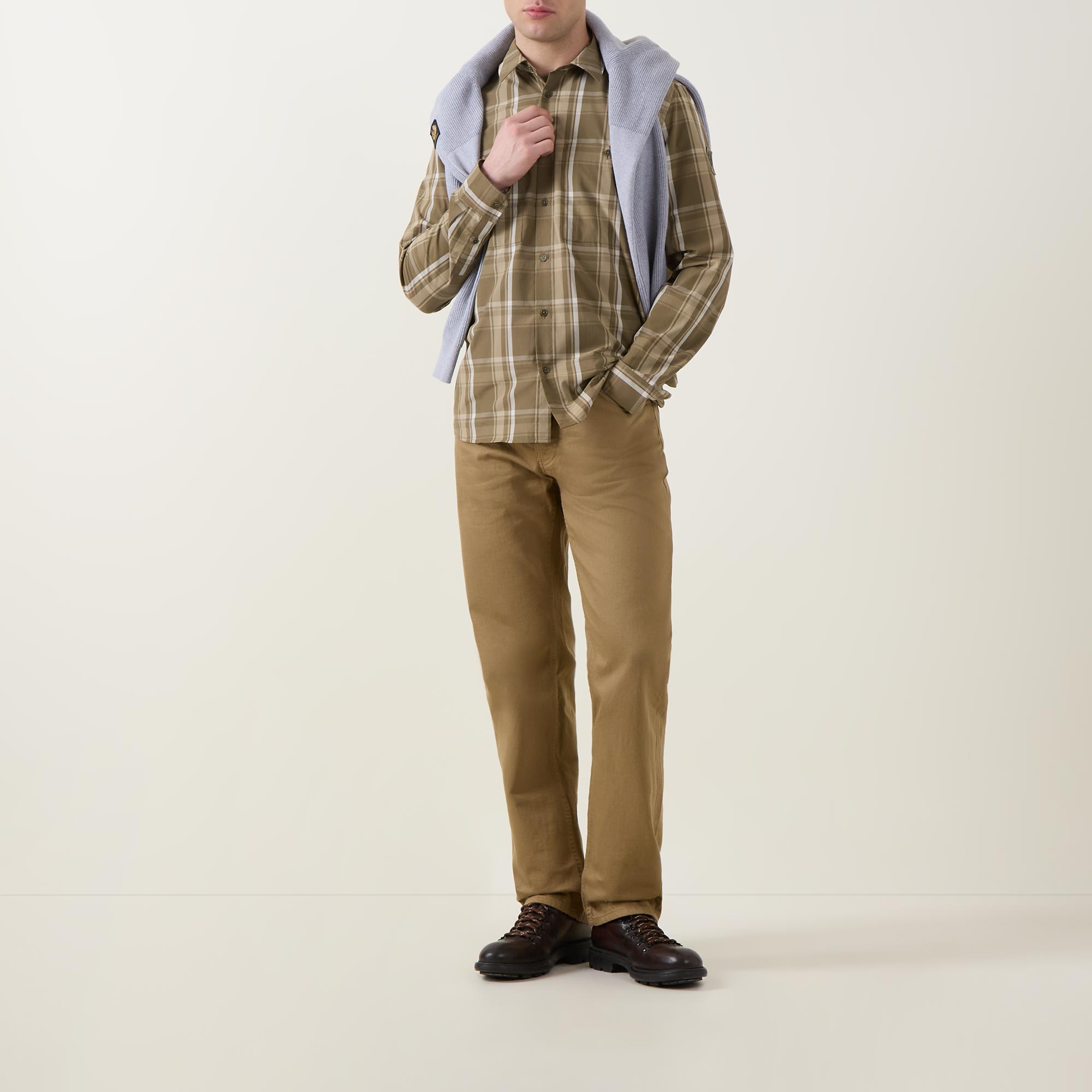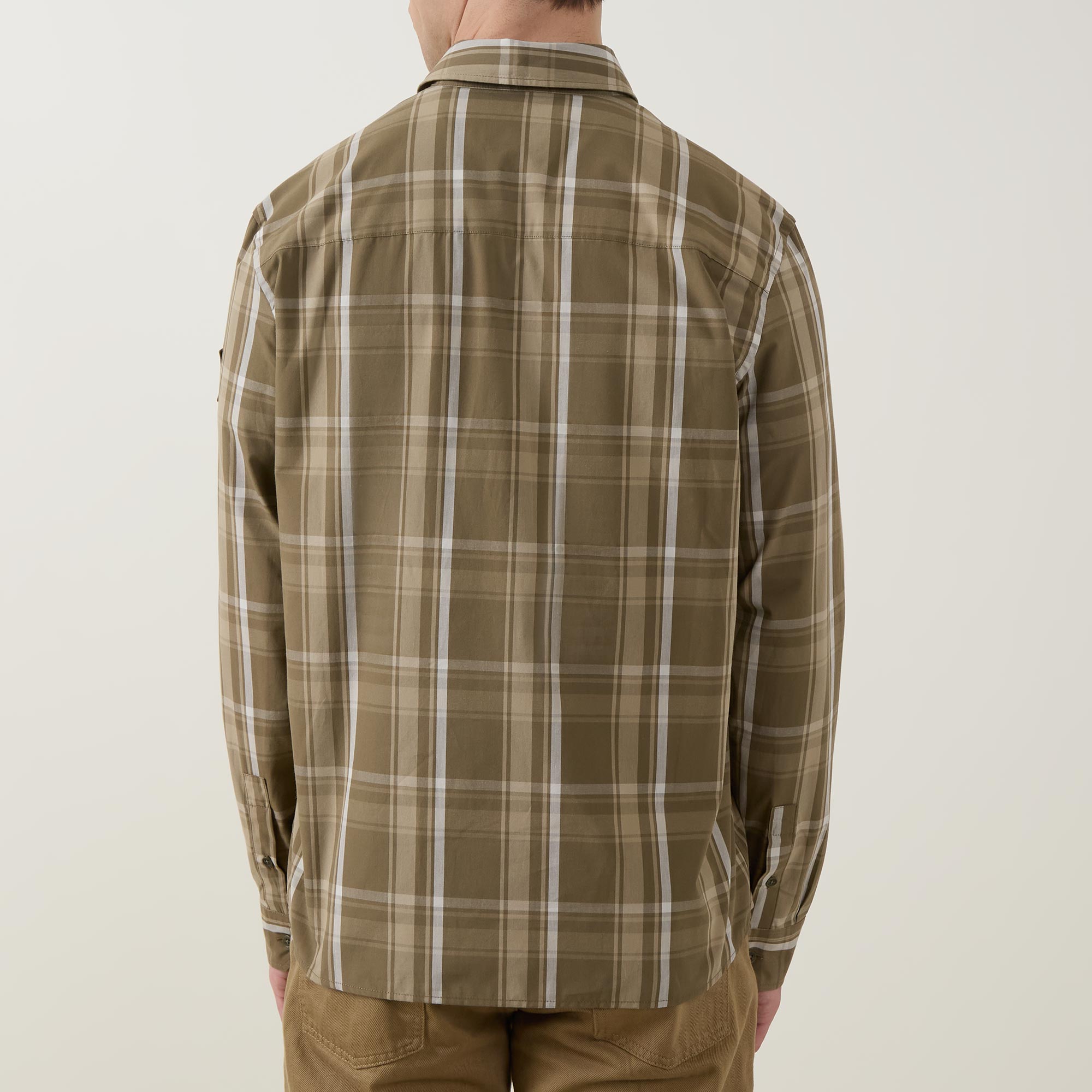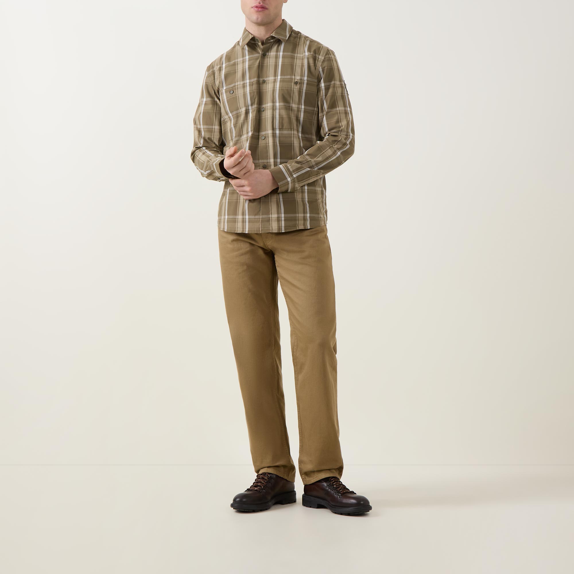 - Point collar, long sleeves, buttoned cuffs, front button fastening, two chest patch pockets with button closures, curved hem, check print, logo badge on the arm