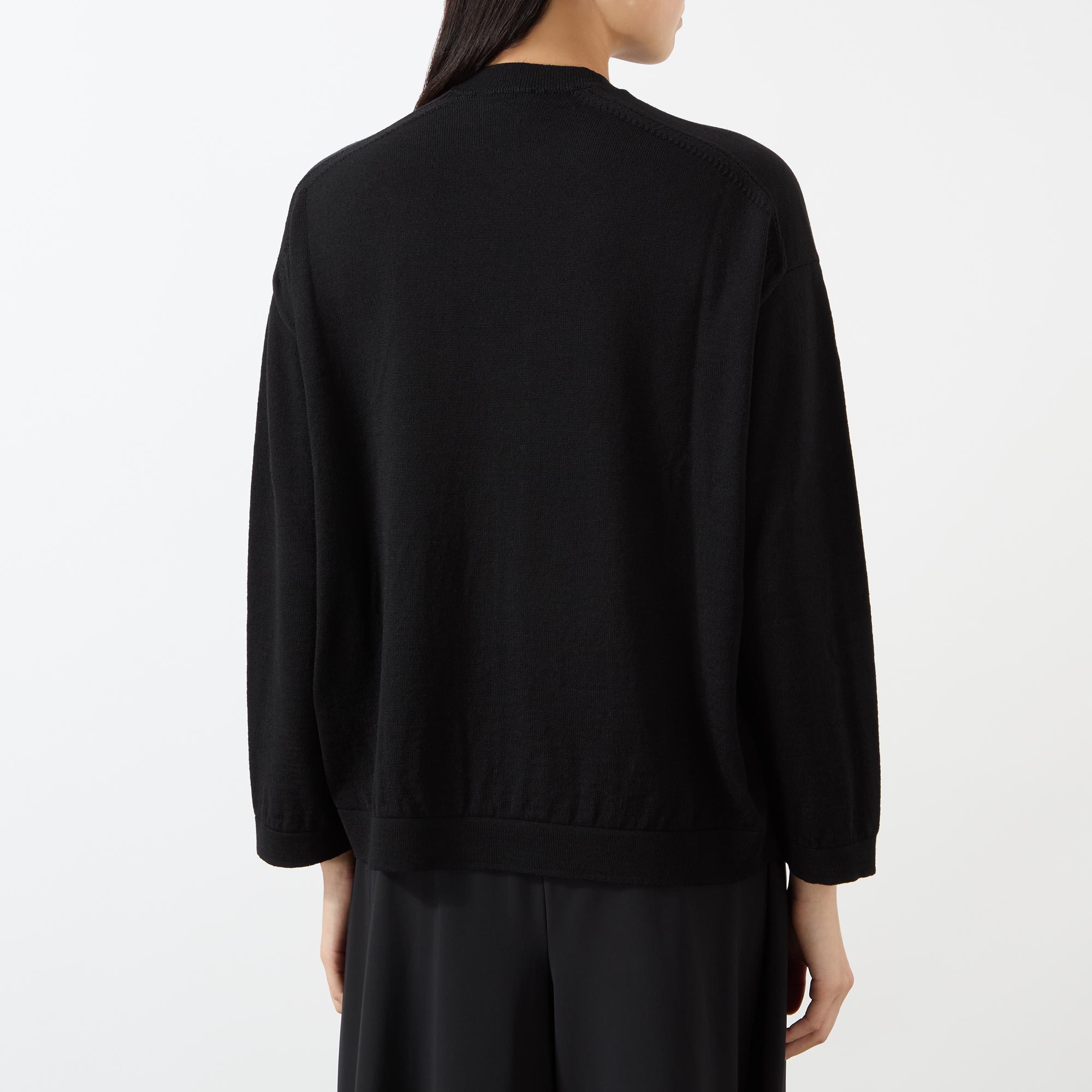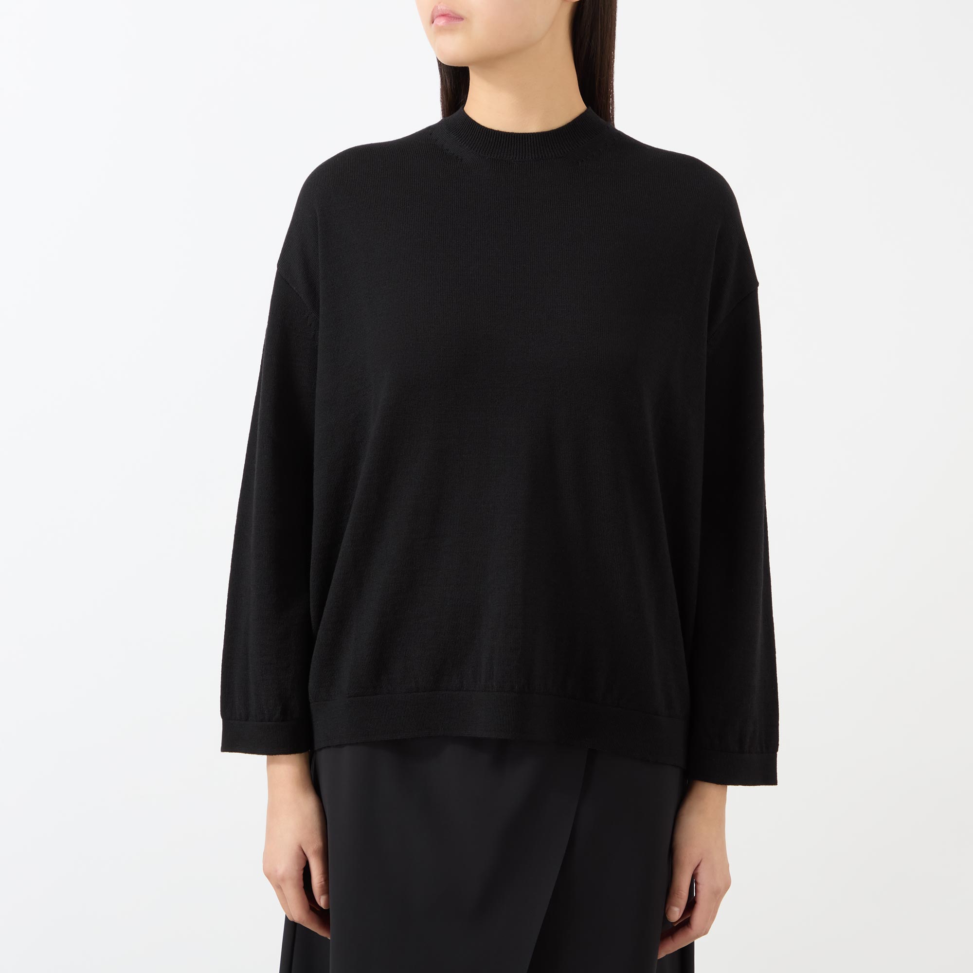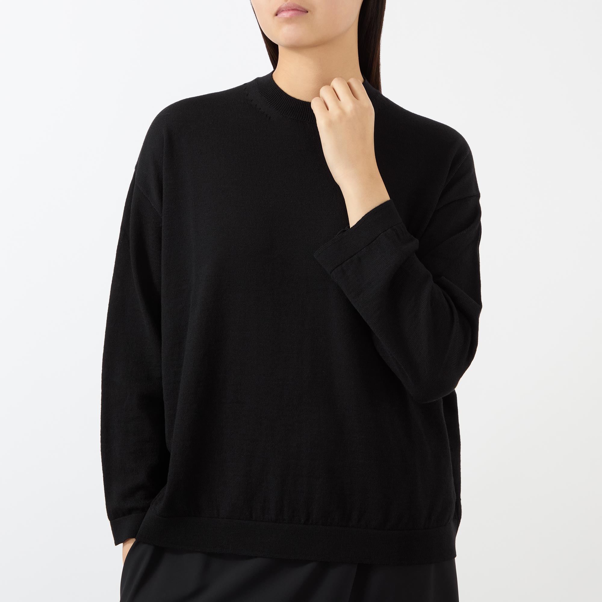 - Crew neck, dropped shoulders, bracelet length sleeves, straight hem, ribbed trims, fine knit construction, soft finish