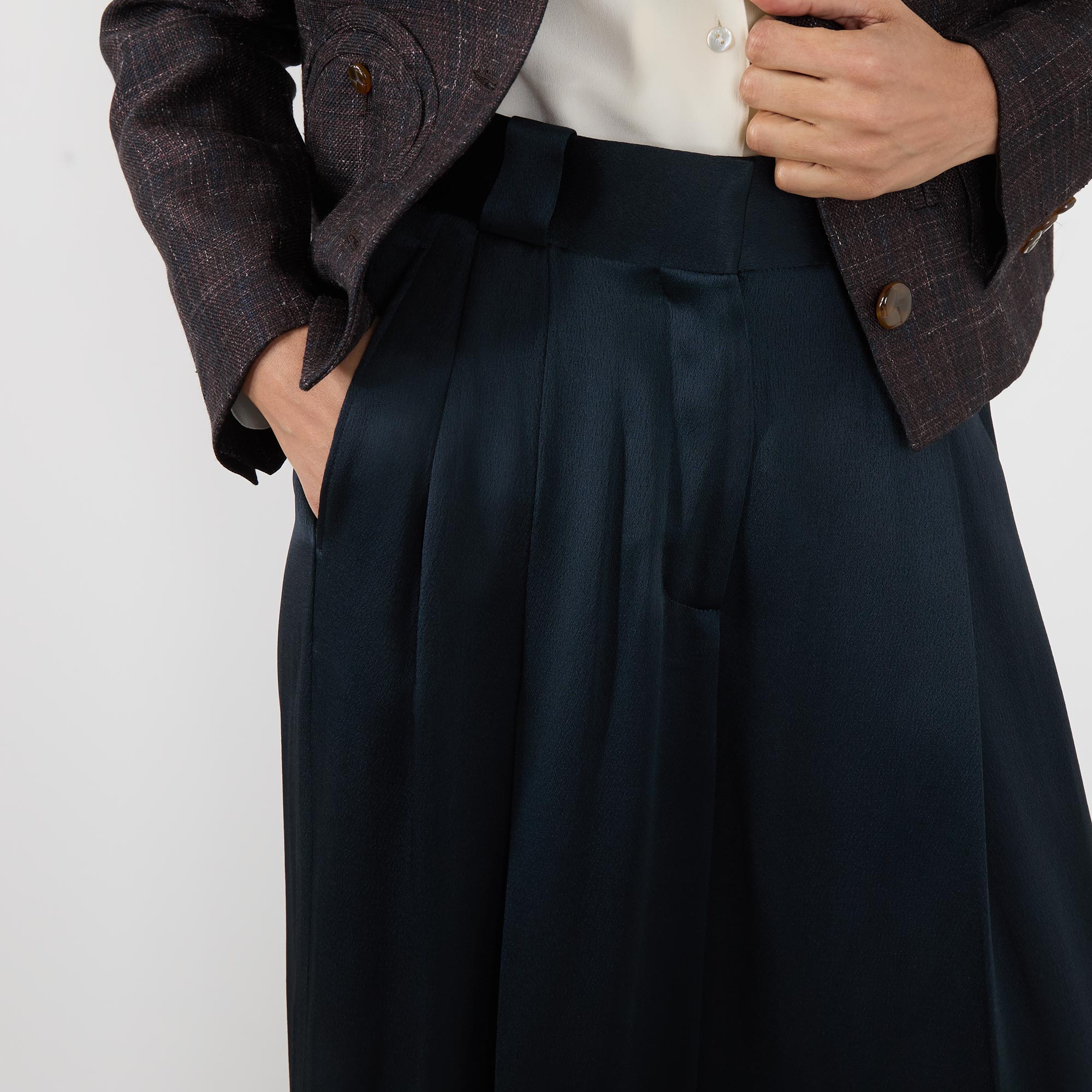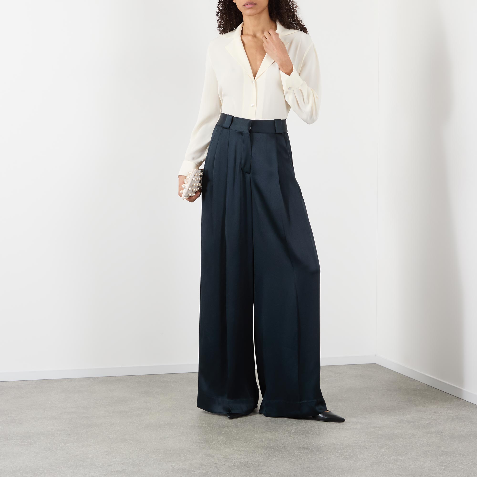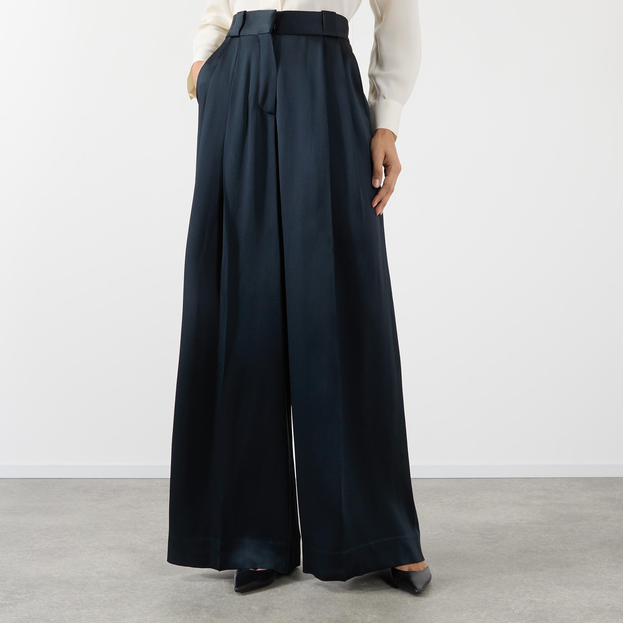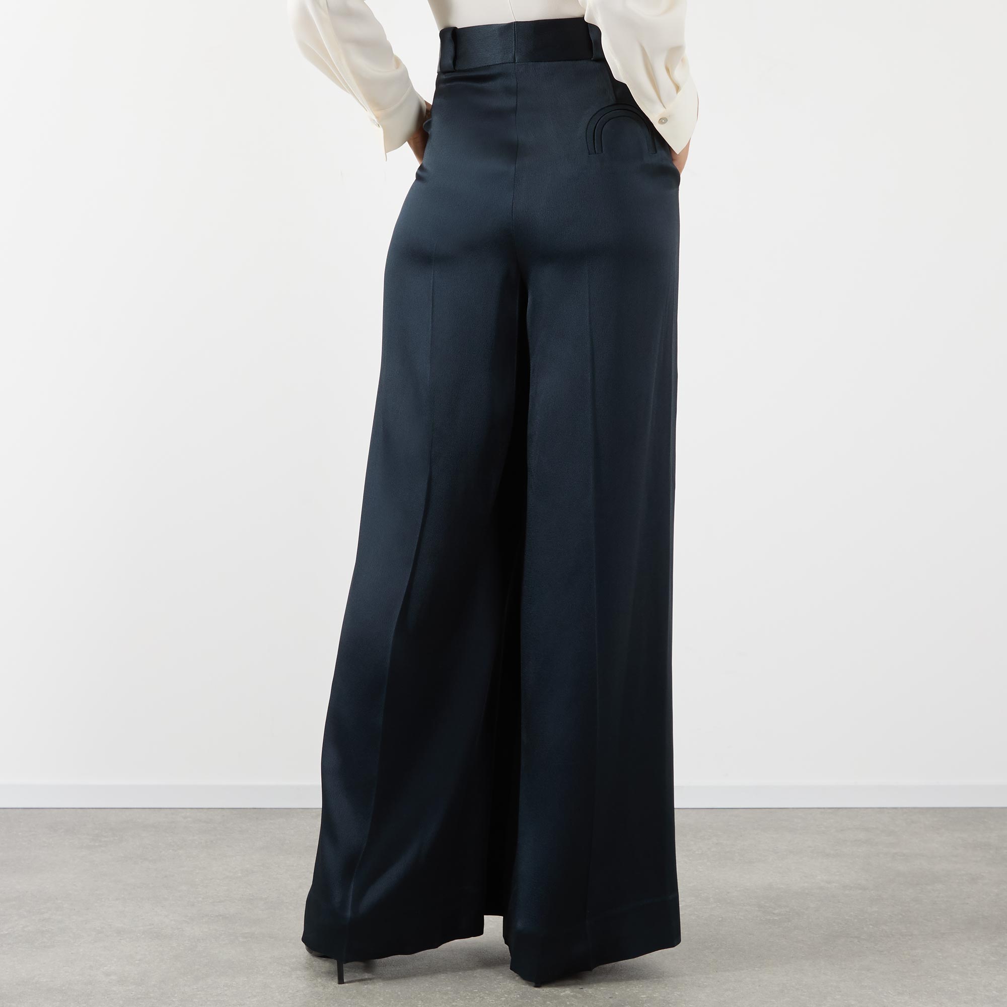 - High rise, wide leg, palazzo silhouette, belt loops, concealed fly with hook and bar fastening, front pleats, two side in seam pockets, one rear decorative smiley pocket, clean hems, pressed creases, satin finish