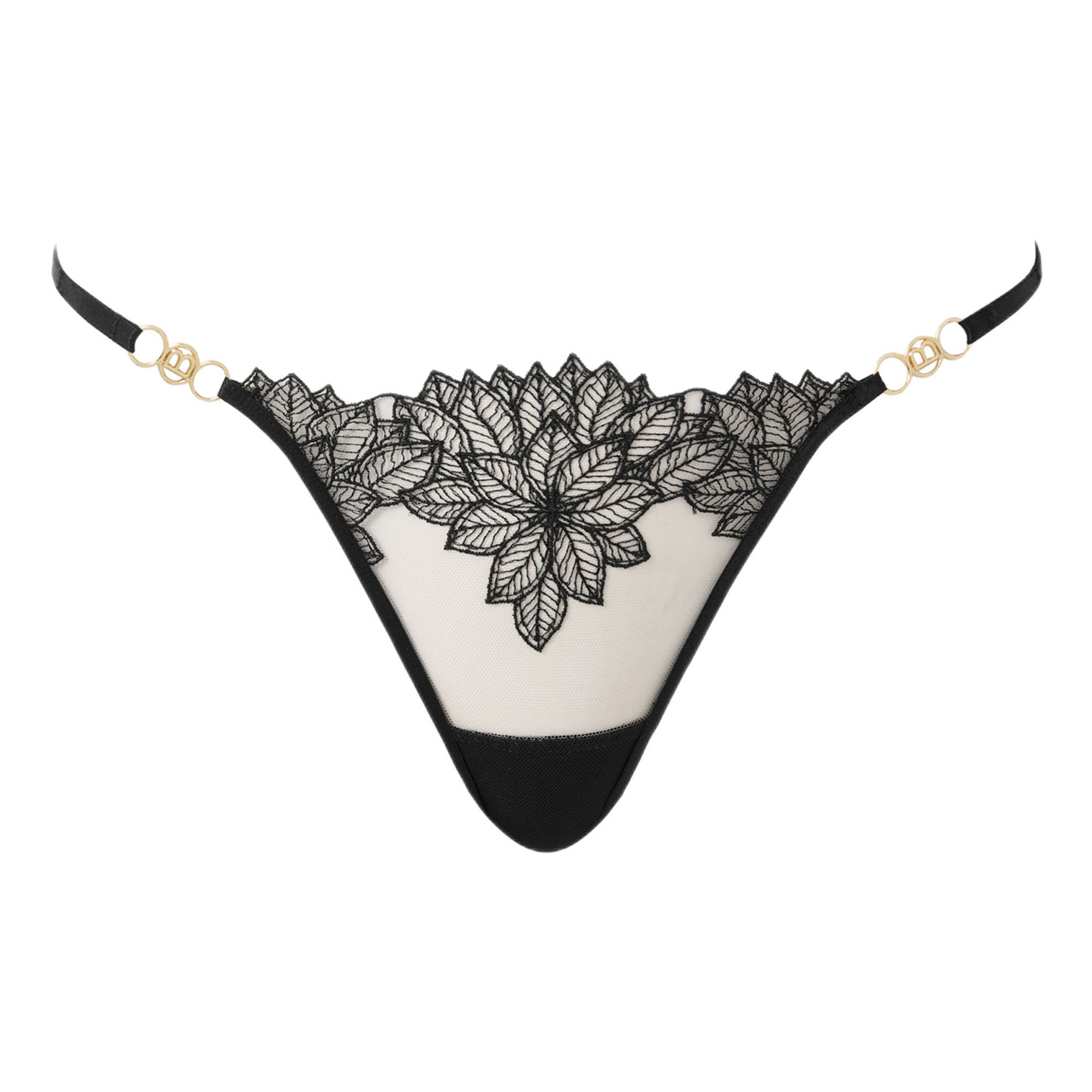 - Sheer mesh, floral lace embroidery, side wings, signature hardware, hypoallergenic bamboo gusset