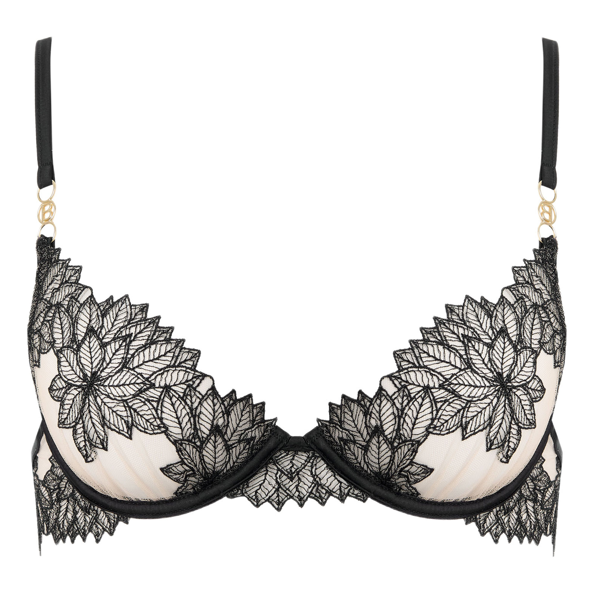 - Overlapping floral lace embroidery, conceal and reveal effect, underwired, adjustable shoulder straps, rear hook-and-eye fastening