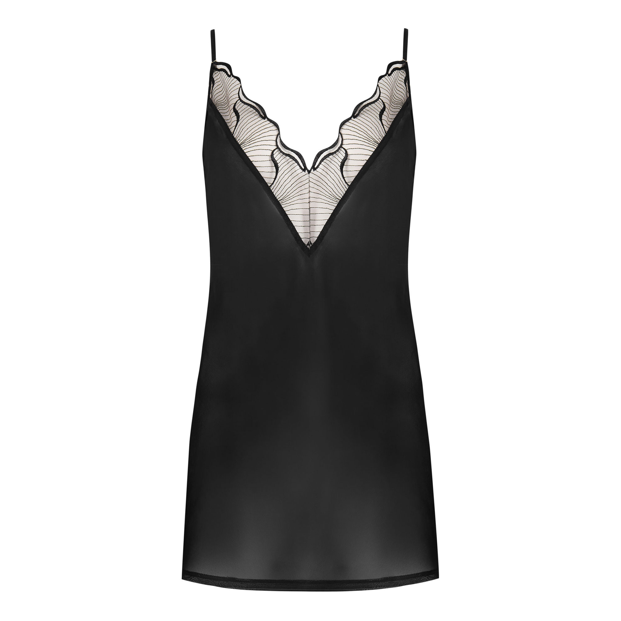 - Sheer chiffon fabric, fluid embroidery on plunge chest, reimagined bestselling design, luxurious modern loungewear