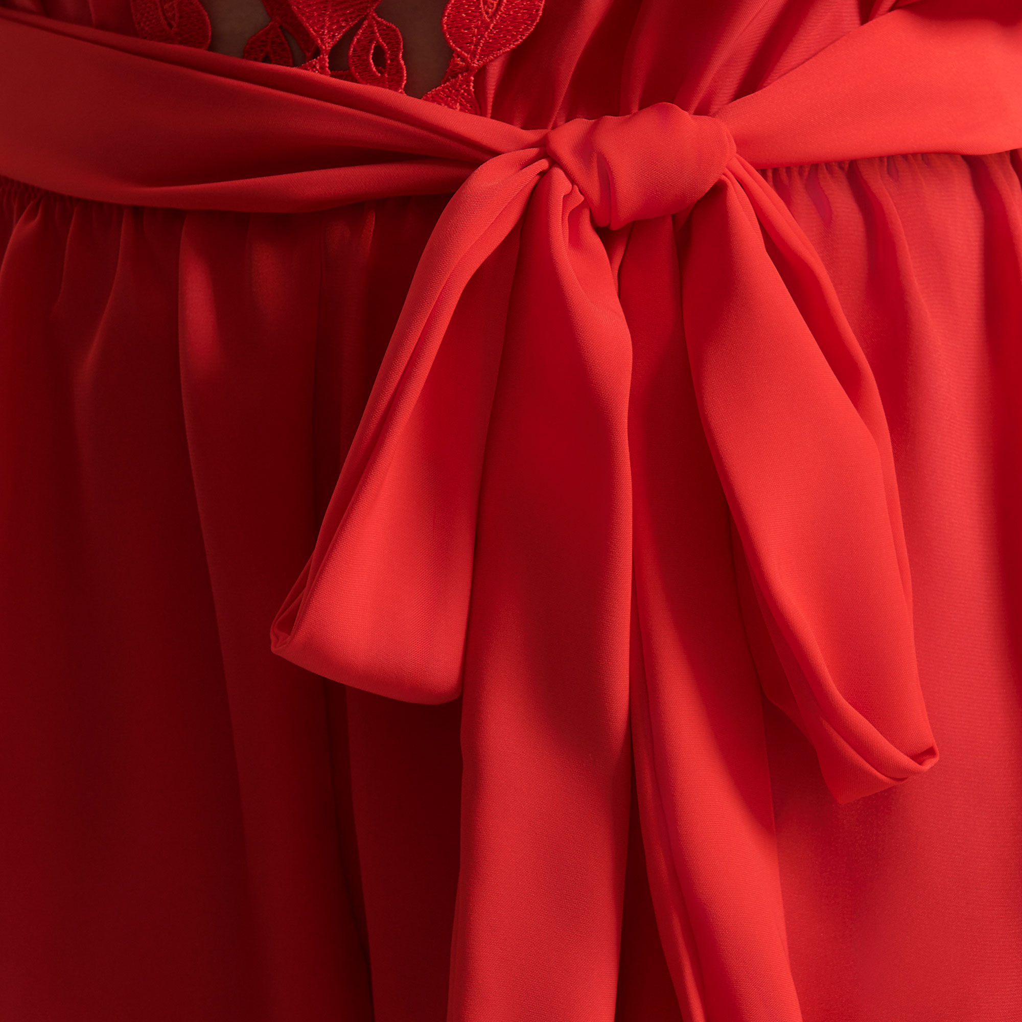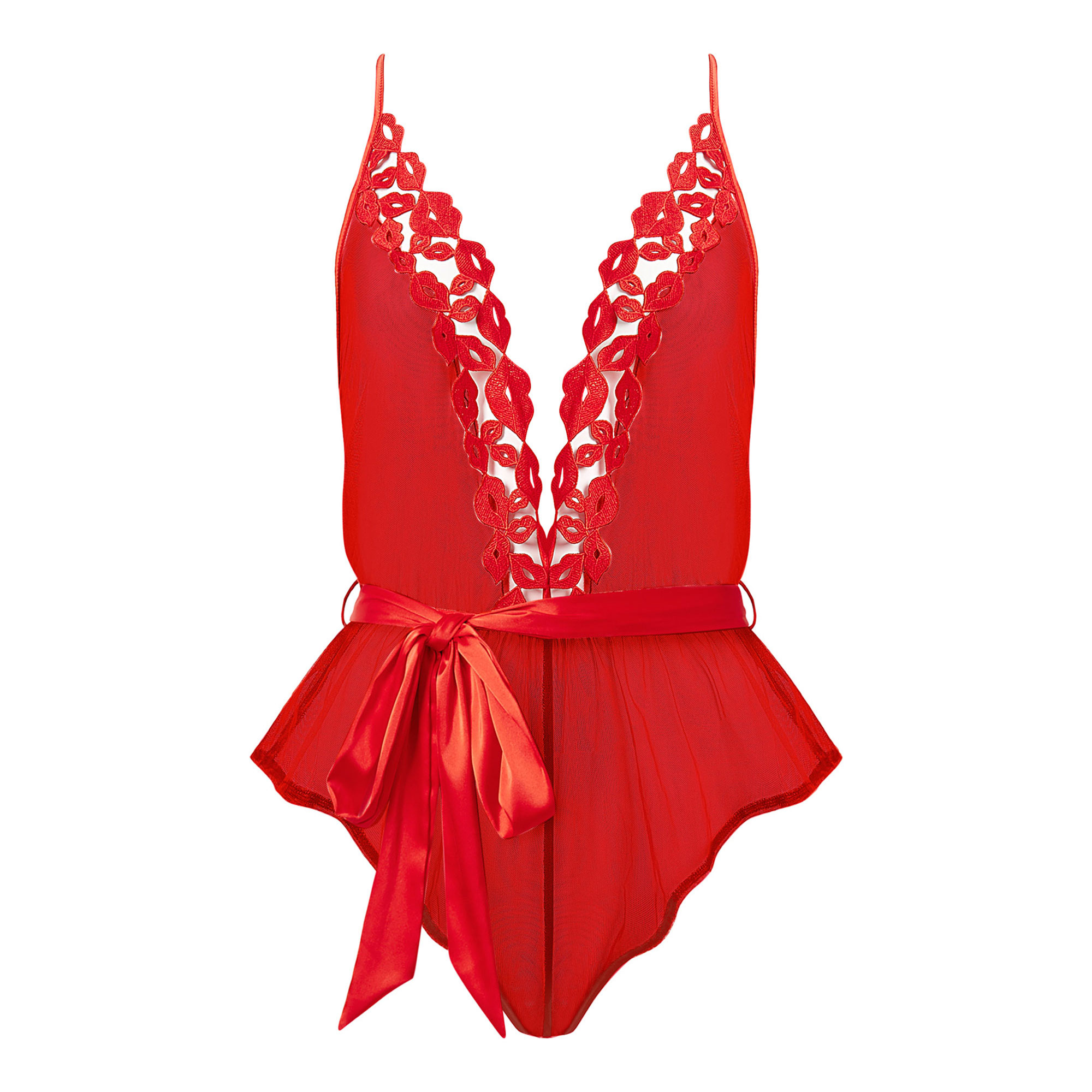• Sheer chiffon fabric, red lip embroidery on plunge chest, satin tie-belt, cross-back adjustable straps, high-rise thigh cuts