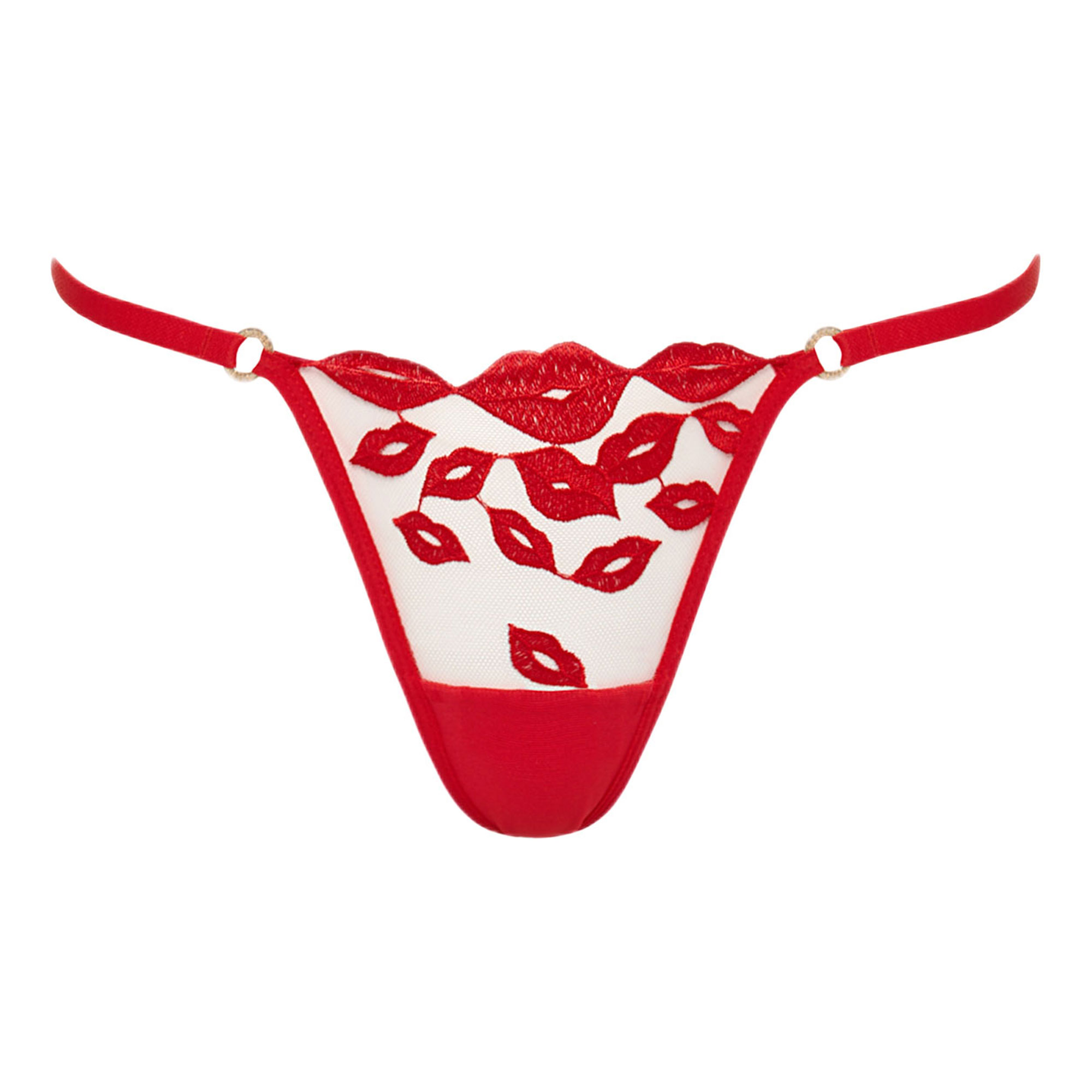 - Sheer mesh, red lip embroidery, G-string design, branded hardware, bamboo gusset