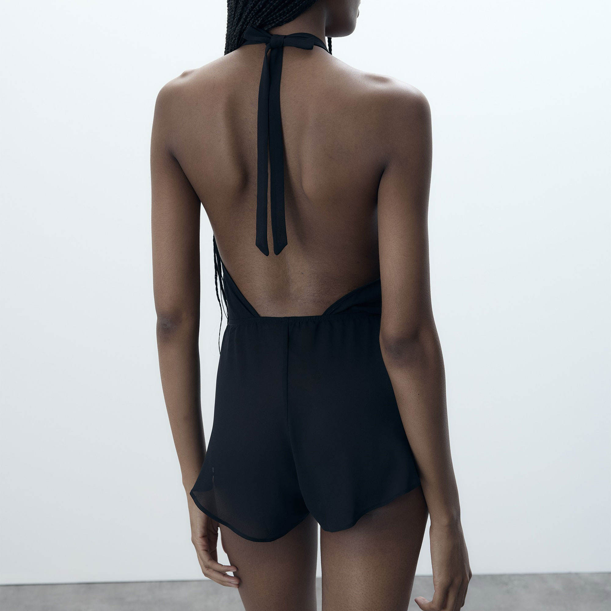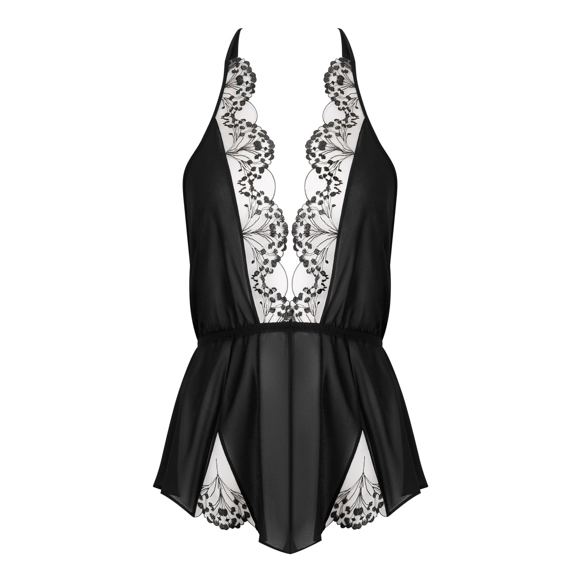 - Sheer fabric, semi-opaque crepe georgette, sheer mesh embroidery on chest and shorts, elasticated waist, halterneck tie, flattering hourglass shape
