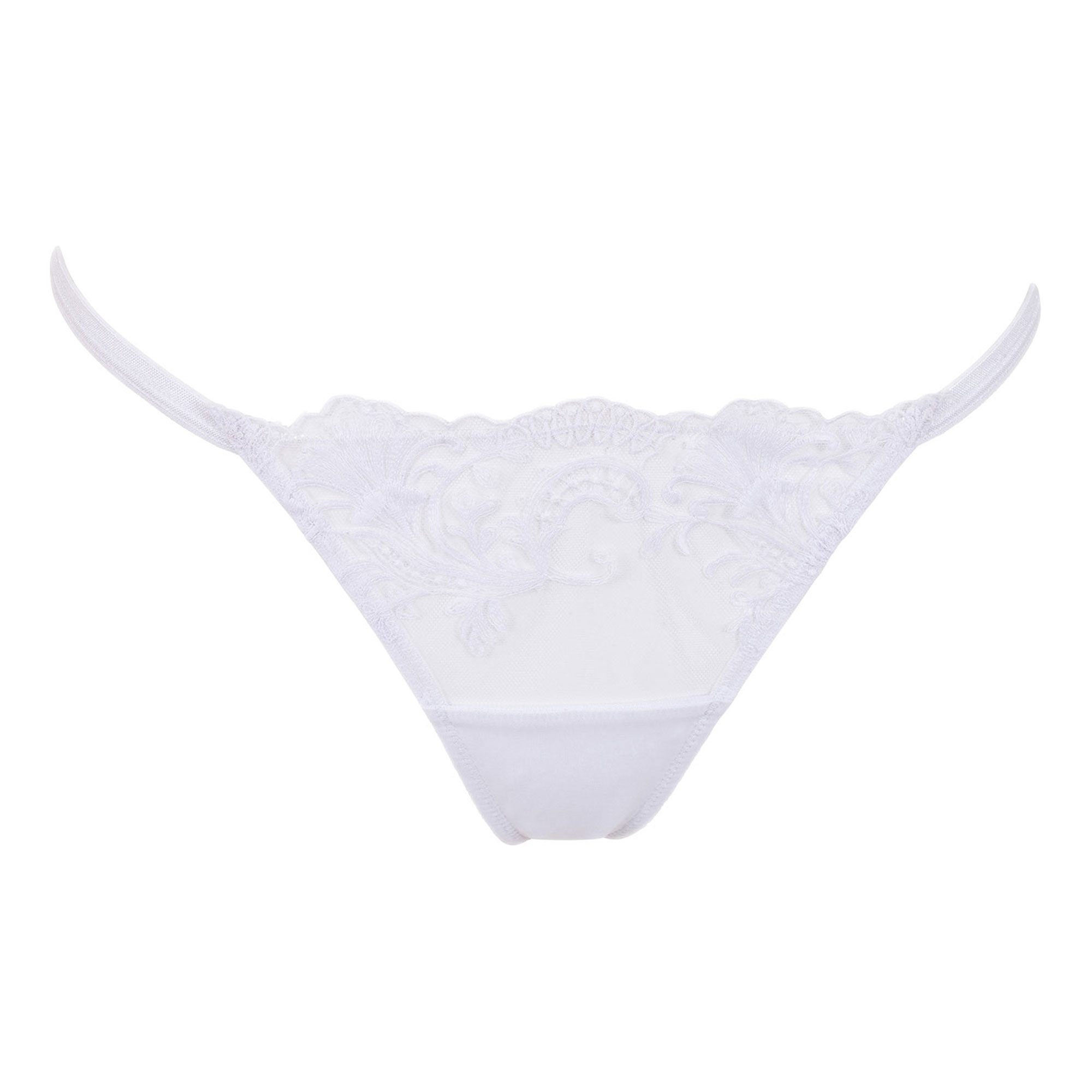 A reliable thong to complement Bluebella's best-selling line, the Marseille is updated in pearly white, adding an ethereal layer to a Bluebella staple. Fitted with slim bands that frame the delicate floral lace and intricate embroidery, this daring option is impactful enough solo.