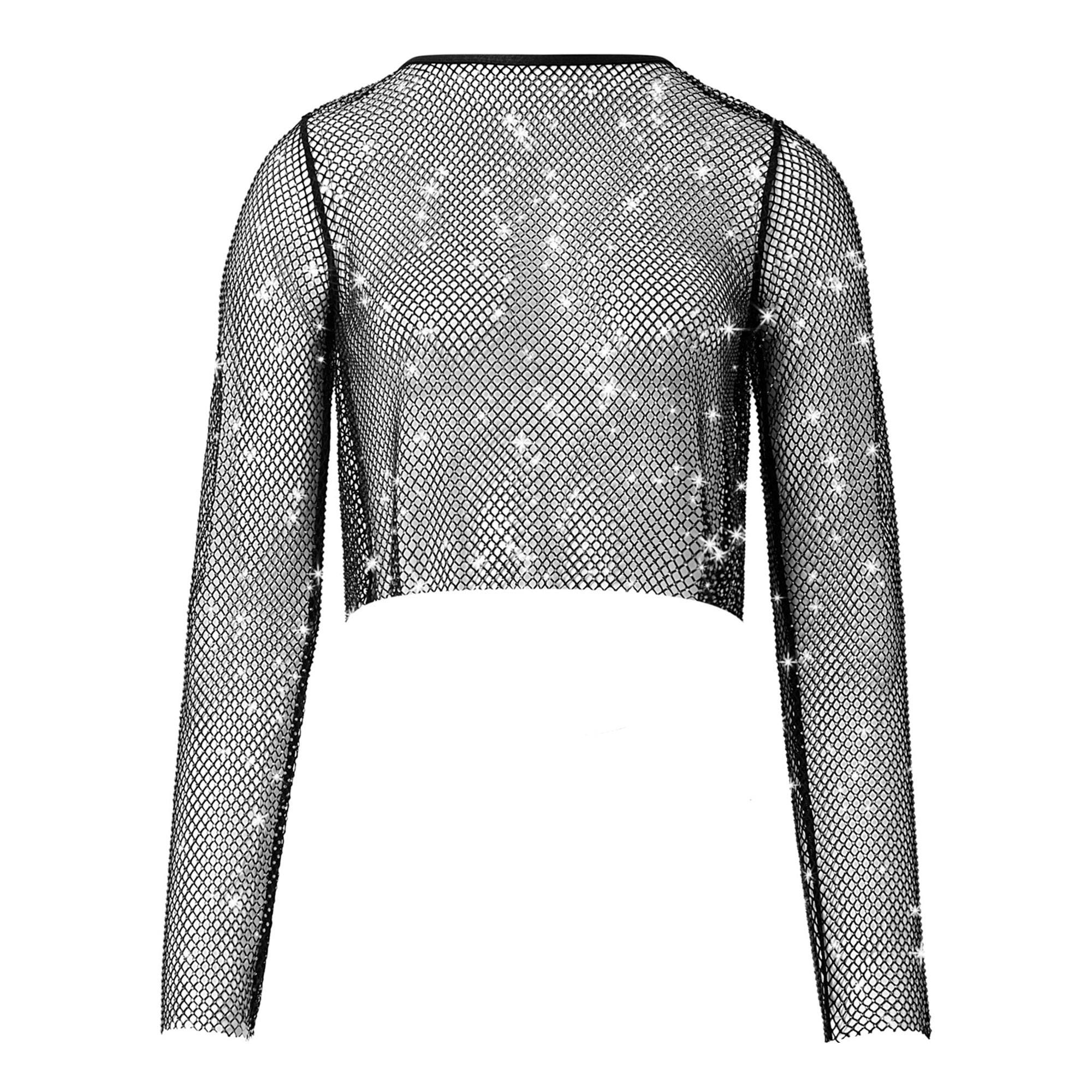 - Sheer mesh top, fishnet mesh fabric, rhinestone embellishments, long sleeves, open back, bold transparent style