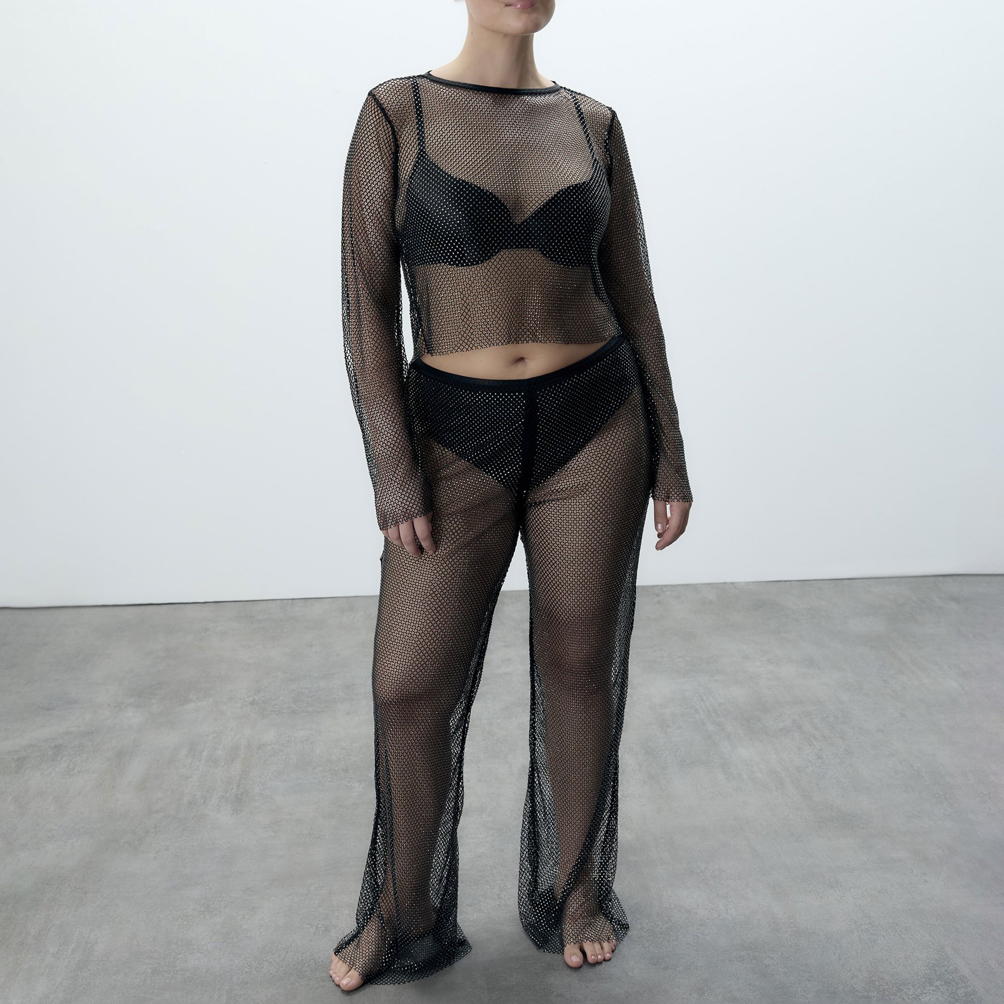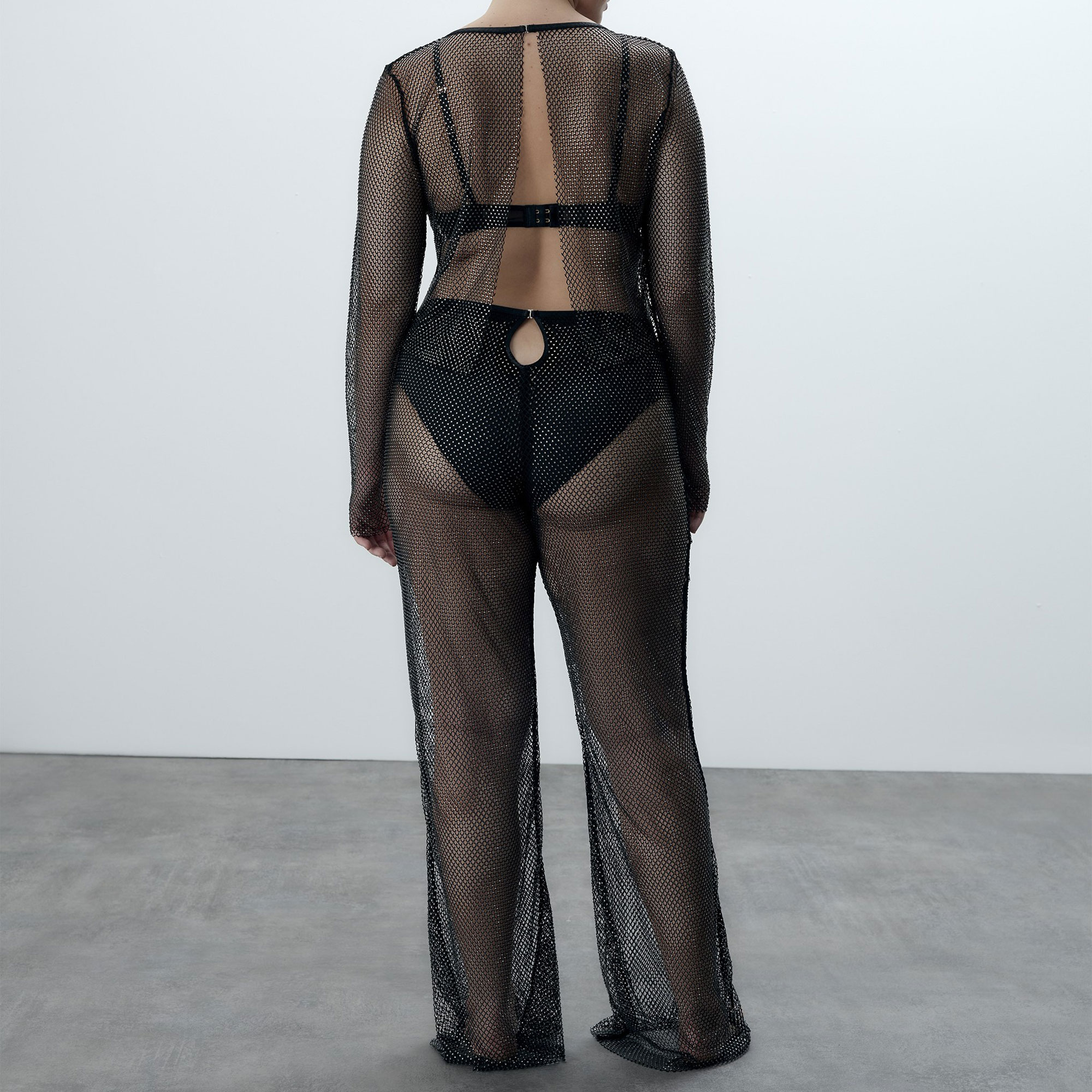 The Noor Sheer Mesh Top is a statement piece designed to shine. Crafted from expertly woven fishnet mesh, it’s adorned with rhinestone embellishments that catch the light from every angle. Featuring long sleeves and an open back, this transparent top brings bold elegance to evening styling. Perfect for party season, it layers effortlessly with lingerie or tailored pieces to complete the look.