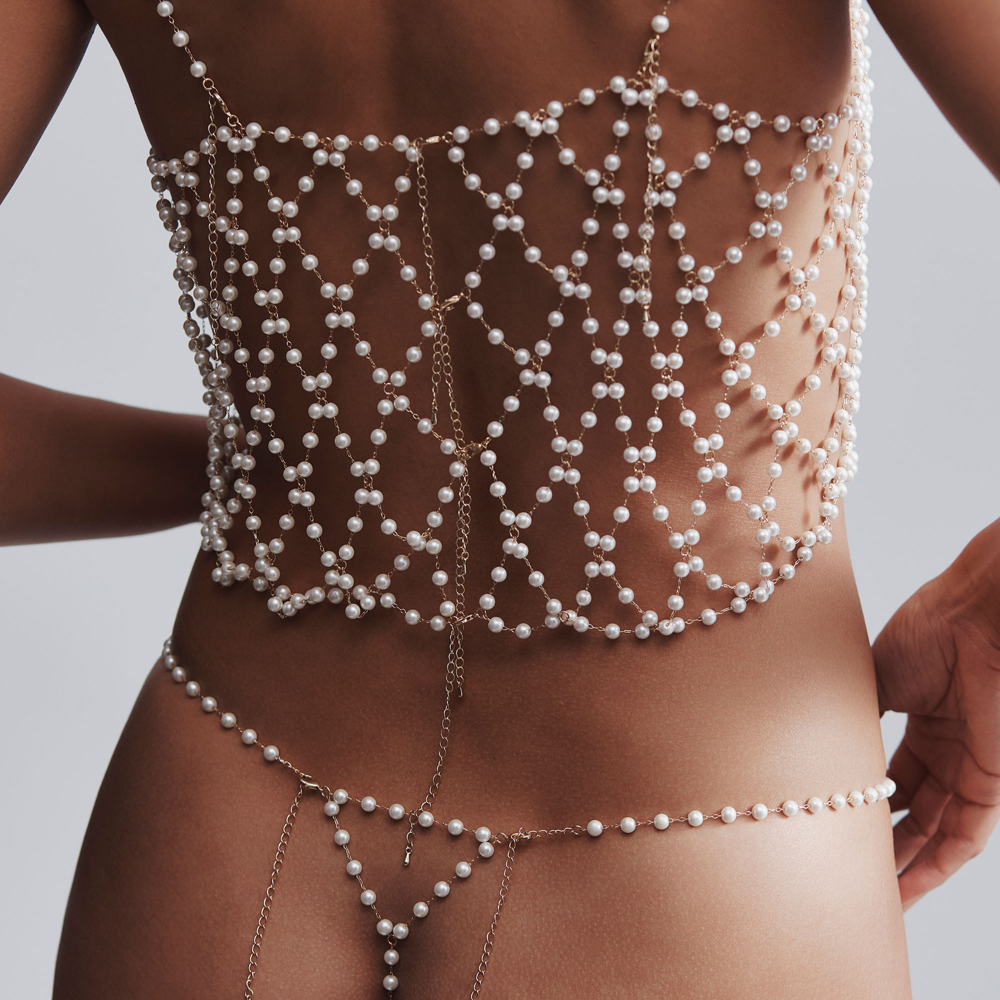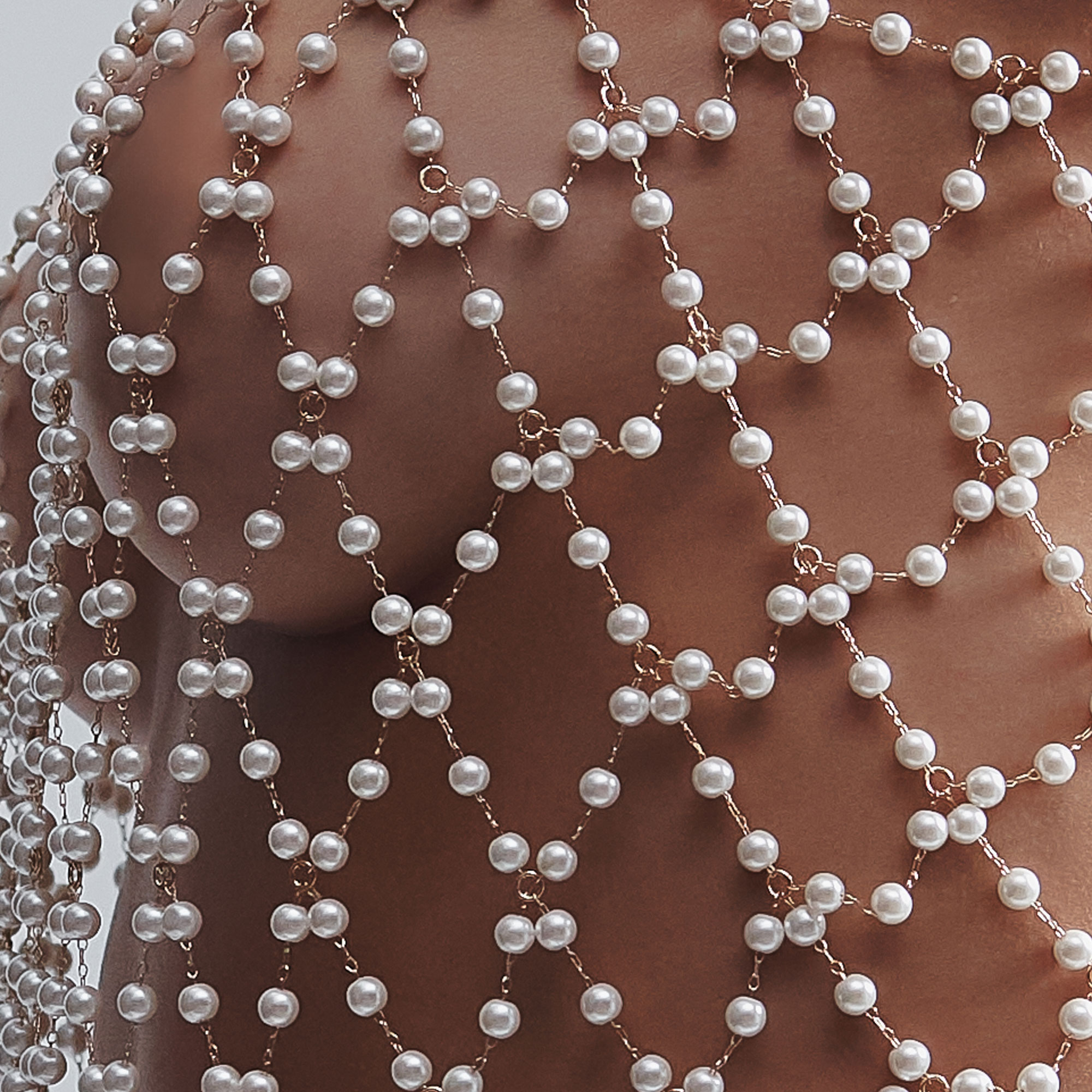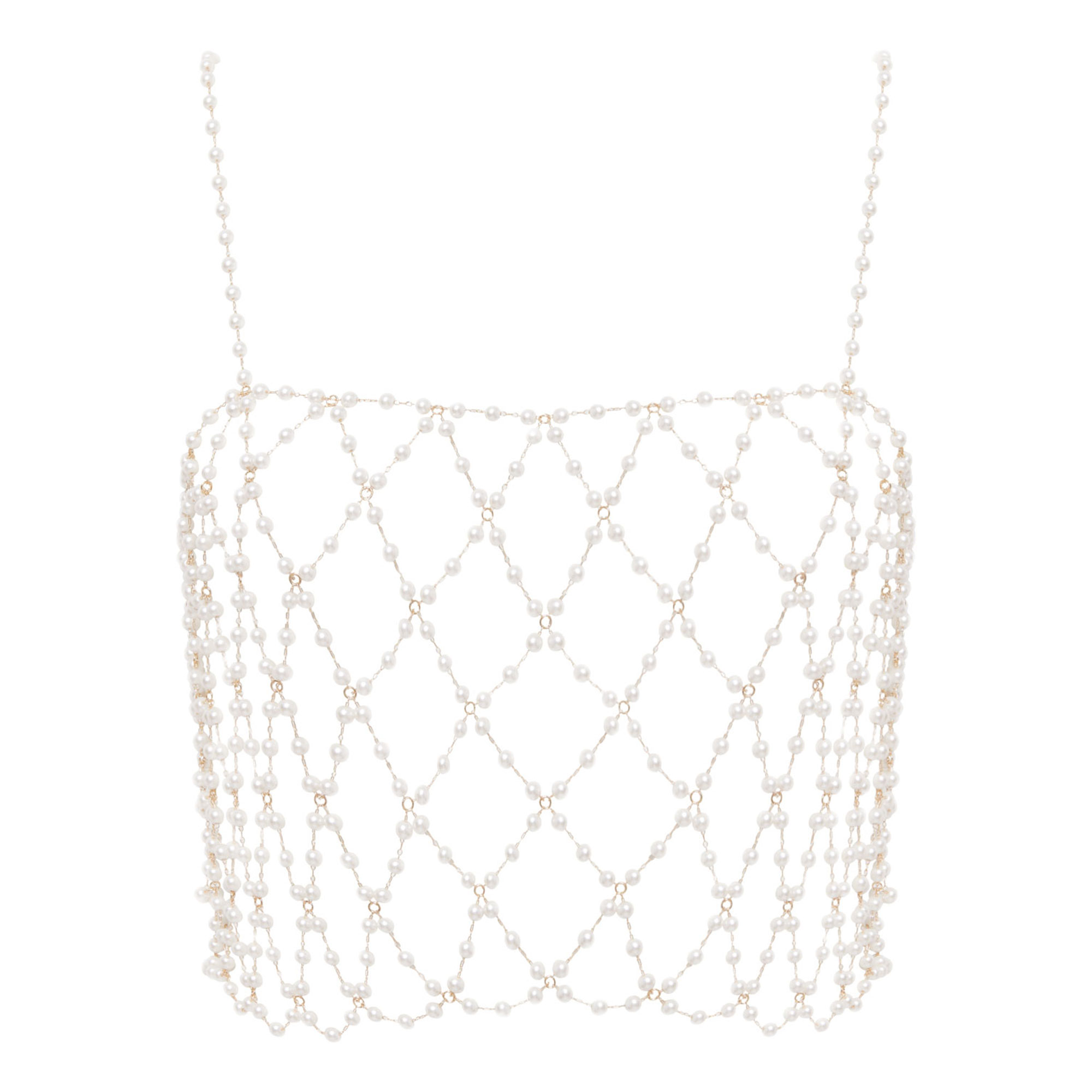 - Gold-tone lattice chains, pearlescent beads