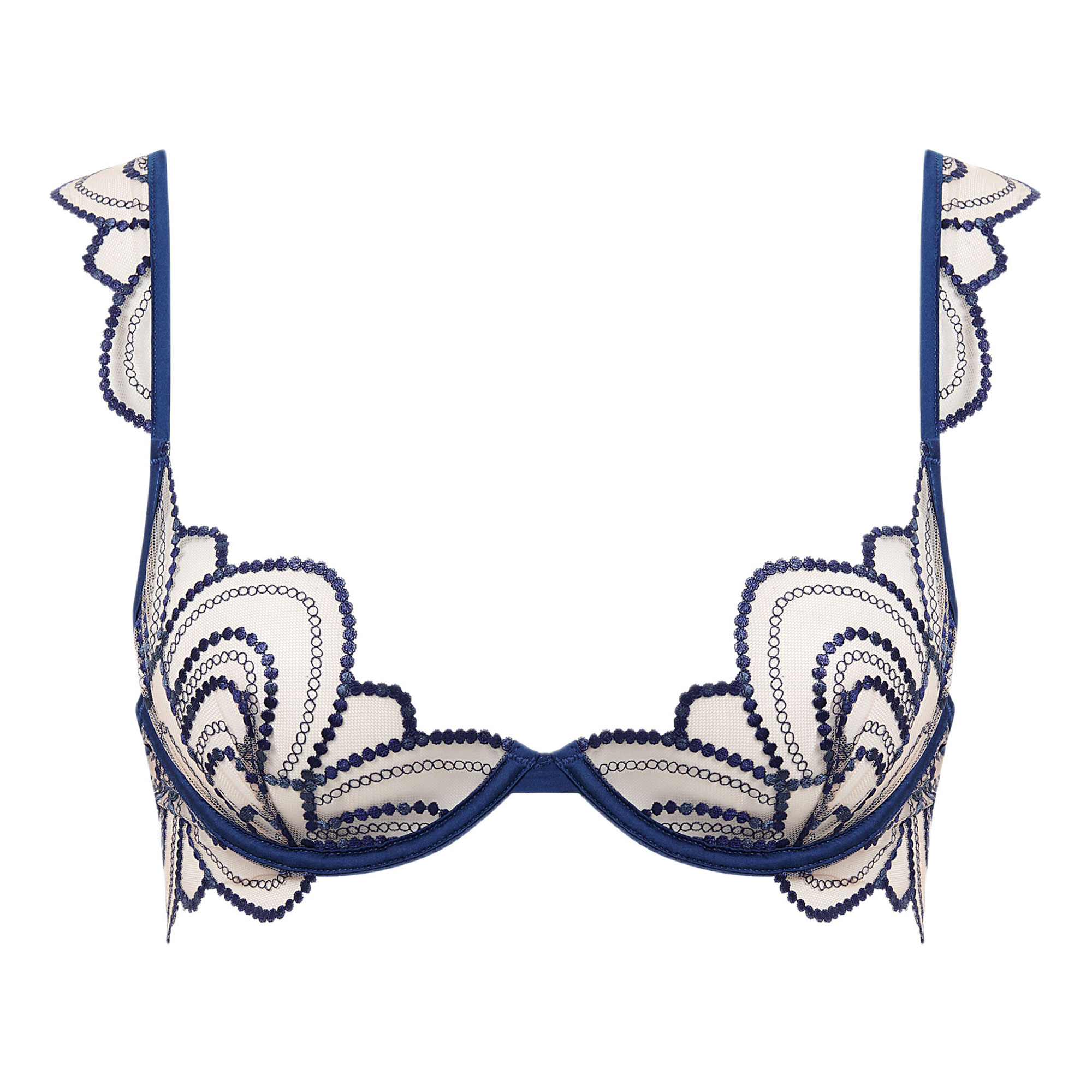 • Sheer mesh, striking circular geometric embroidery, subtle sheen finish, extended detailing along straps and under band, rear hook-and-eye fastening