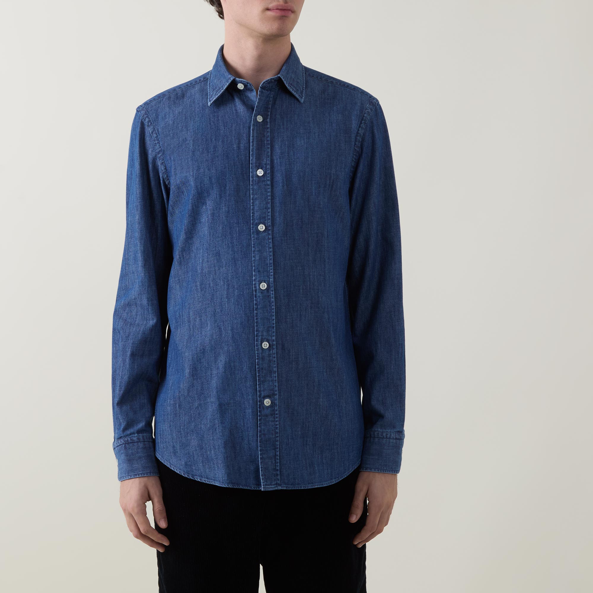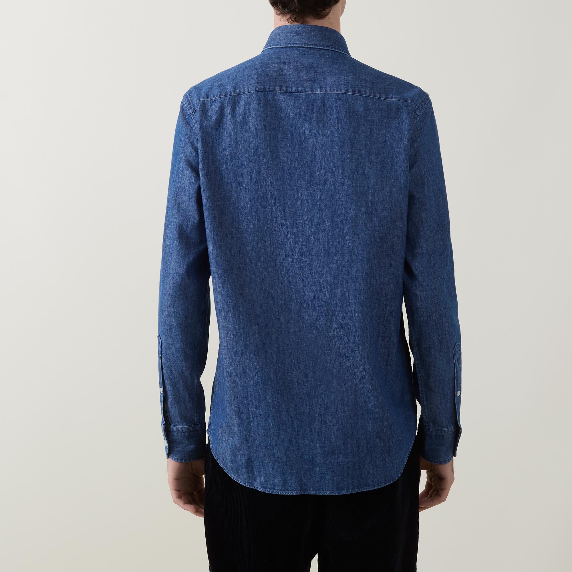 - Point collar, long sleeves, buttoned cuffs, front placket, curved hem, tonal stitching, mid wash finish