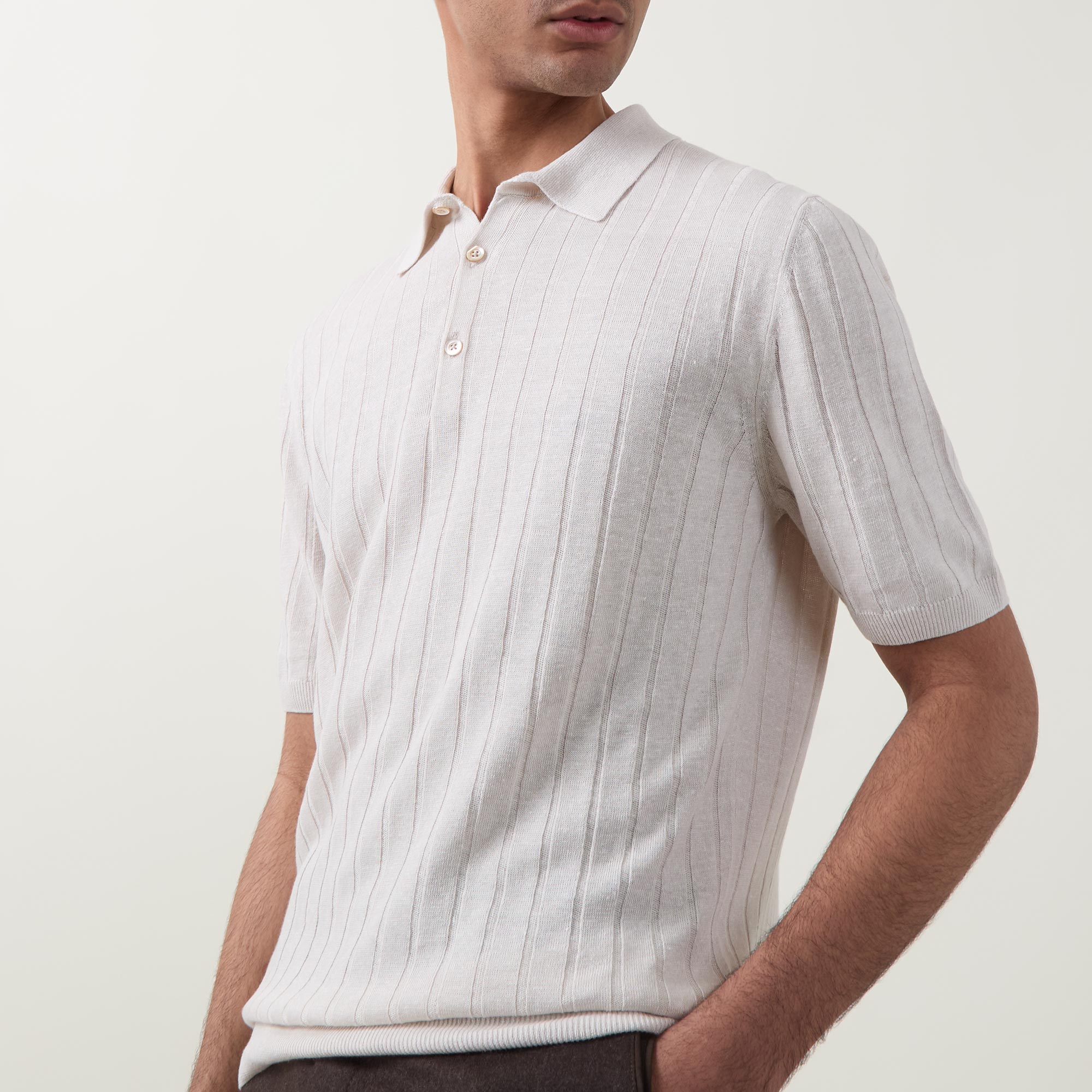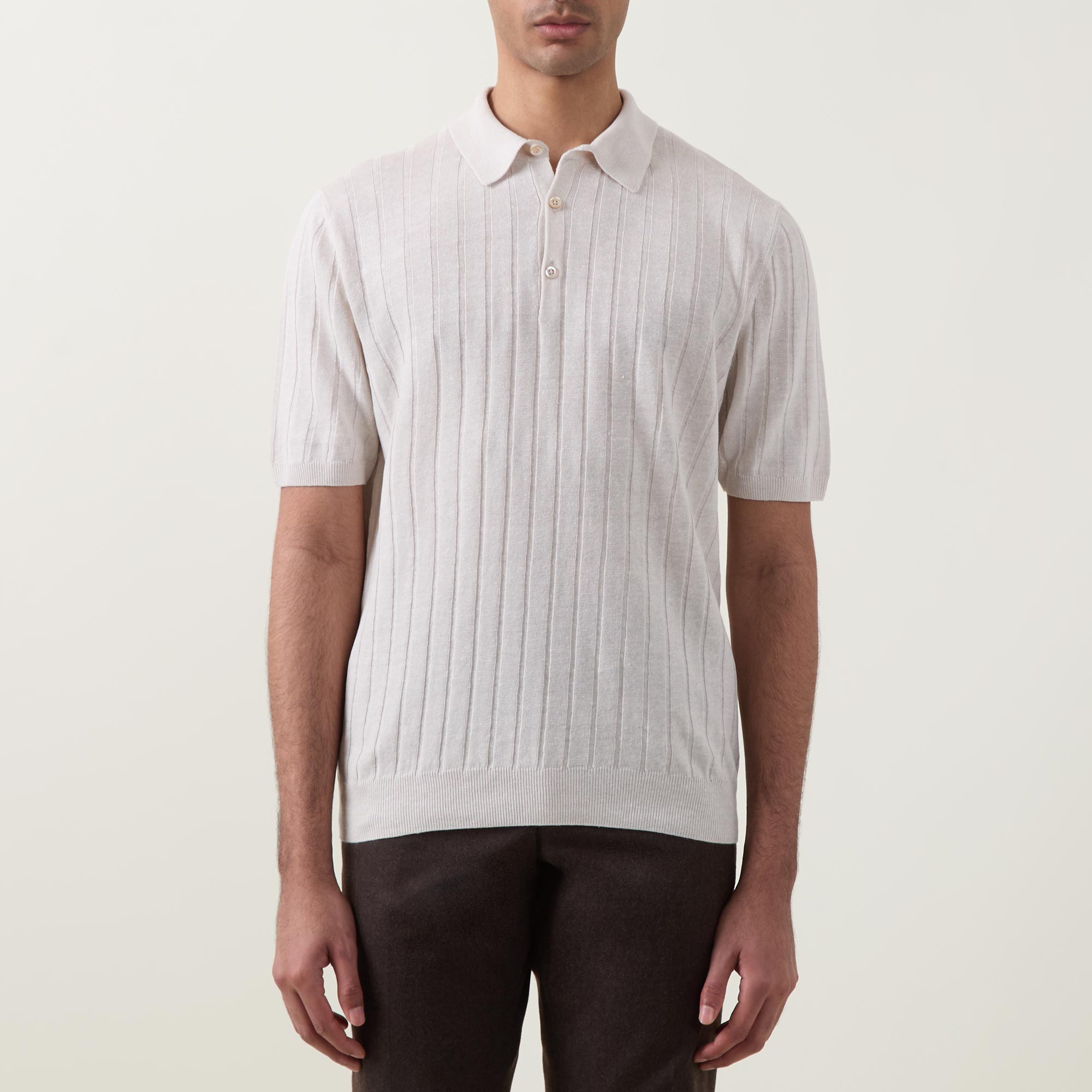 - Flat knit collar and cuffs, short sleeves, button fastening, rib knit structure, ribbed trims