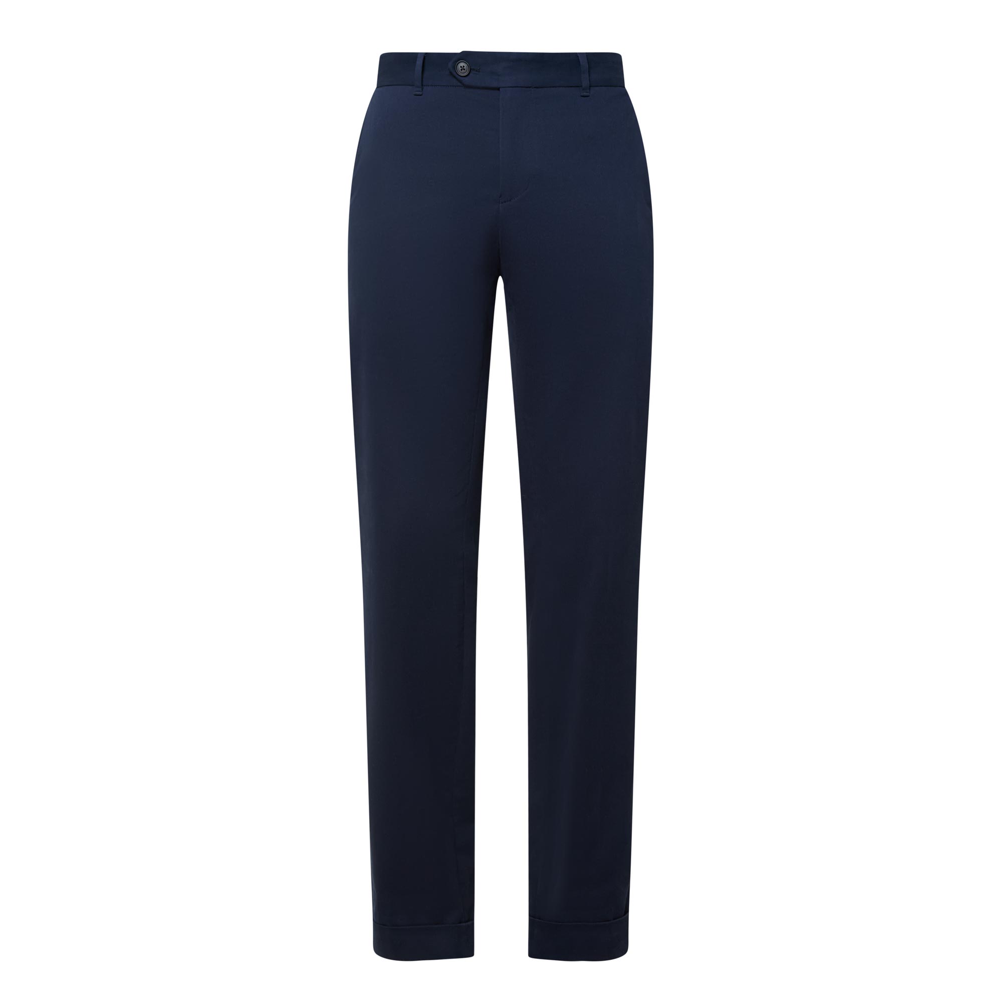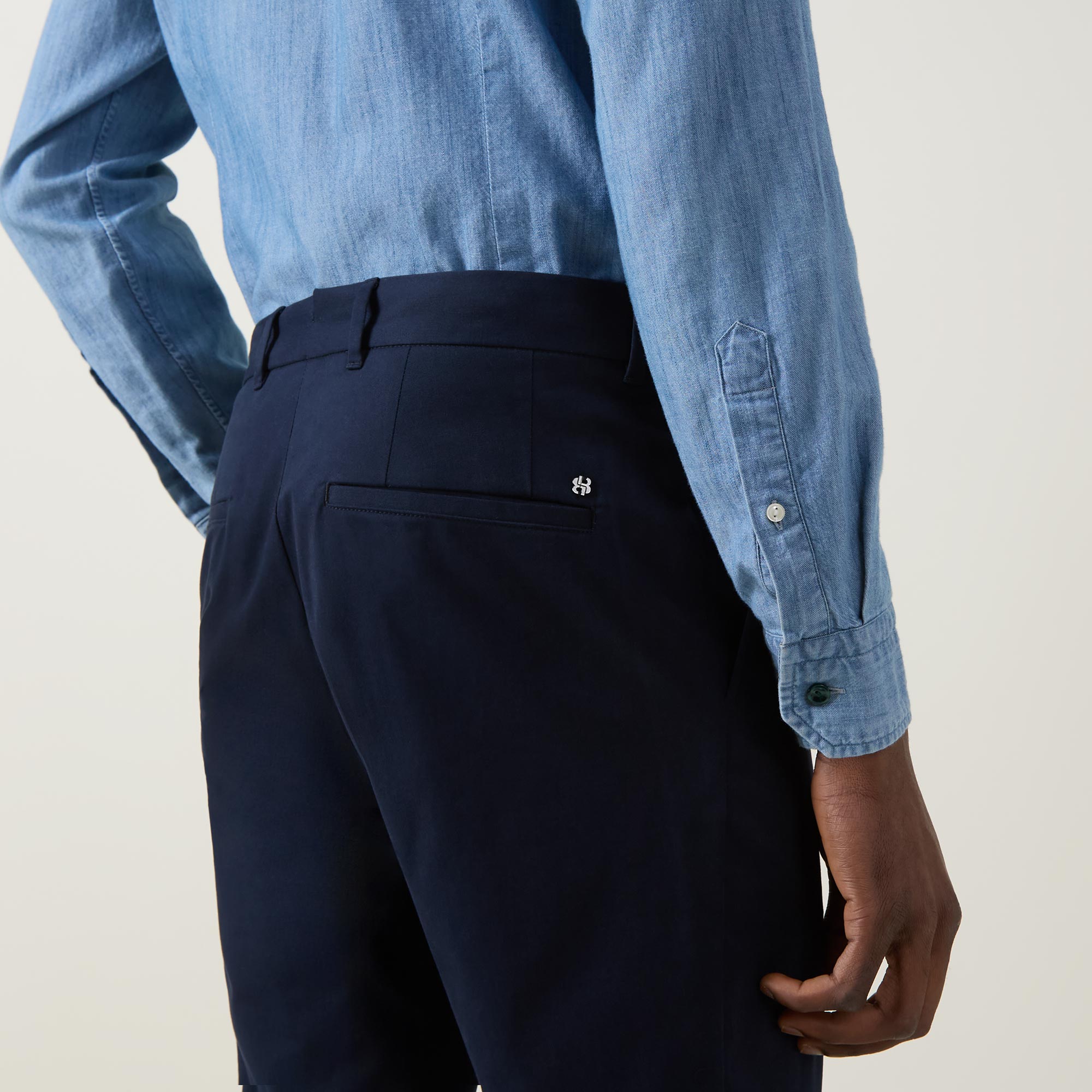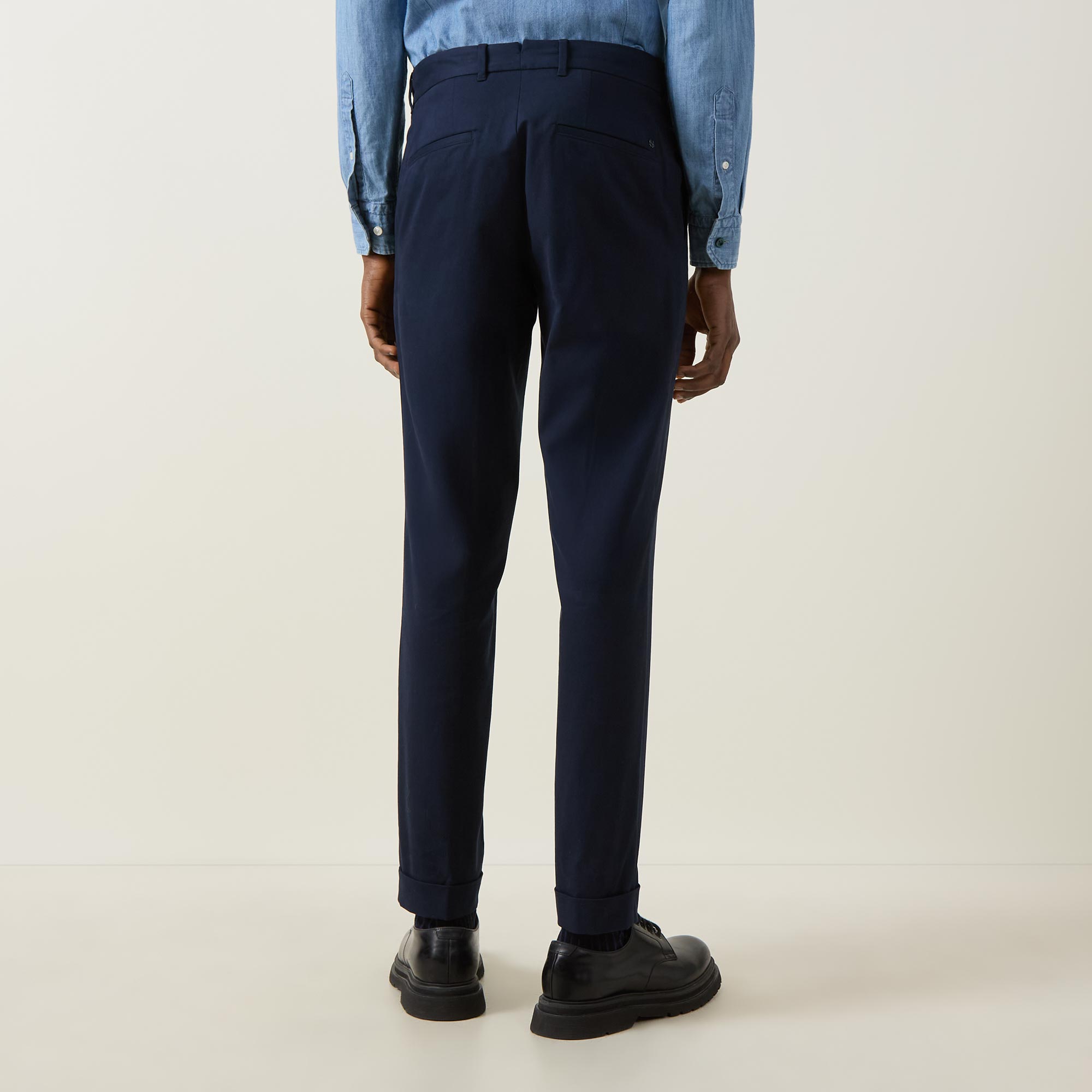 - Mid rise, slim leg, belt loops, concealed fly and button fastening, two slant pockets, two rear jetted pockets, clean turn-up hems, logo detail, tonal stitching, pressed creases, smooth finish