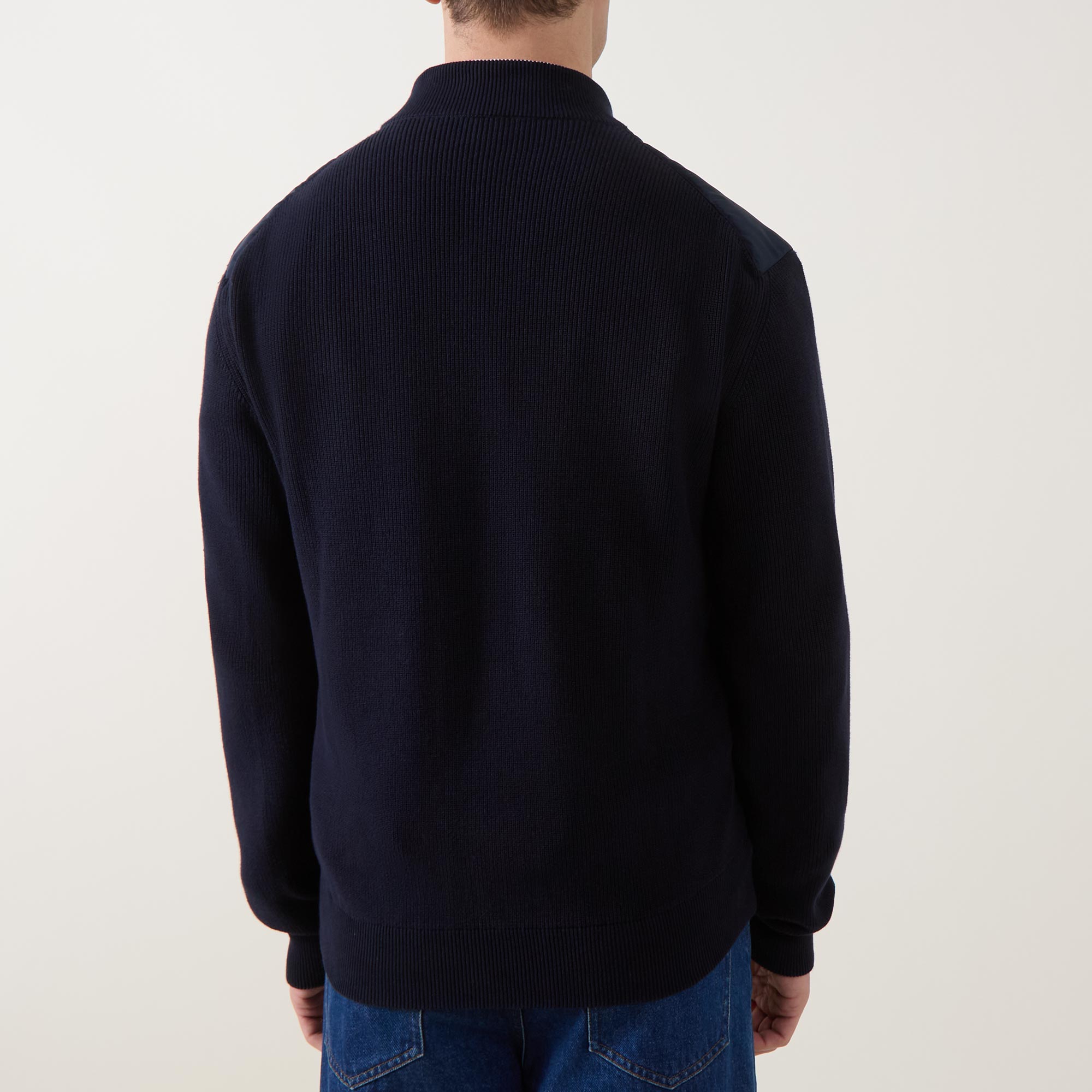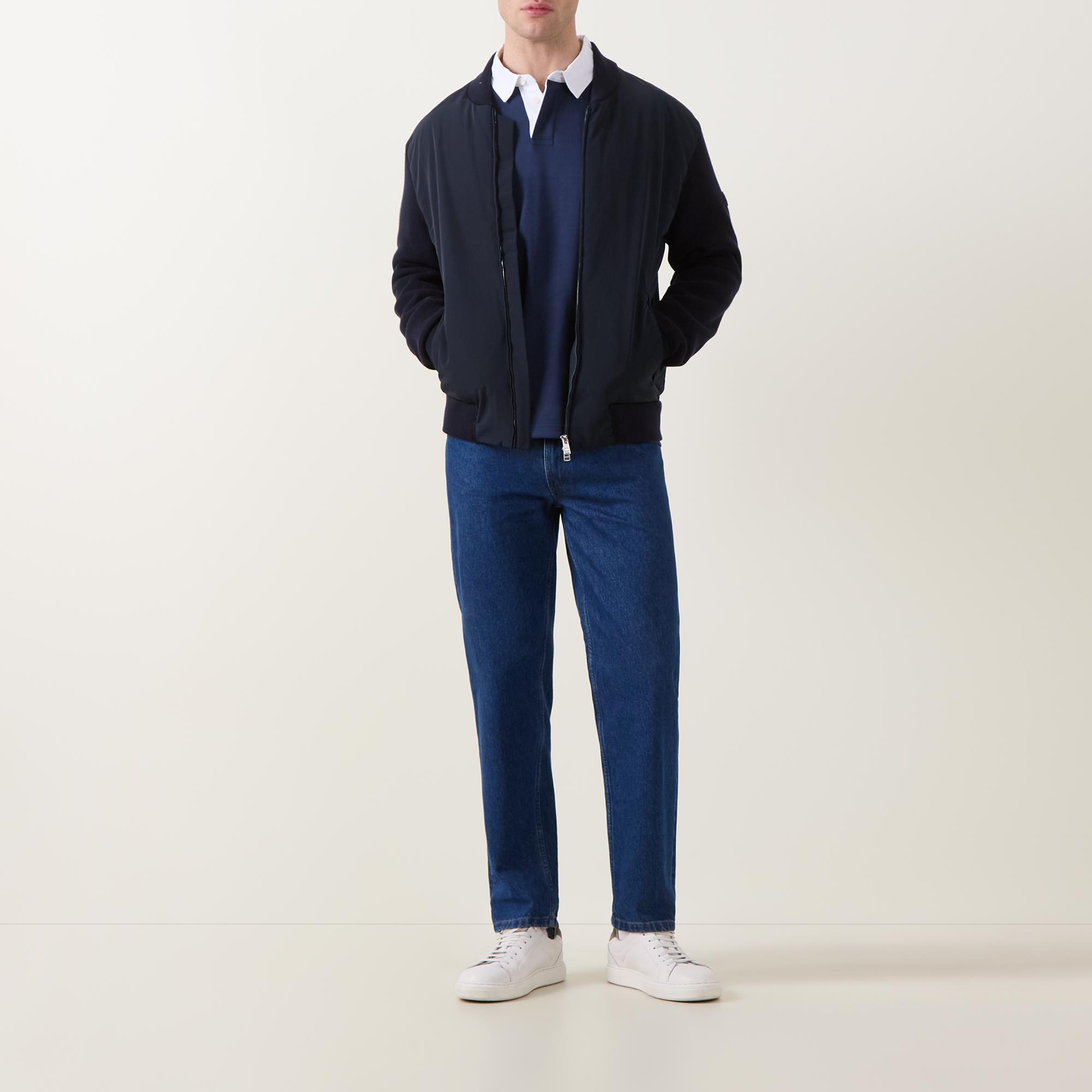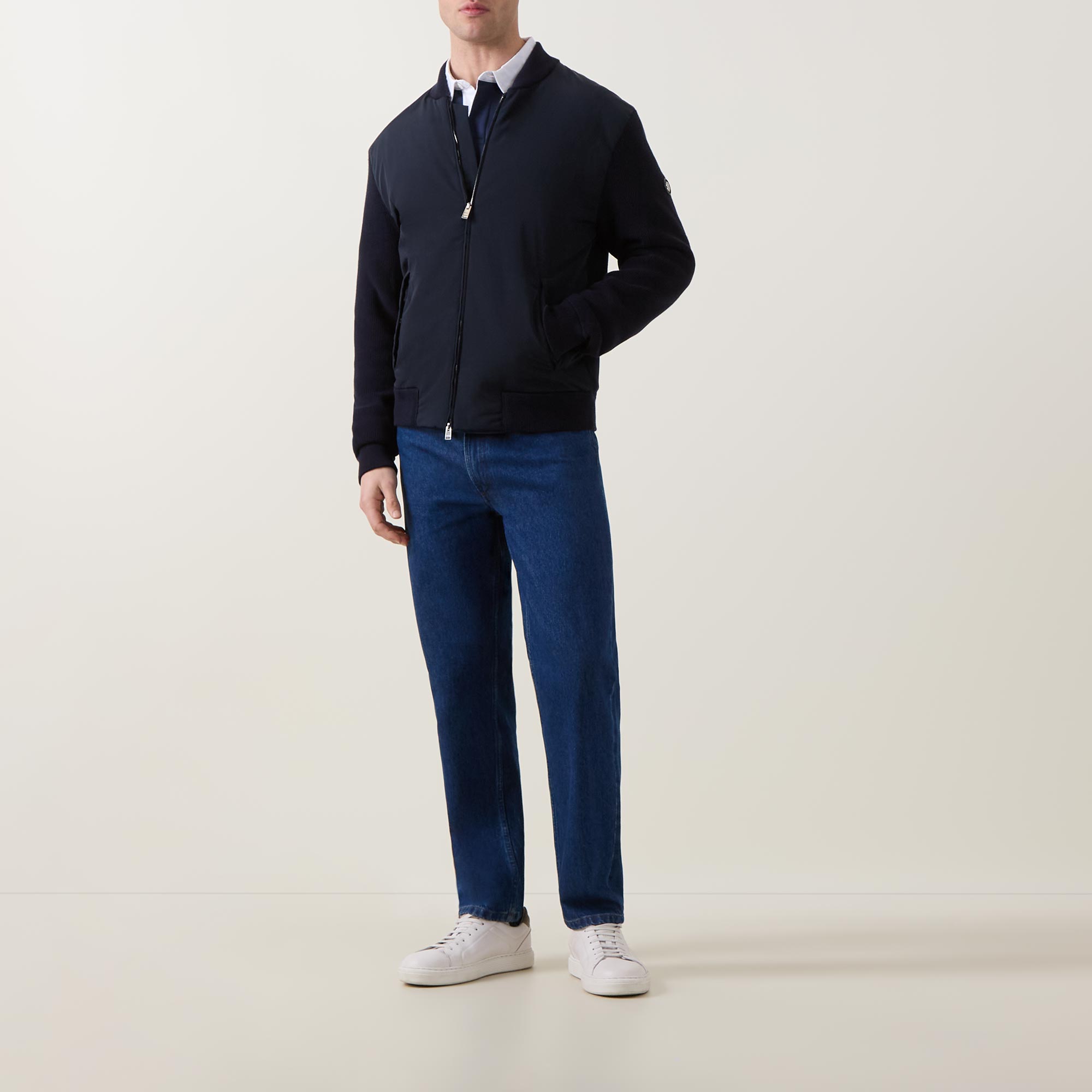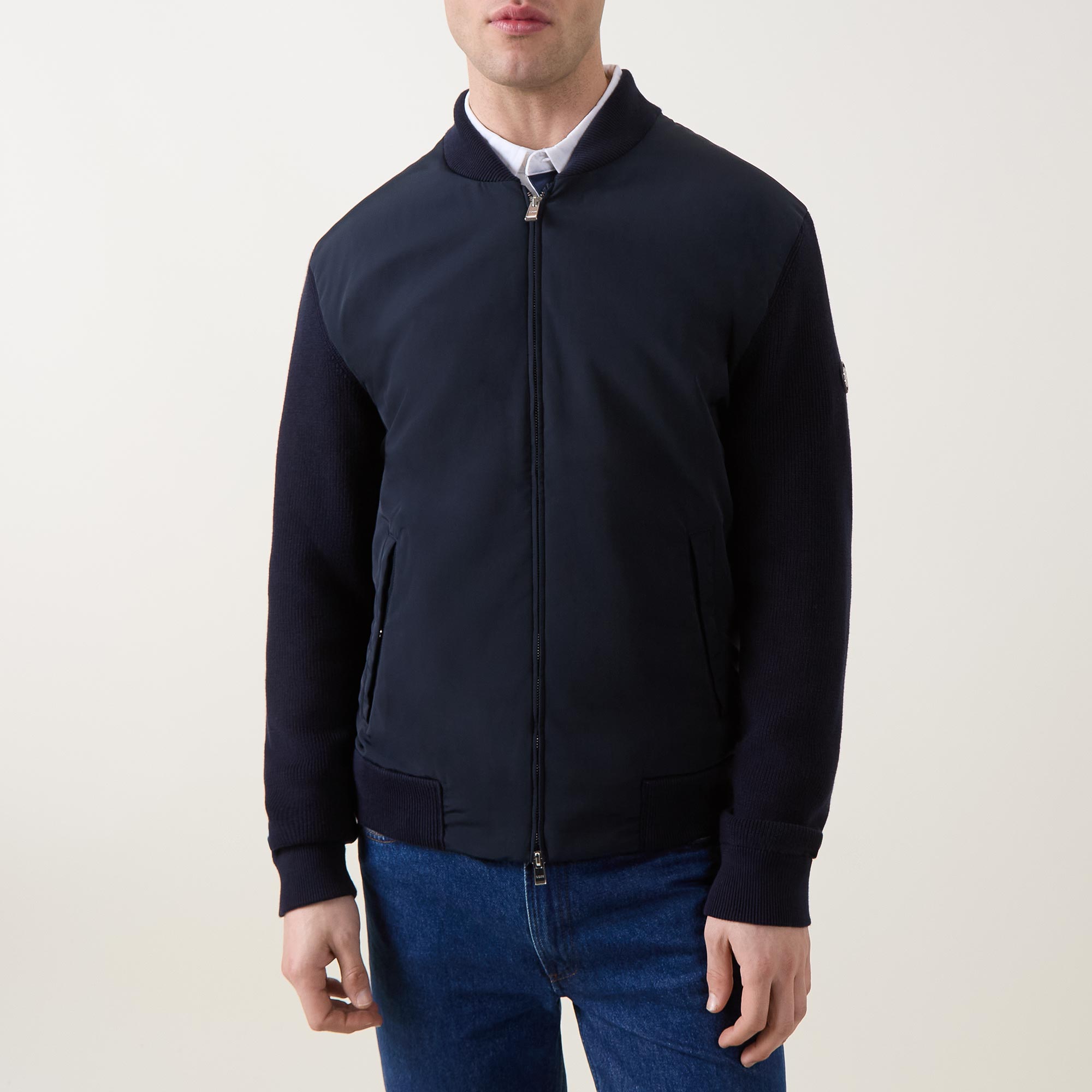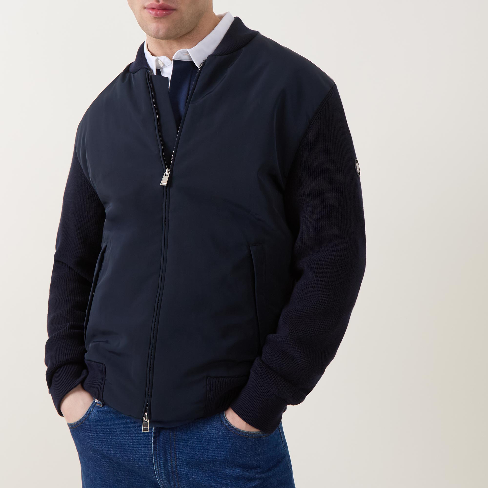 - Hybrid design with soft knit sleeves and back, padded front, bomber collar, long sleeves, full zip-through fastening, two side zip-fastening pockets, logo badge on left sleeve, stretch cuffs