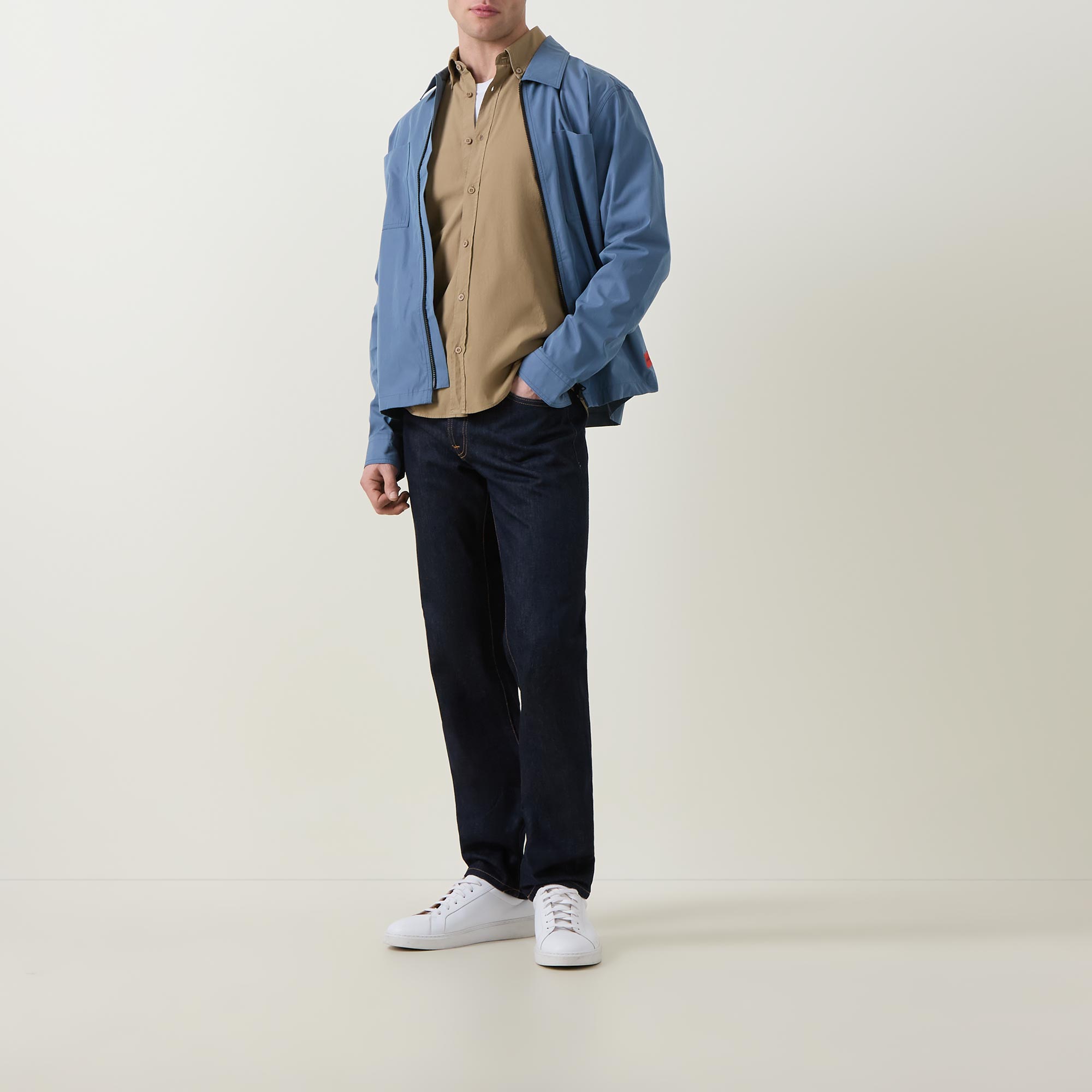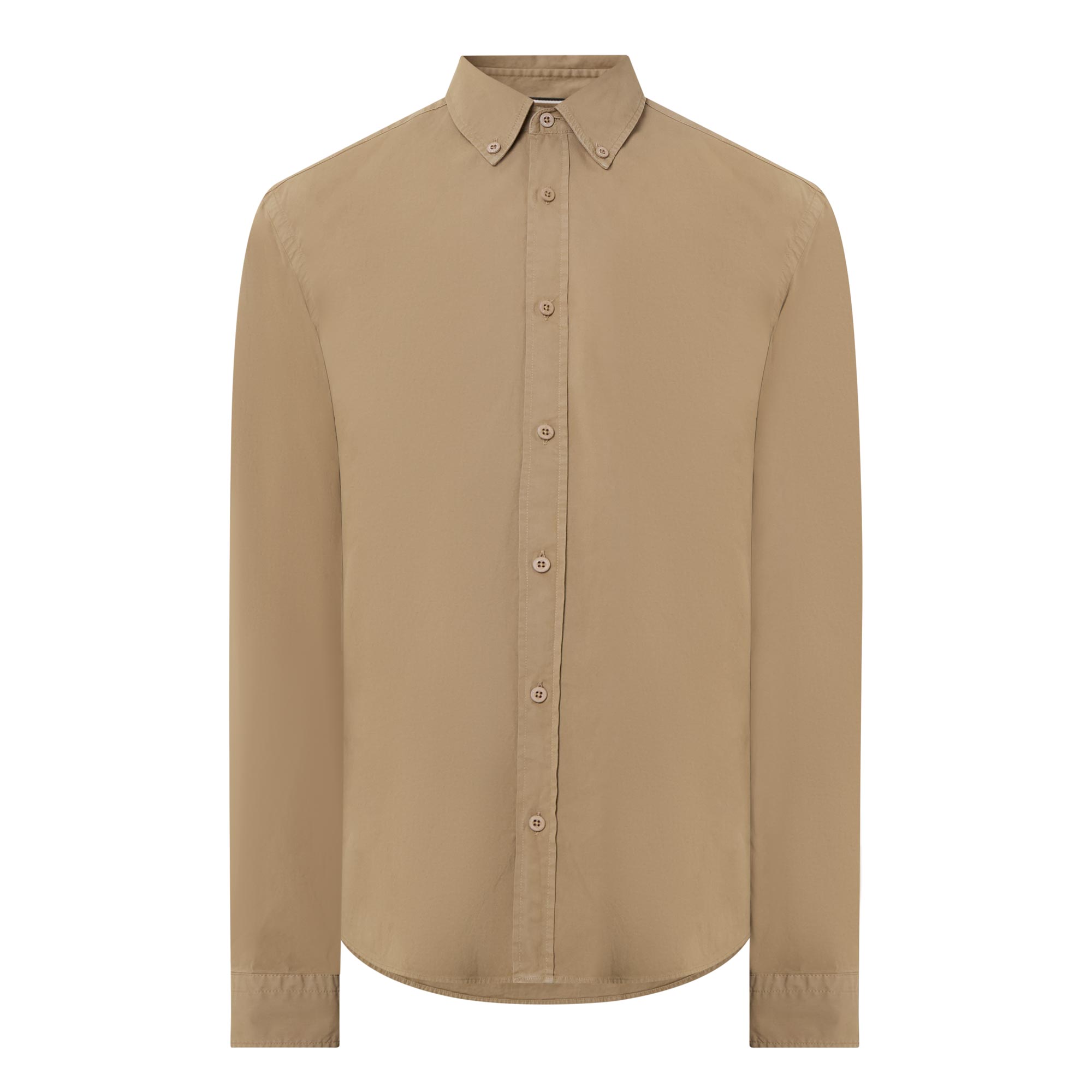• Button-down collar, long sleeves, dropped shoulders, front button placket, back box pleat, tonal stitching, single-button cuffs, curved hemline, smooth fabric