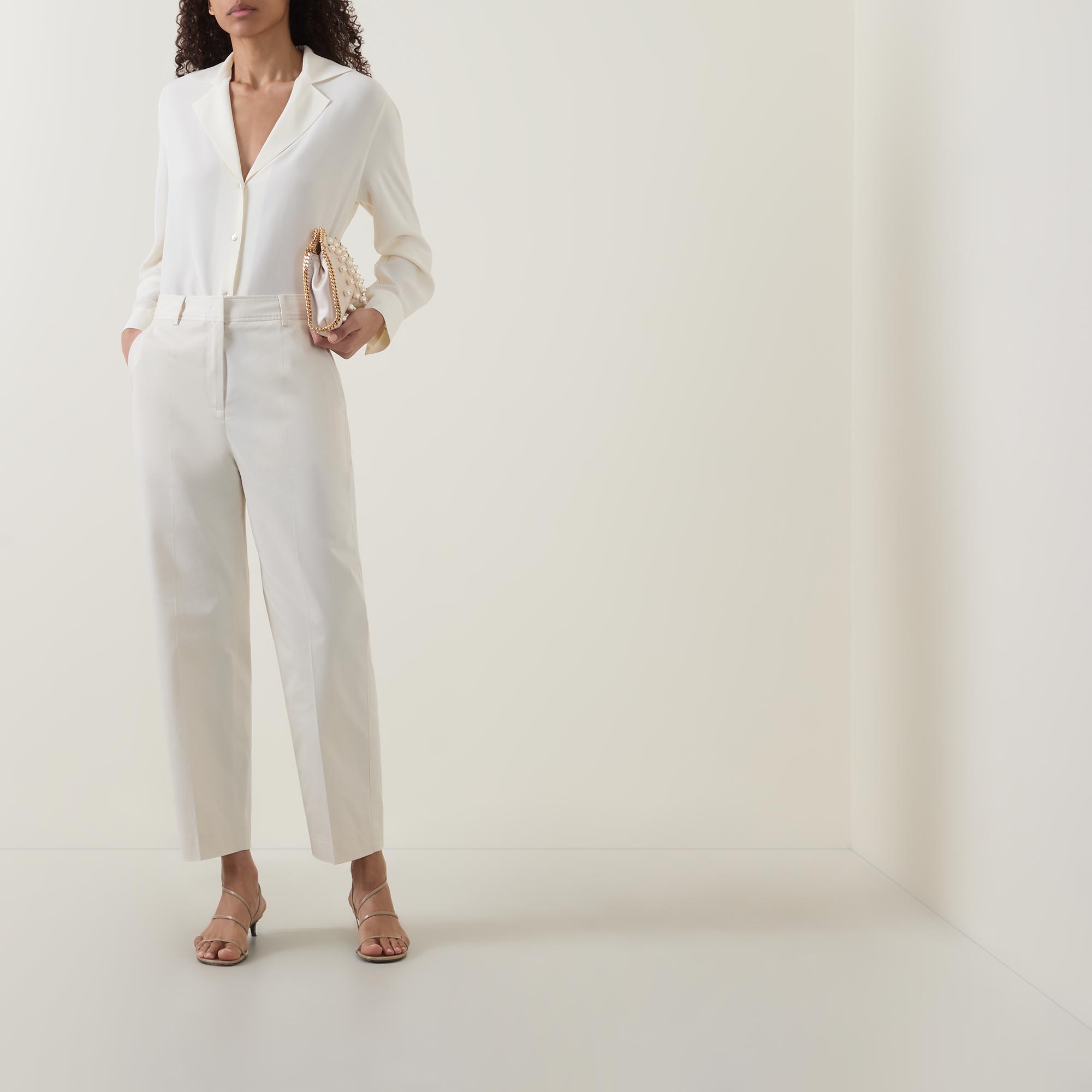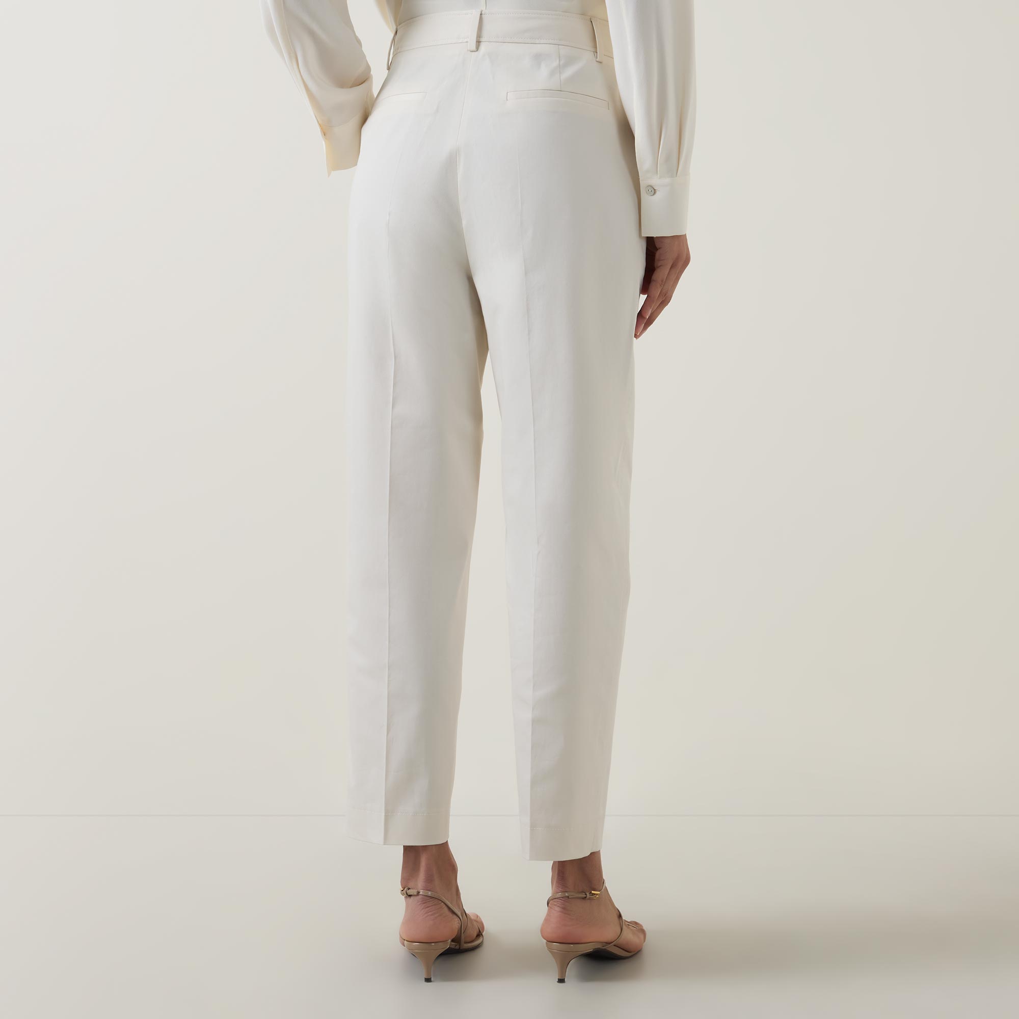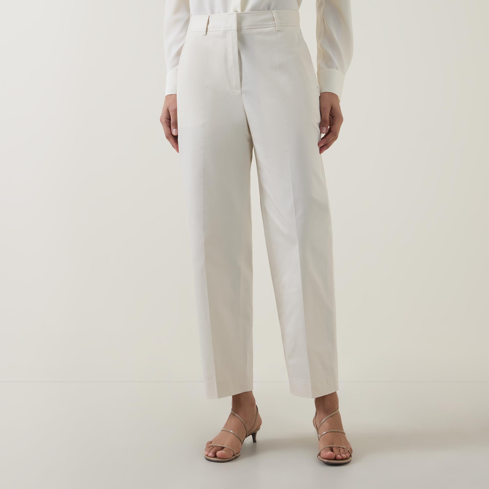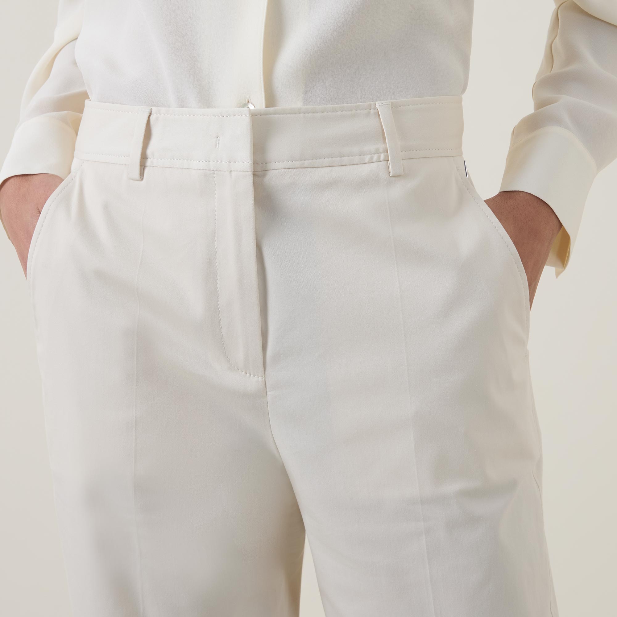 - Mid rise, straight leg, covered waistband, belt loops, concealed fly with hook and bar fastening, two side entry pockets, two rear welt pockets, clean hems, pressed creases, smooth finish