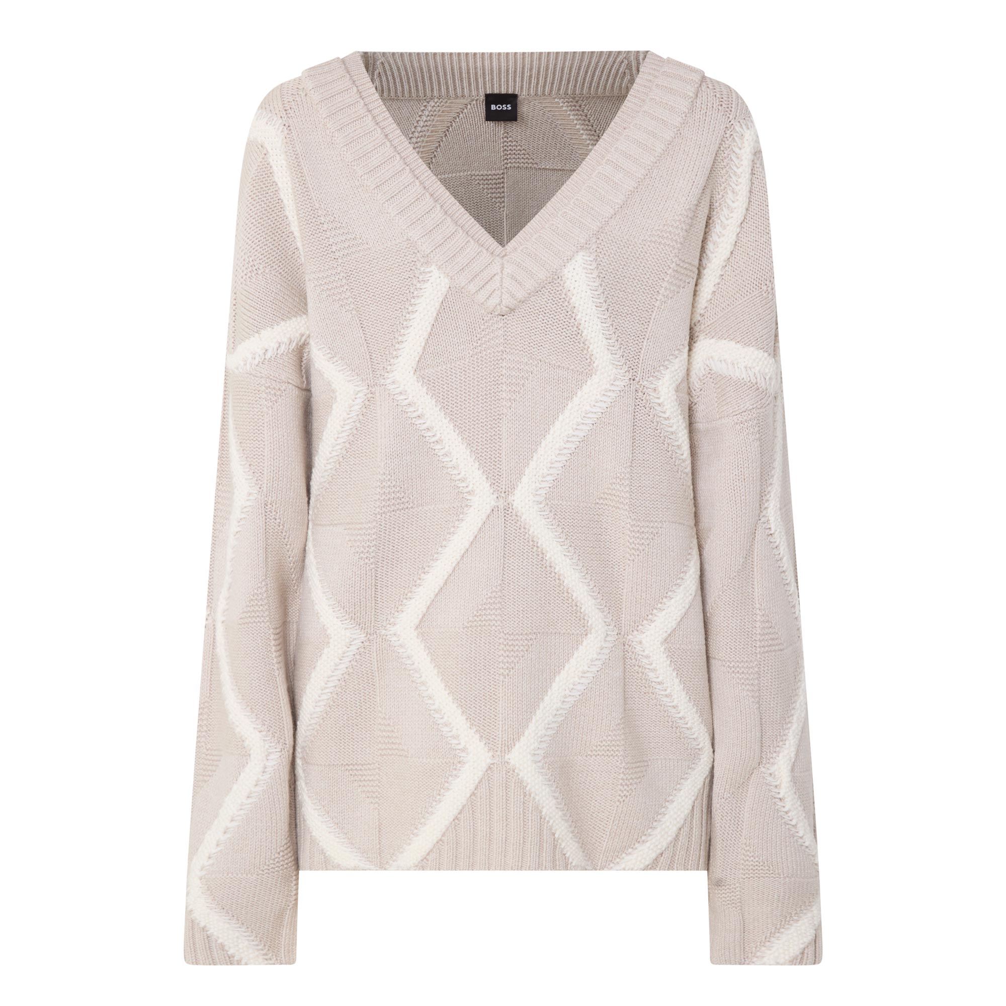 - Double-layered V-neckline, long sleeves, dropped shoulders, ribbed trims, knit structure, geometric pattern