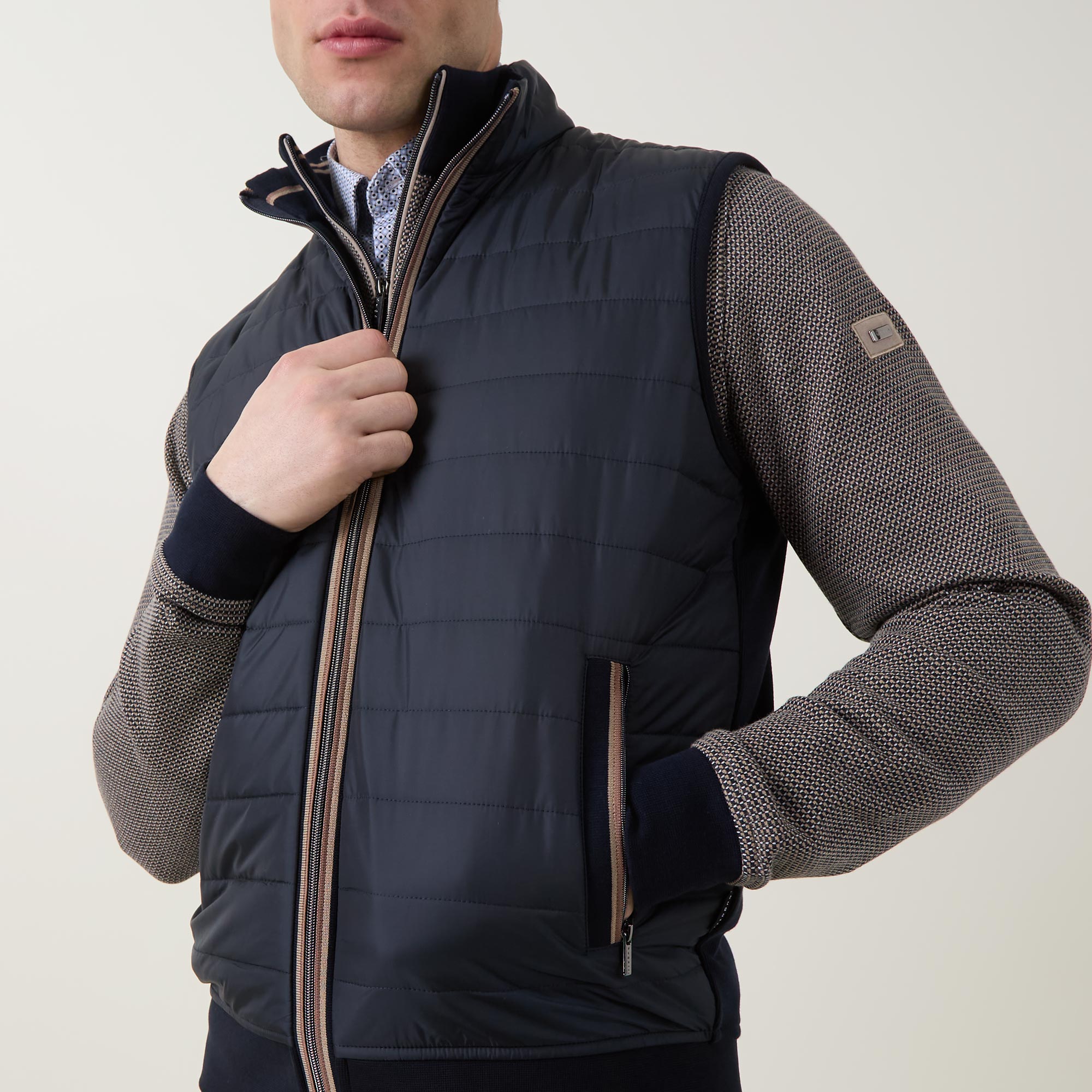 • Contrast details, sleeveless, metal plaque, zip fastening