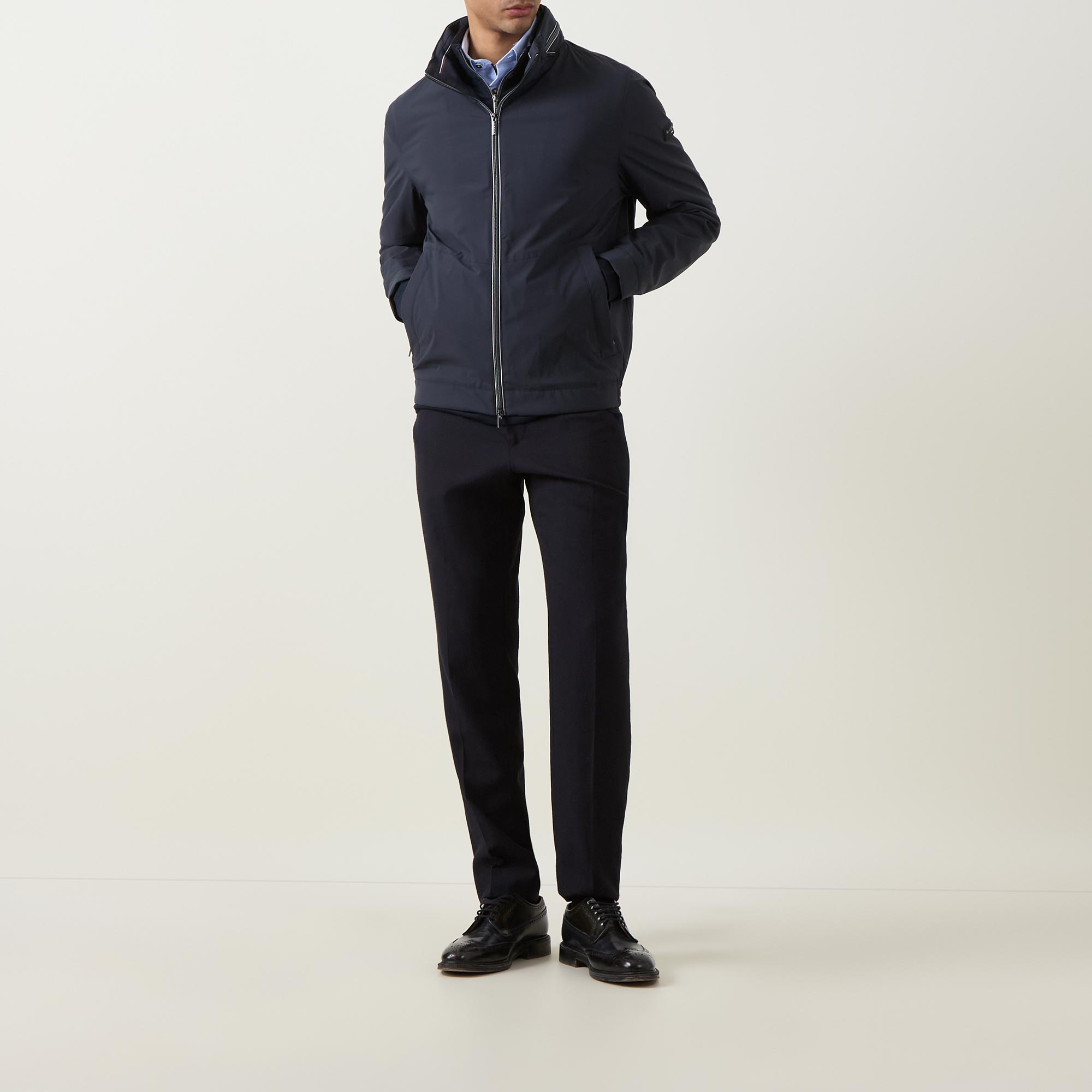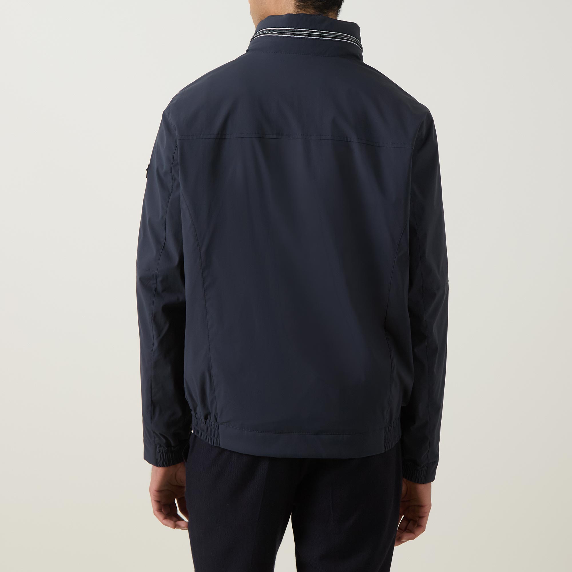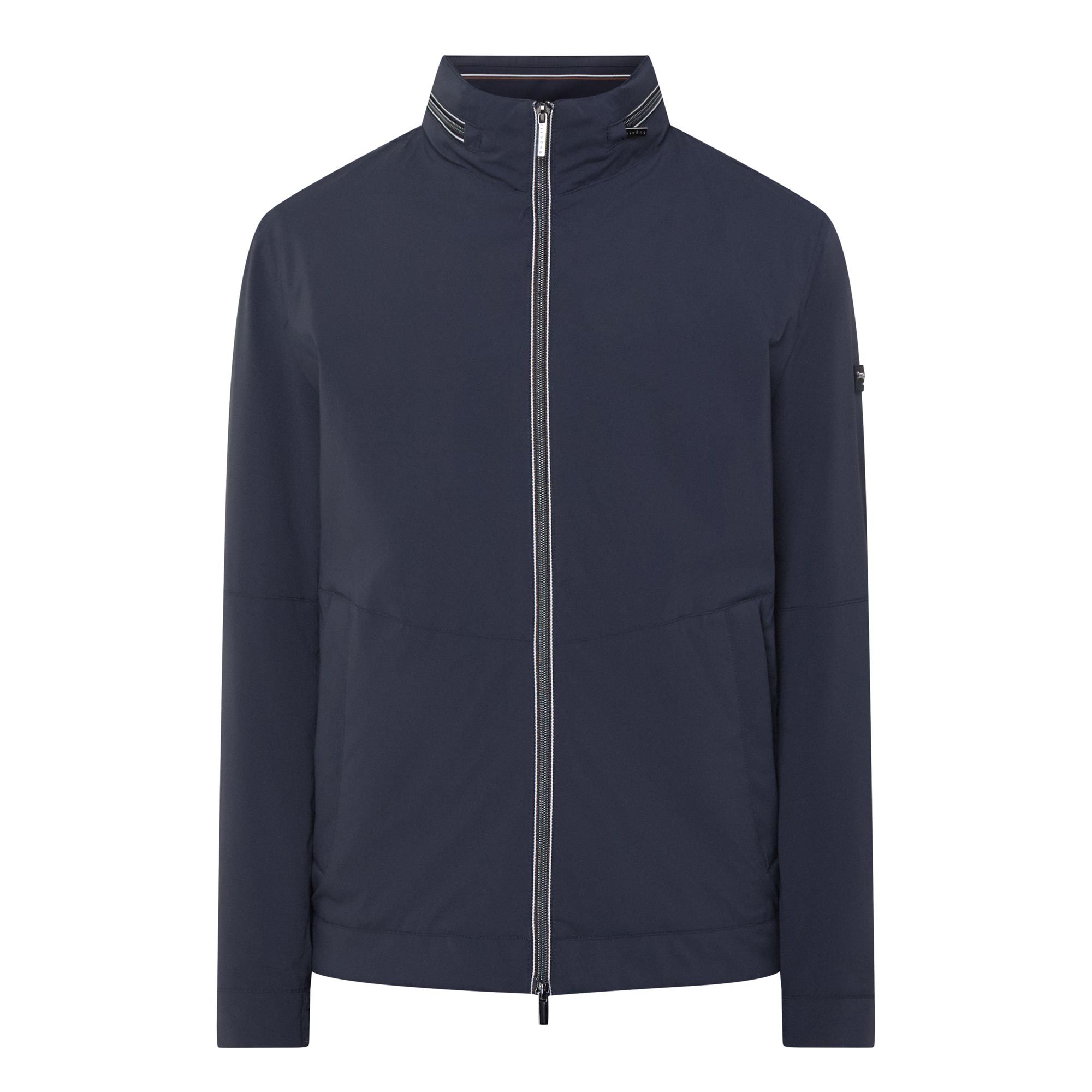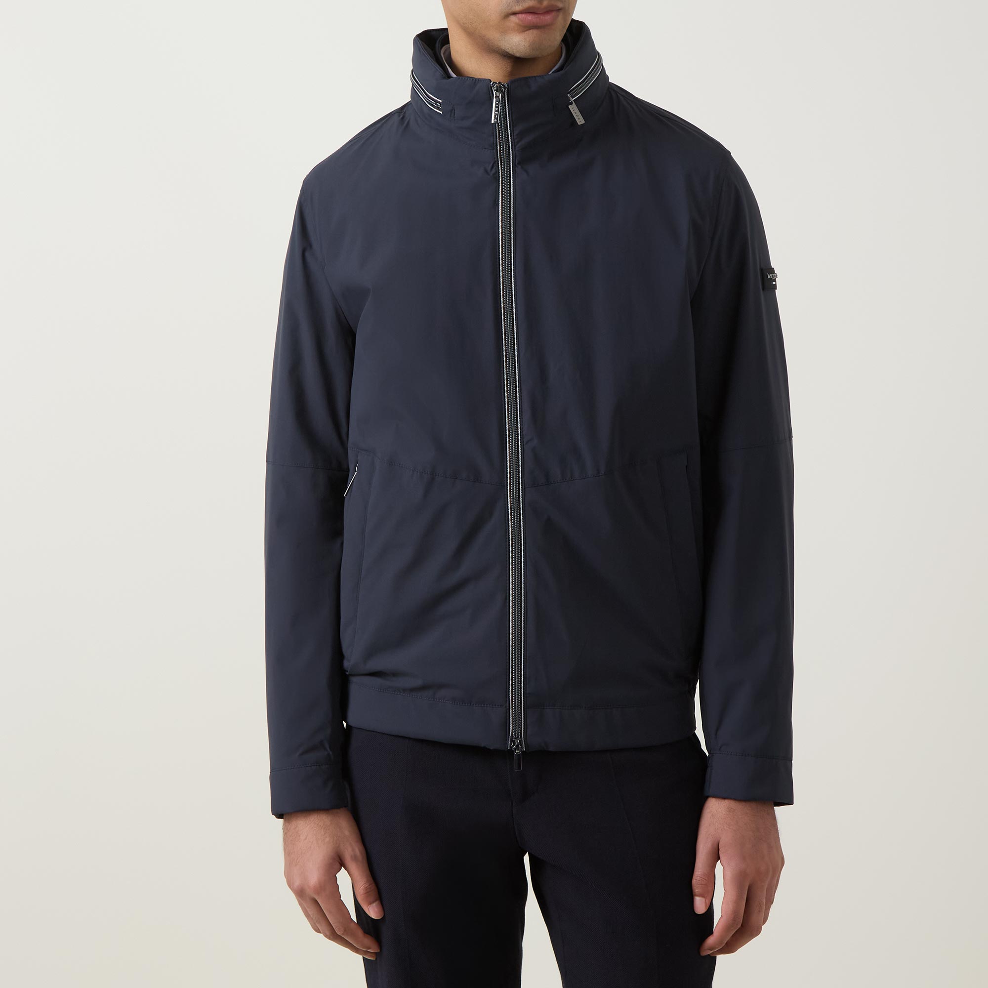 - Standing collar, stowable hood, two-way zip fastening, long sleeves, zipped side entry pockets, elasticated hemline, logo details