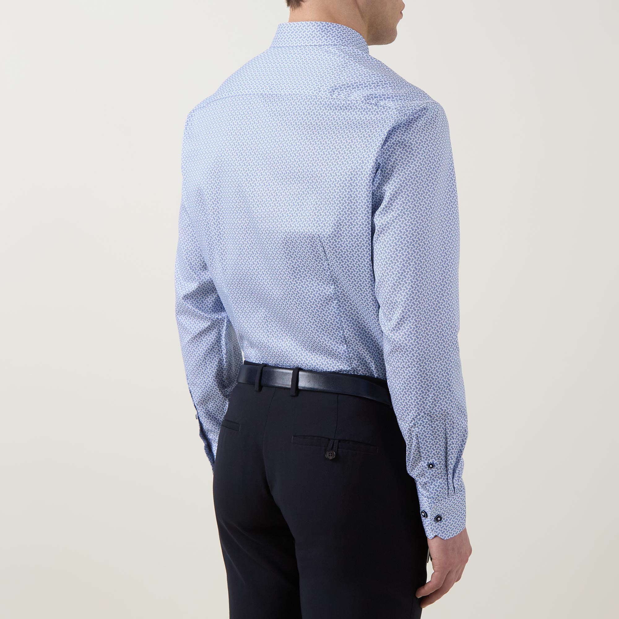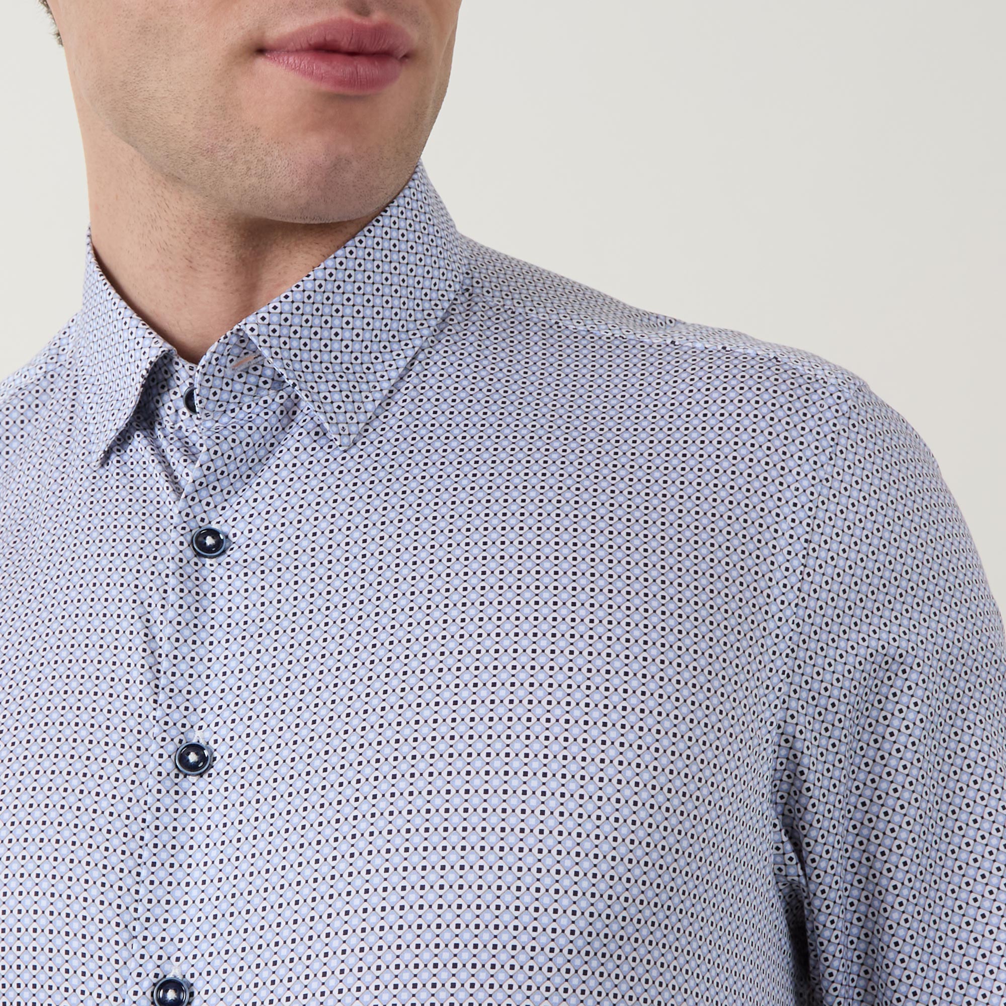 - Pointed collar, long sleeves, button fastenings, curved hemline, geometric print