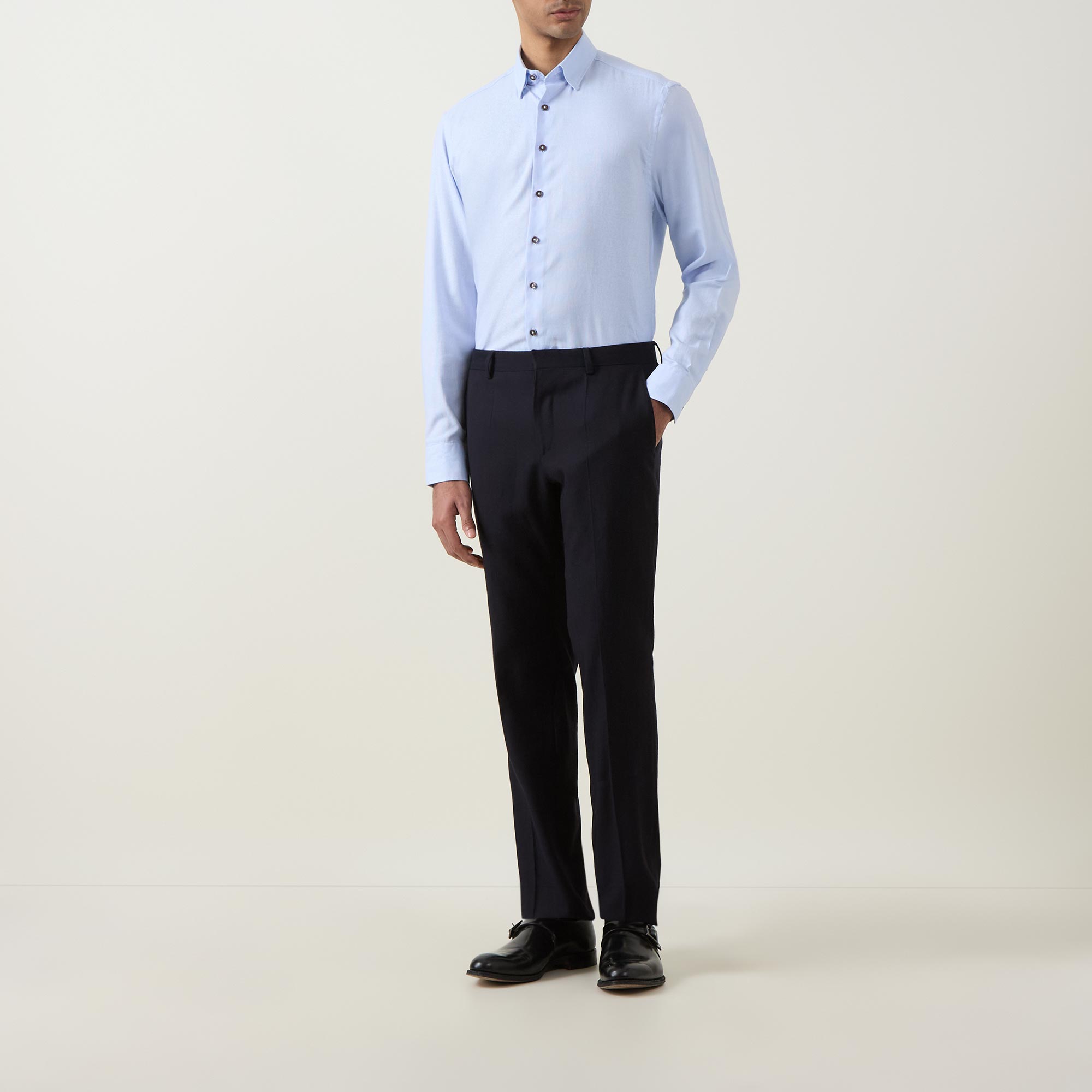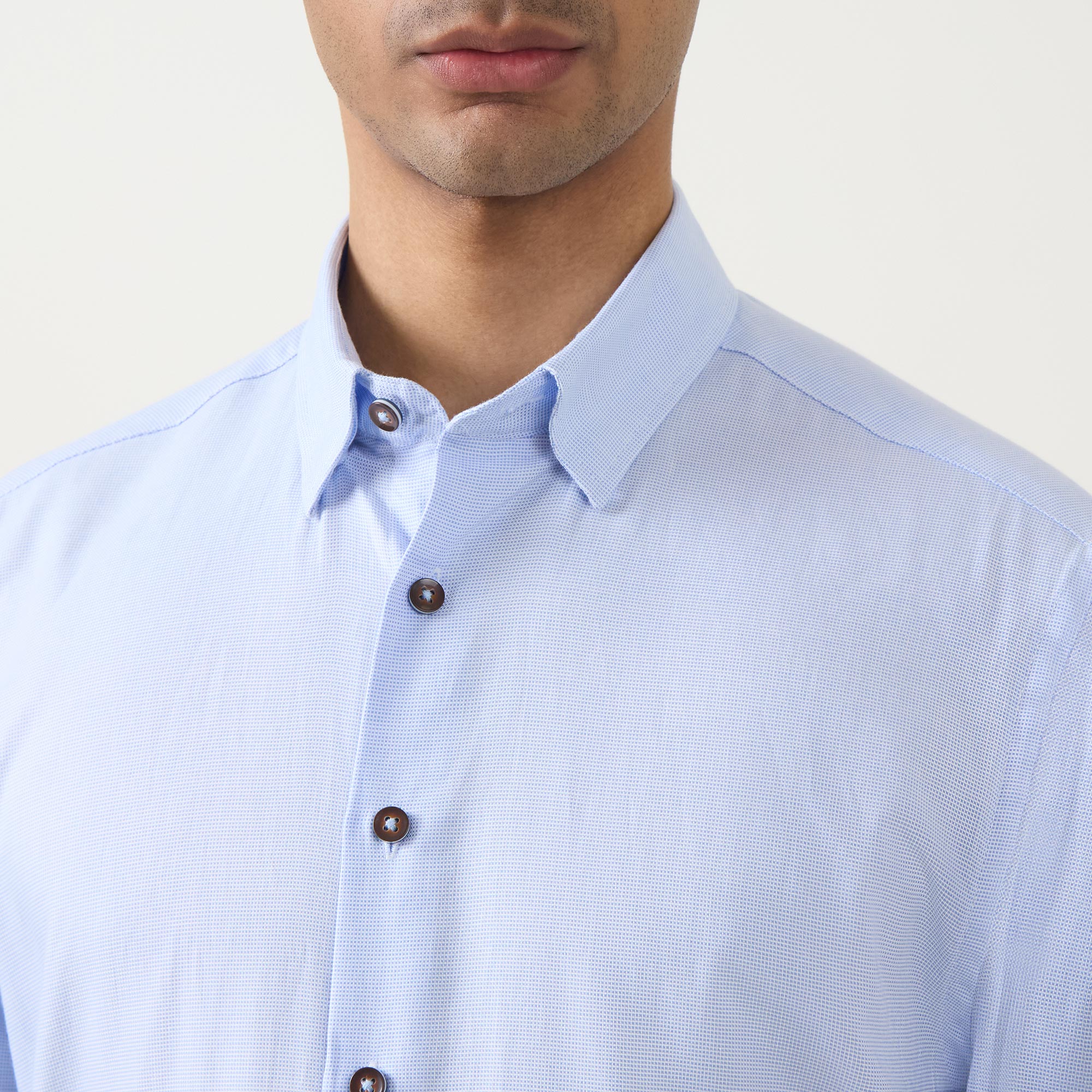 - Classic collar, button fastening, long sleeves, single-cuff, textured finish, curved hemline