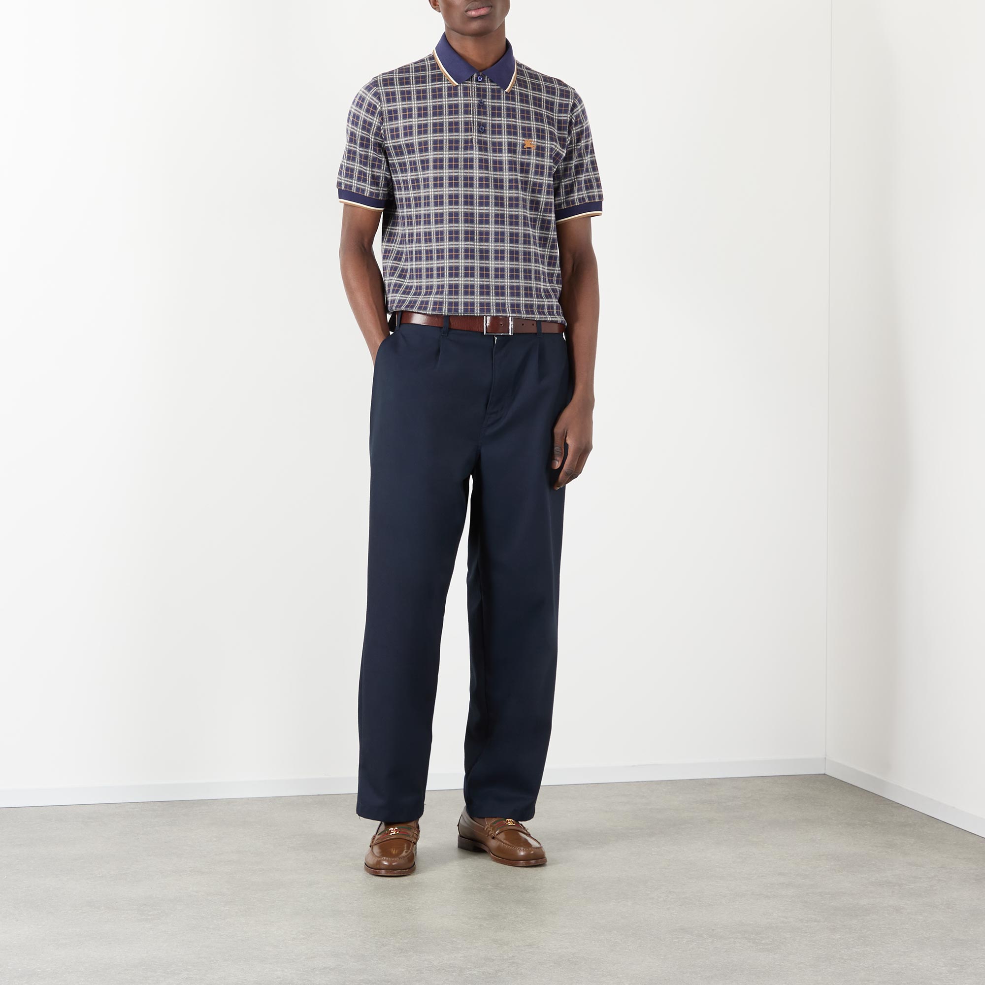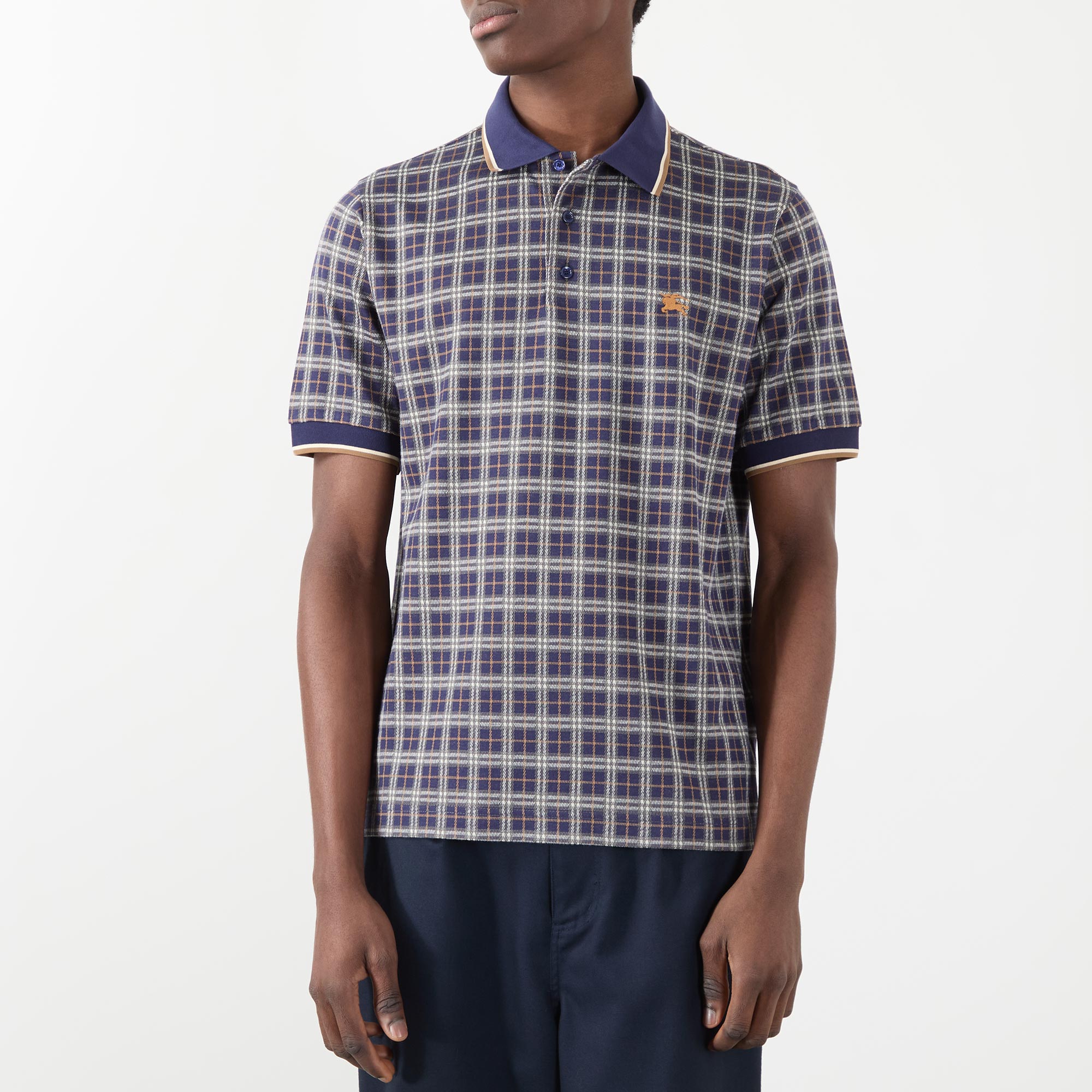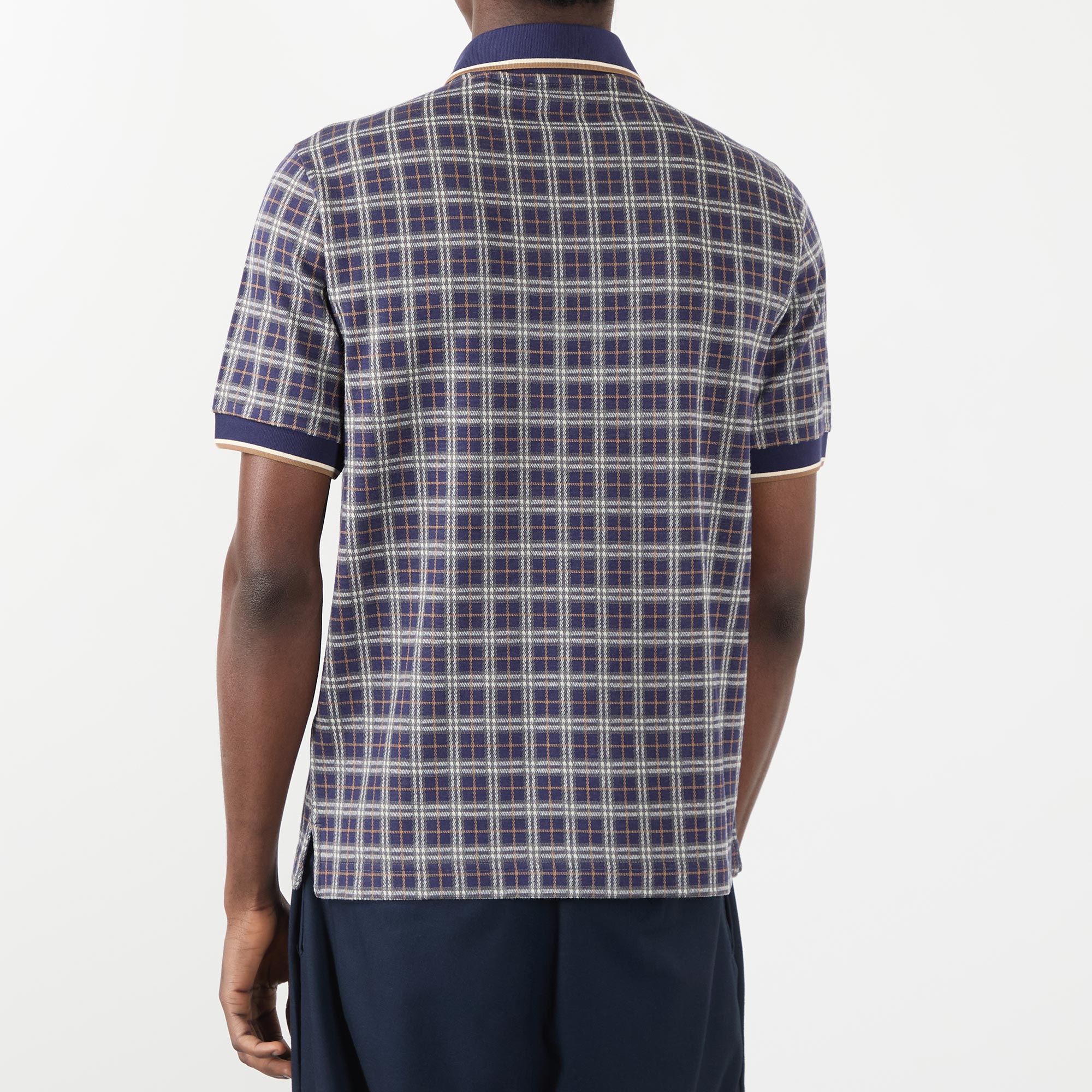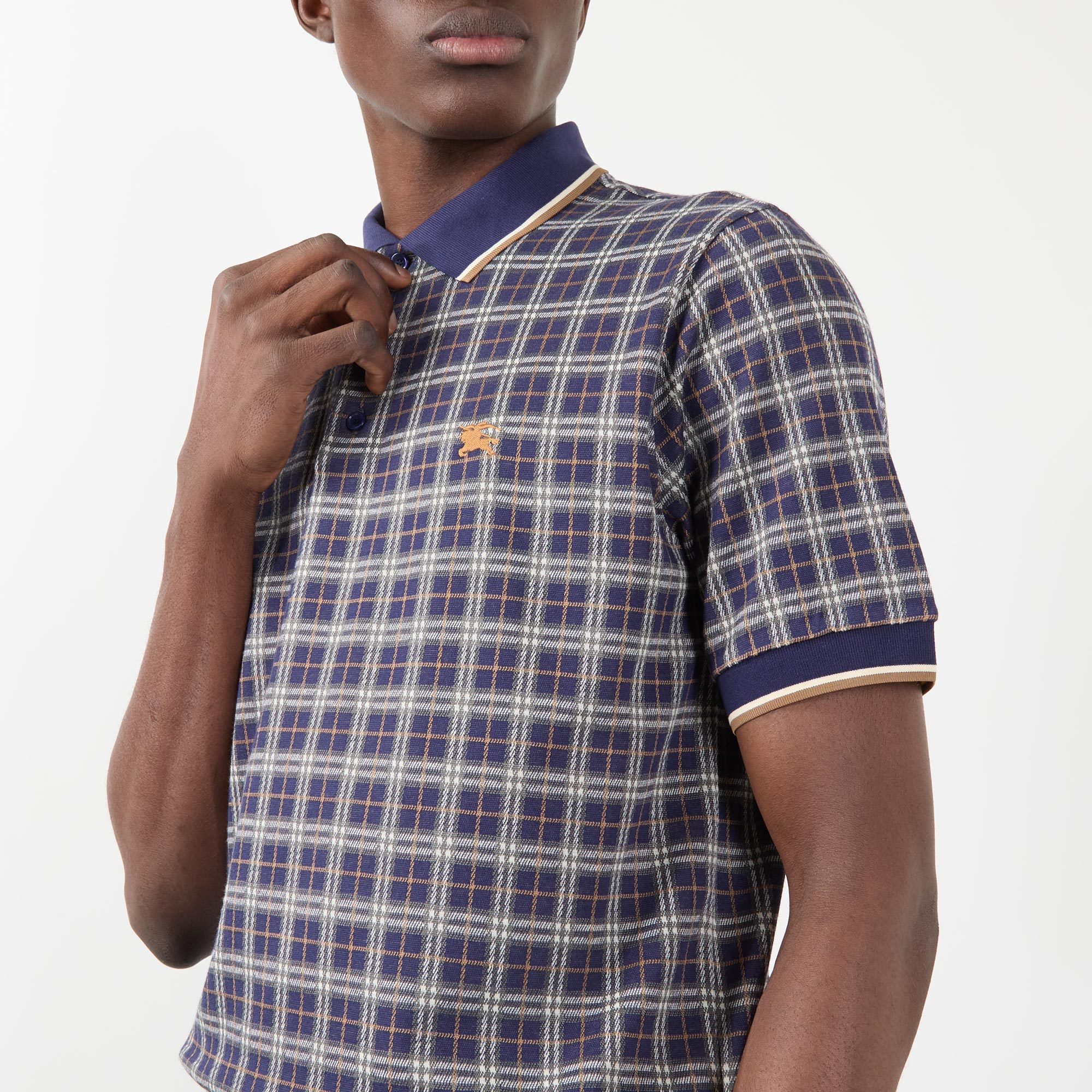 - Polo collar, short sleeves, check pattern, logo detail, button fastenings