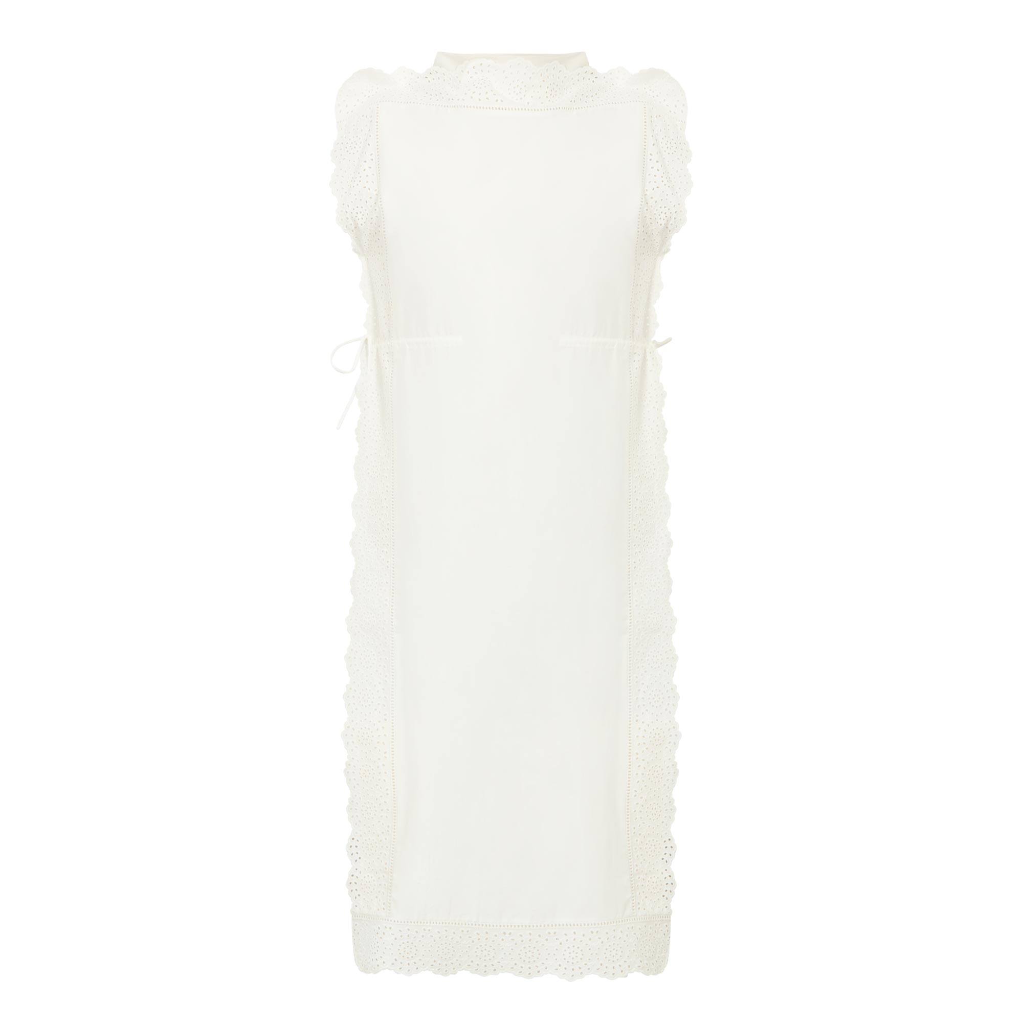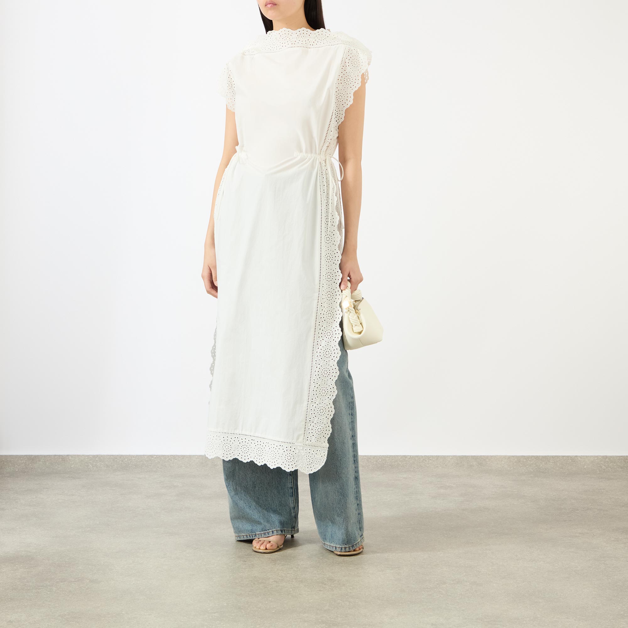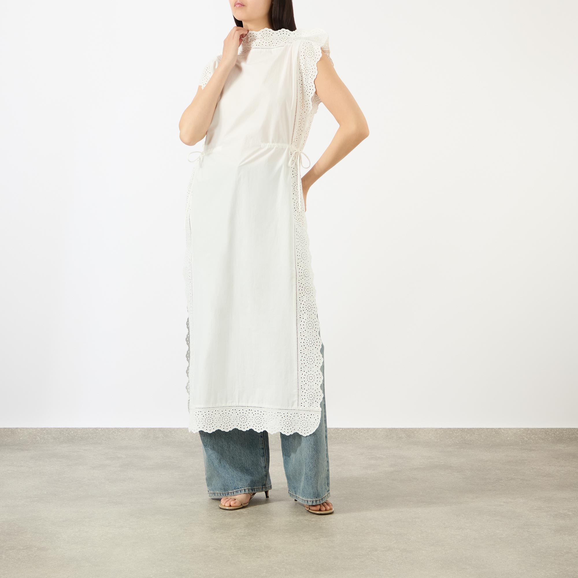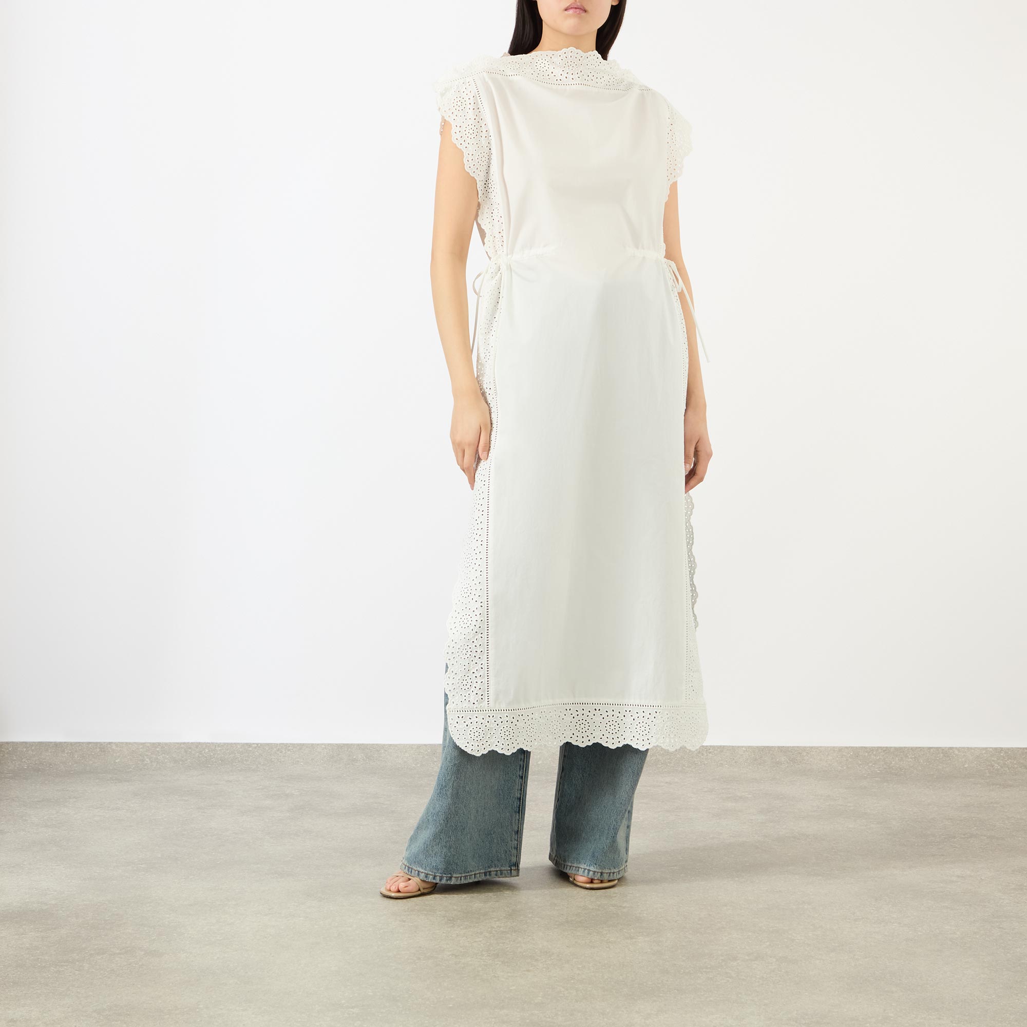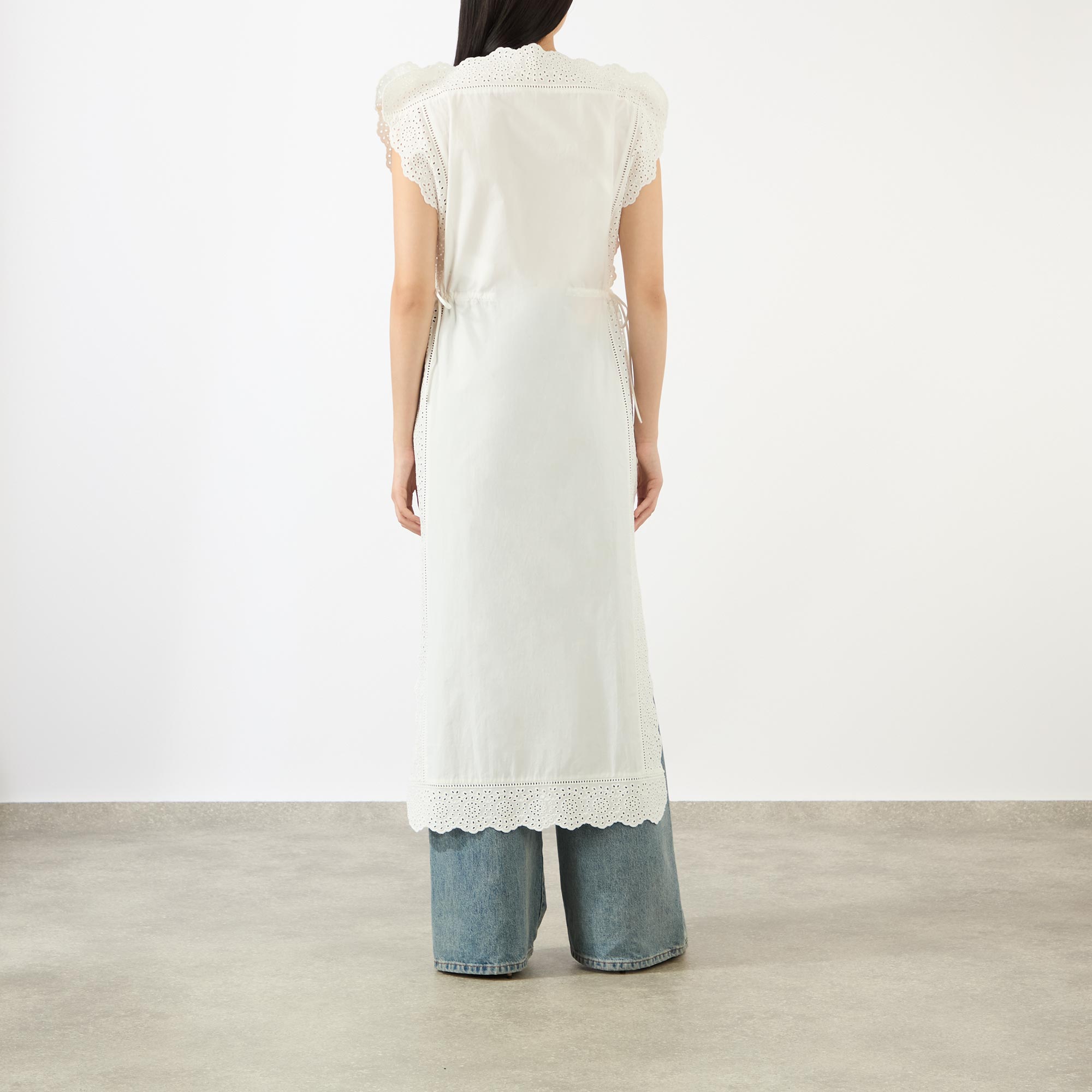 - Square neckline, sleeveless design with dropped arm opening, adjustable waist ties, high side slits, longline design, Broderie Anglaise detailing
