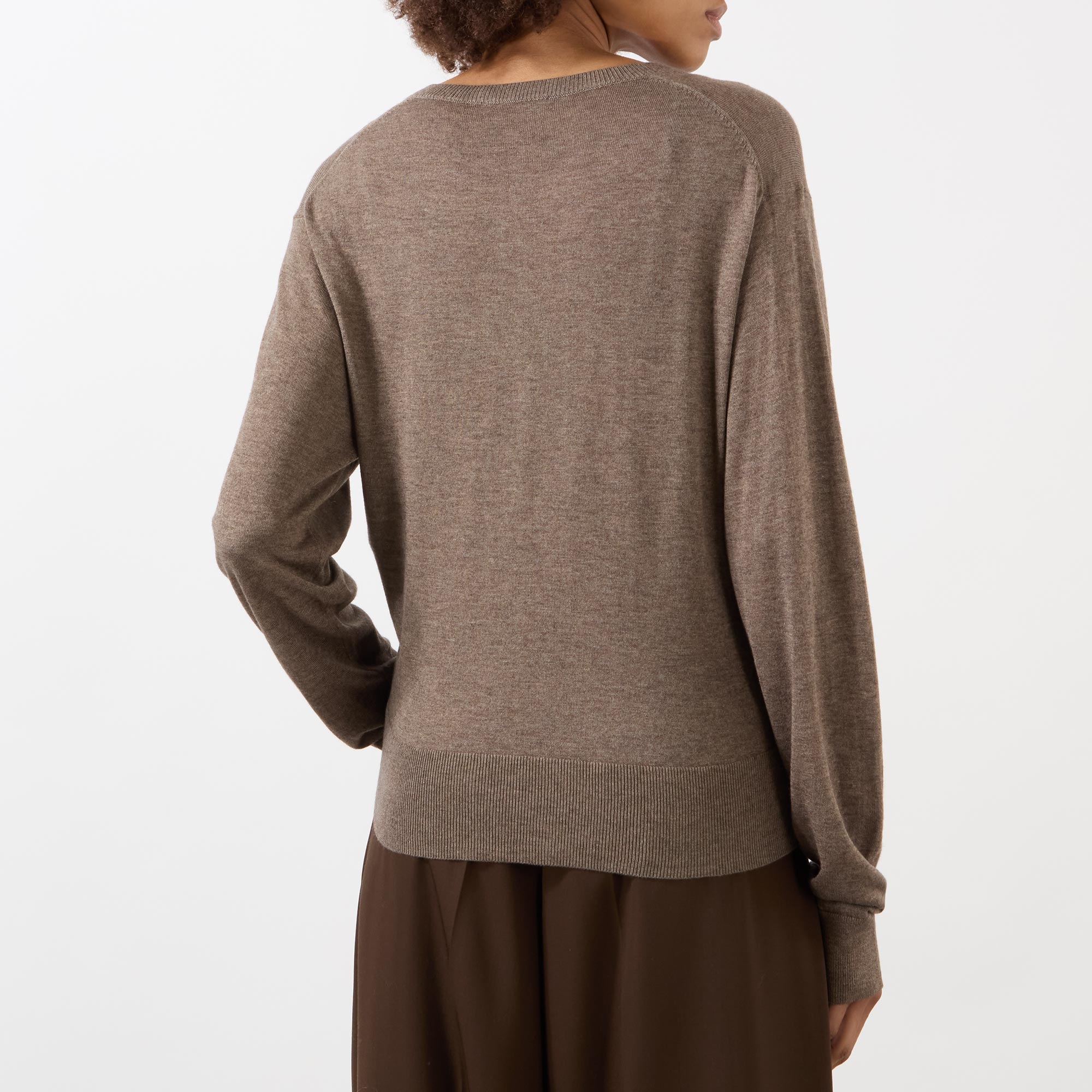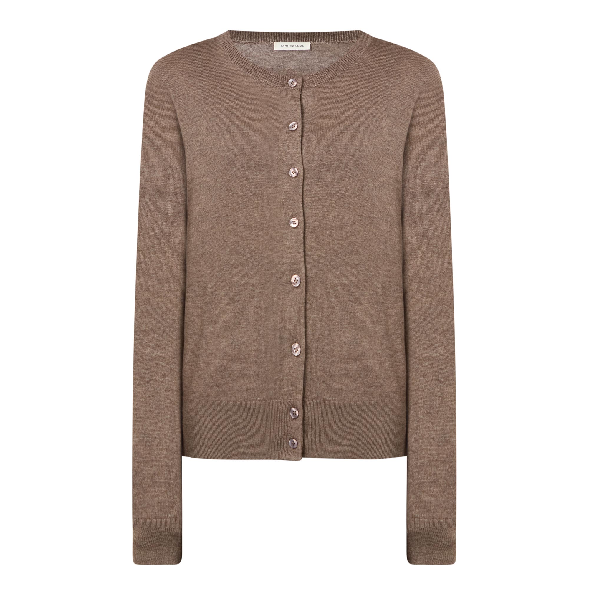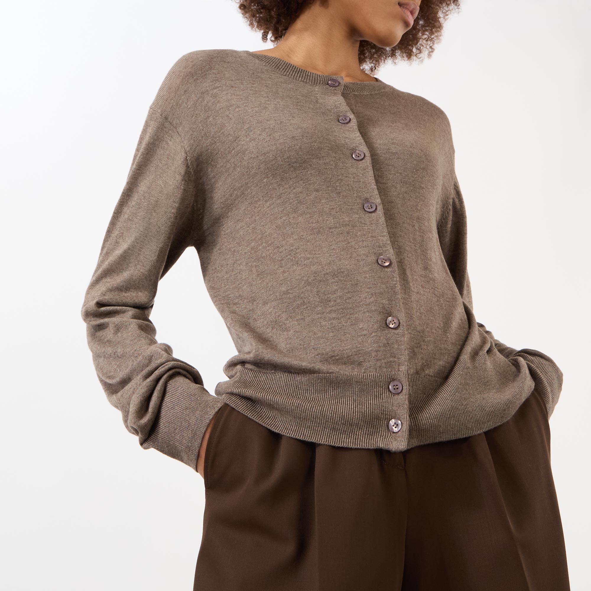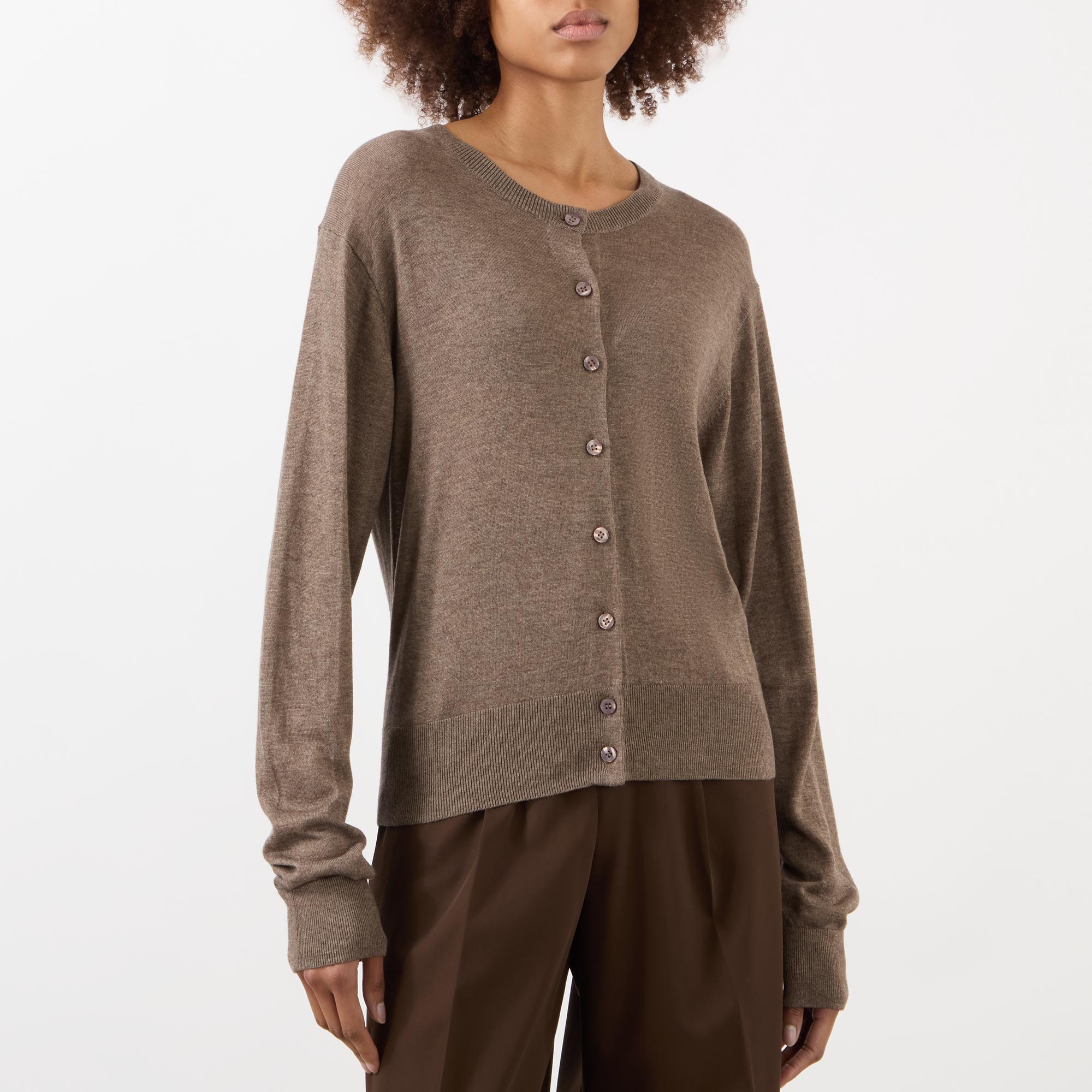 - Round neckline, long sleeves, front button placket, ribbed trims, fine-knit finish