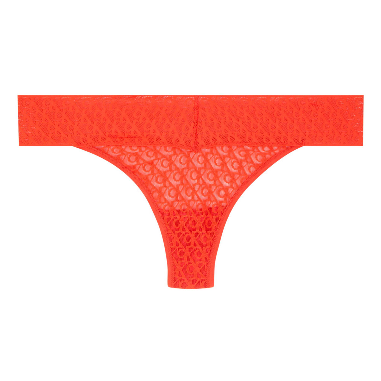 - Low-rise, wide elastic waistband, thong-style, CK monogram logo lace design, semi-sheer finish