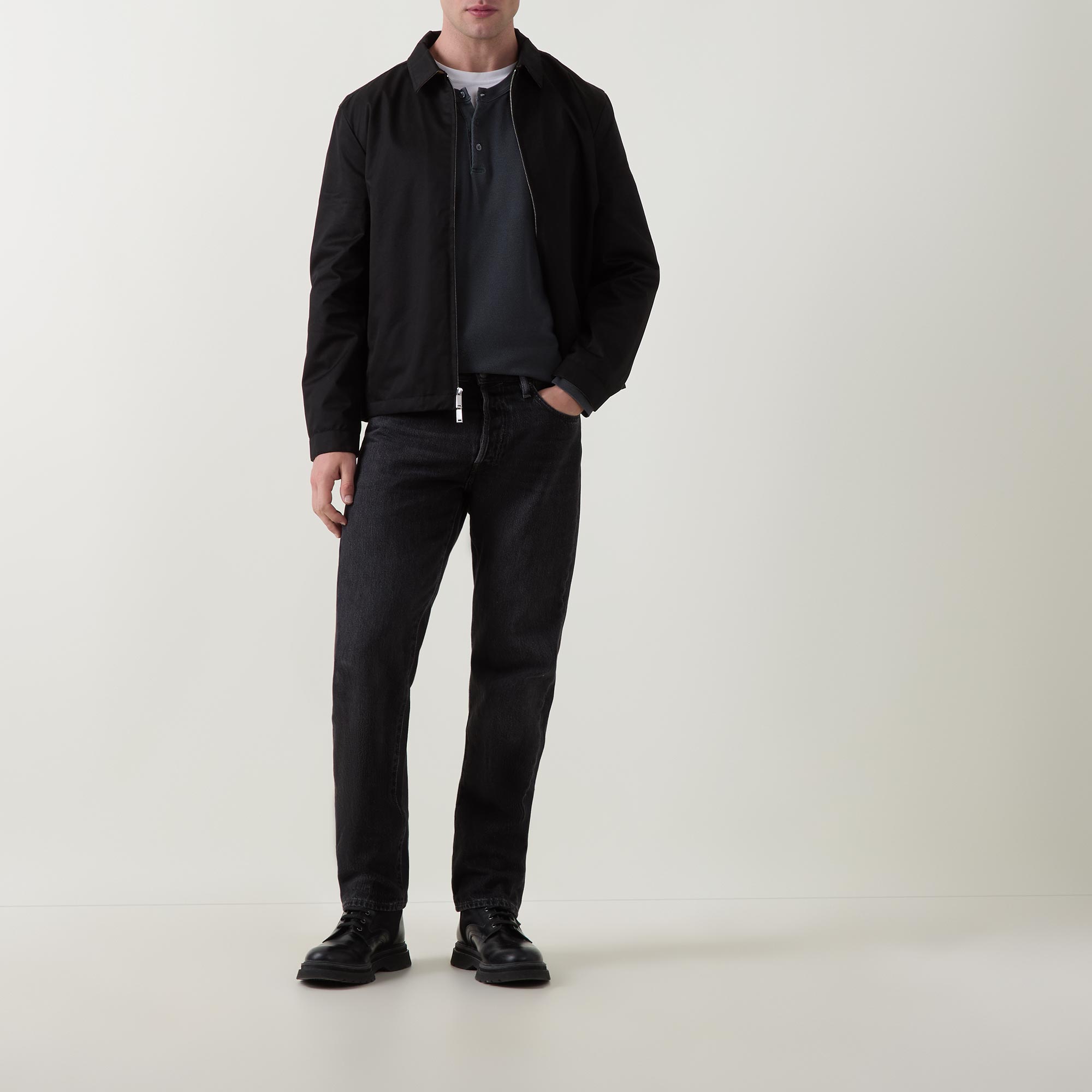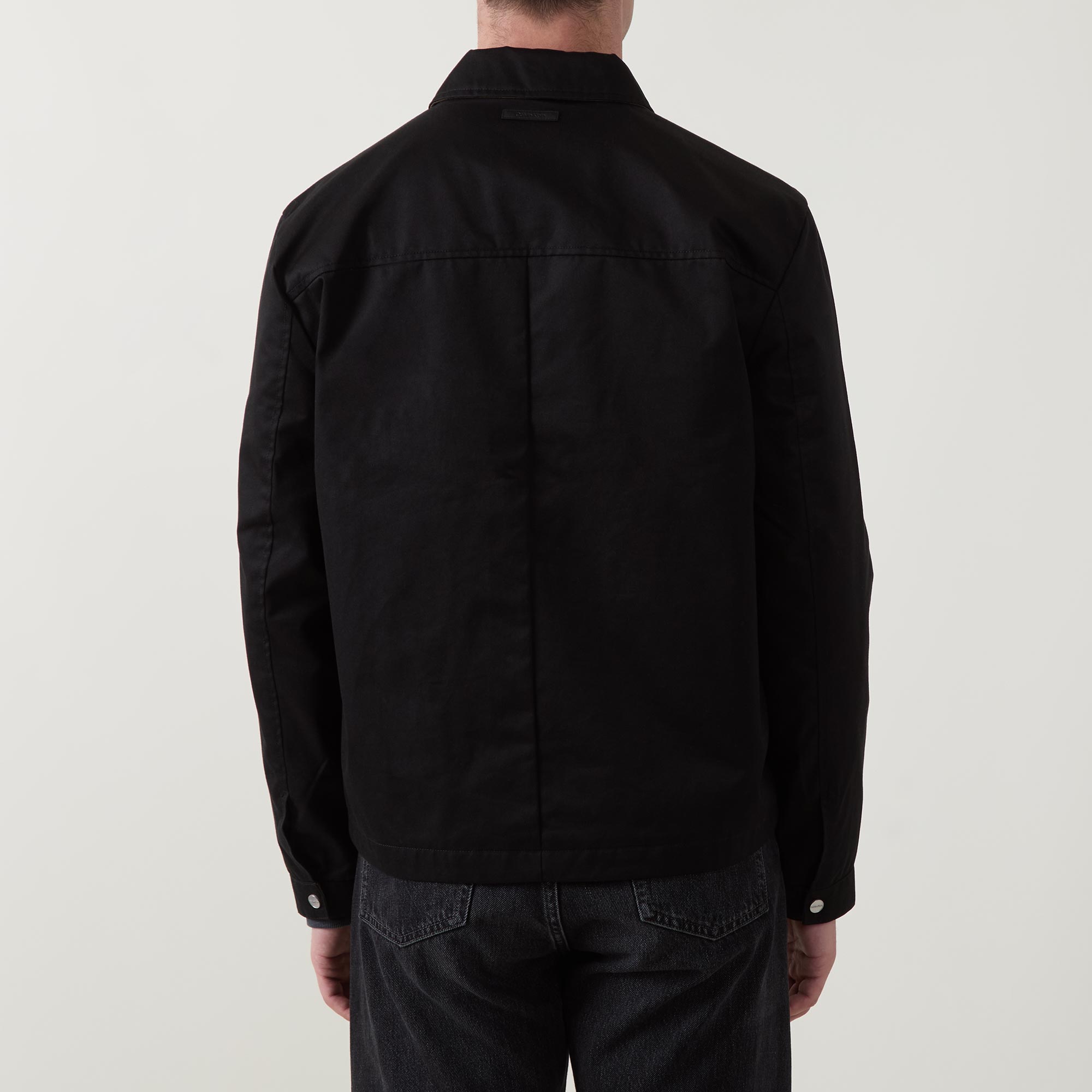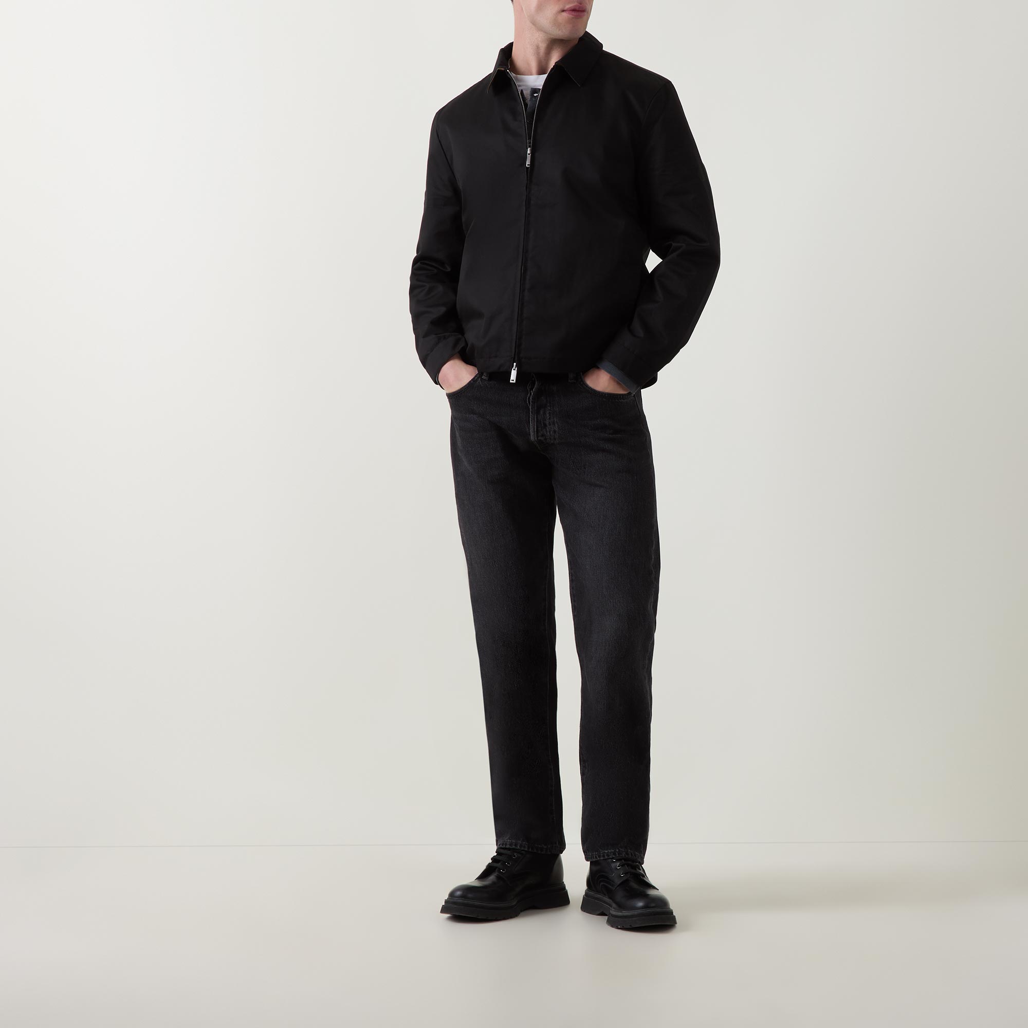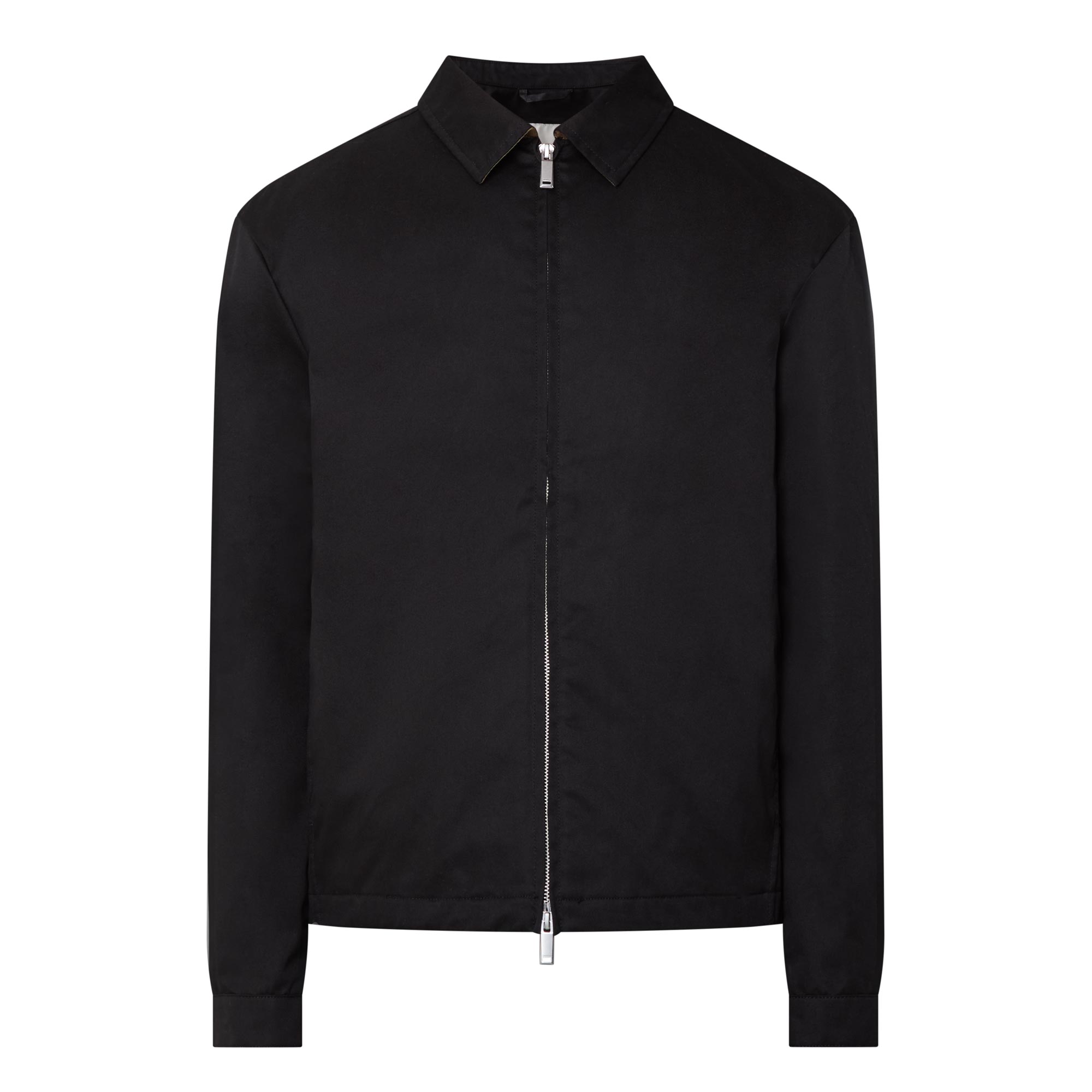 - Classic collar, long sleeves, buttoned cuffs, straight hemline, two-way zip fastening, seam details, logo badge