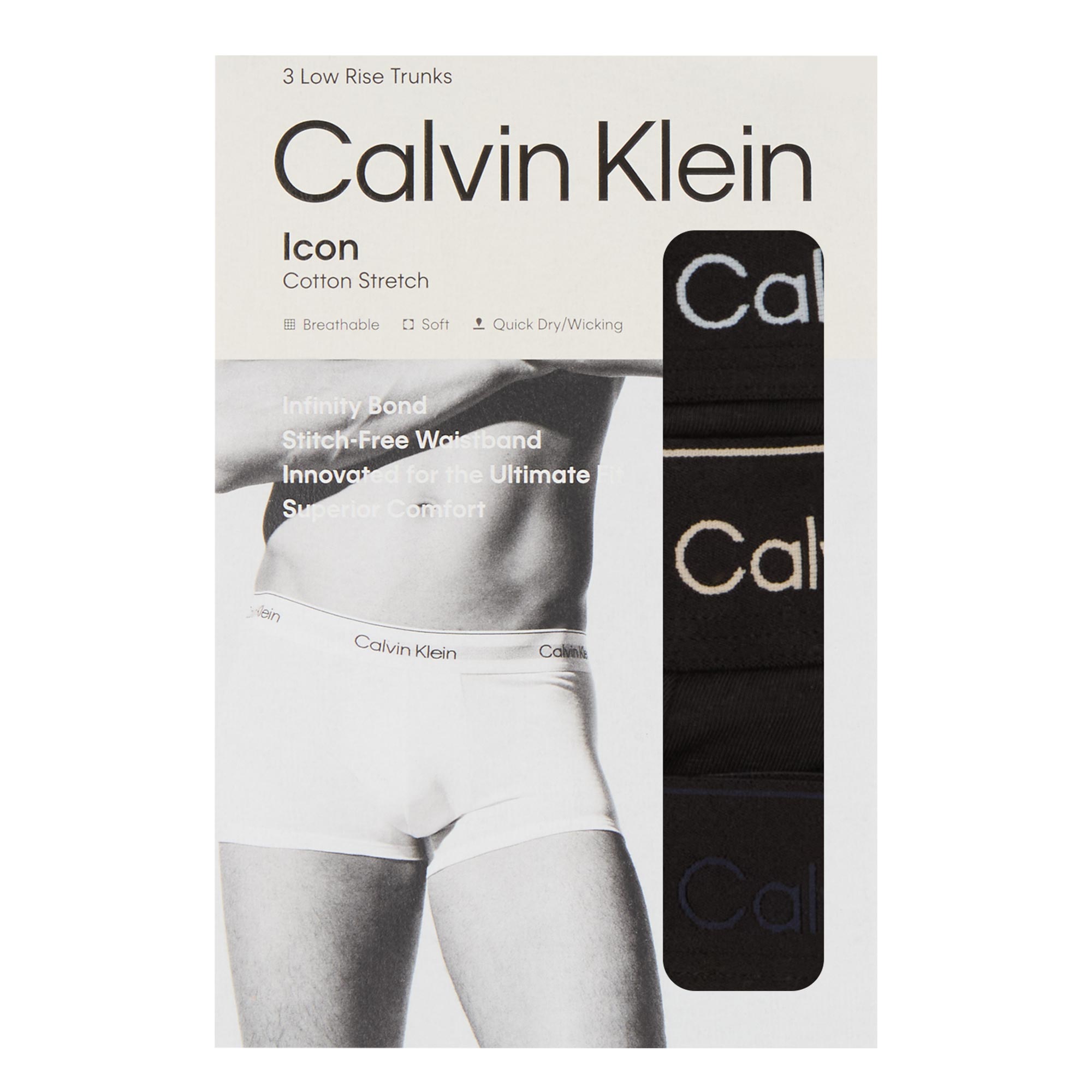 - Three-pack, trunk-style, low-rise, straight-leg, stitch free waistband, Icon logo branding, clean hems, stretch fabric, assorted coloured accents, soft finish