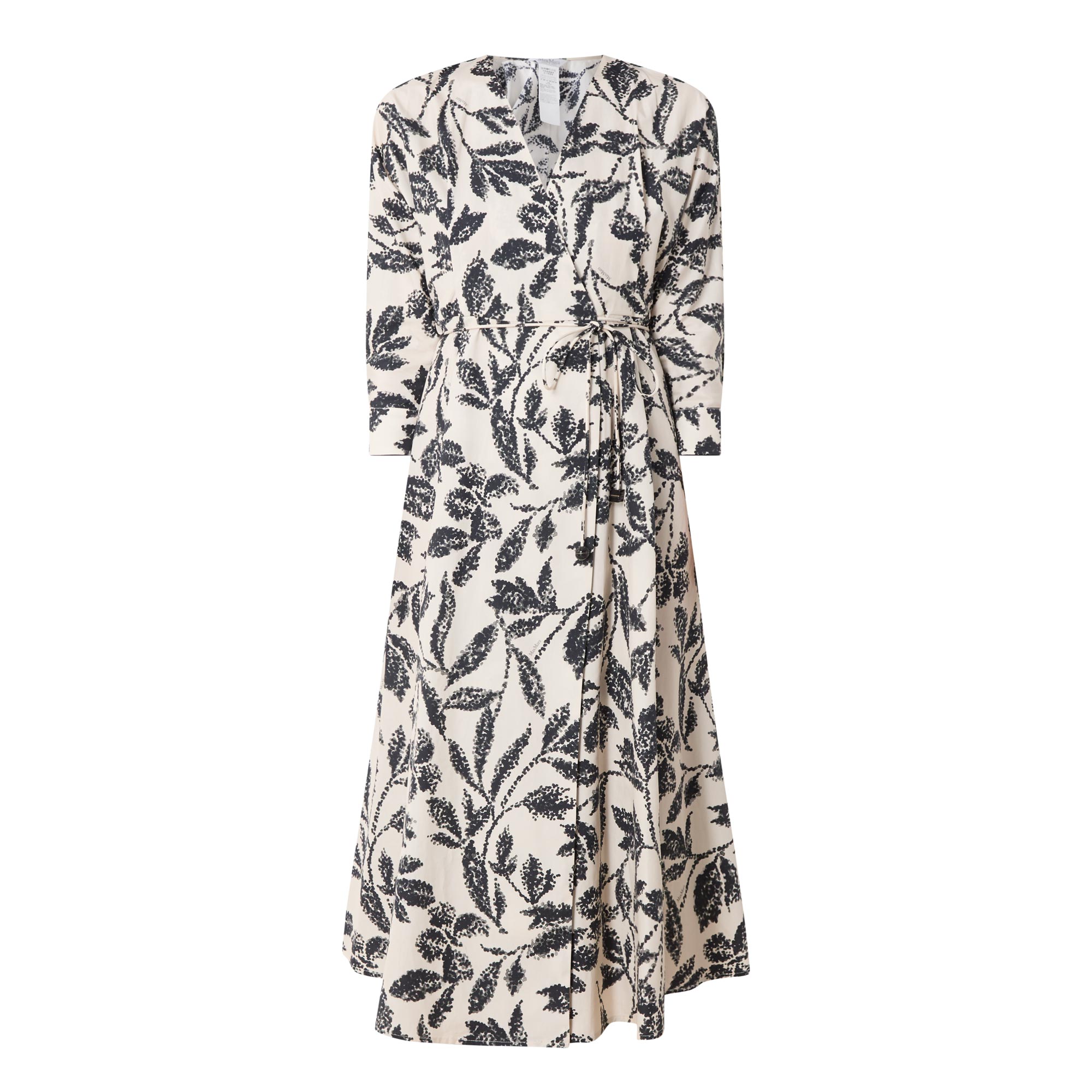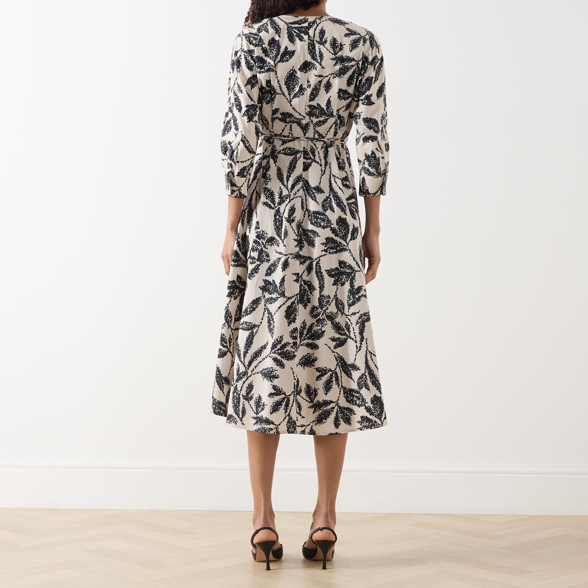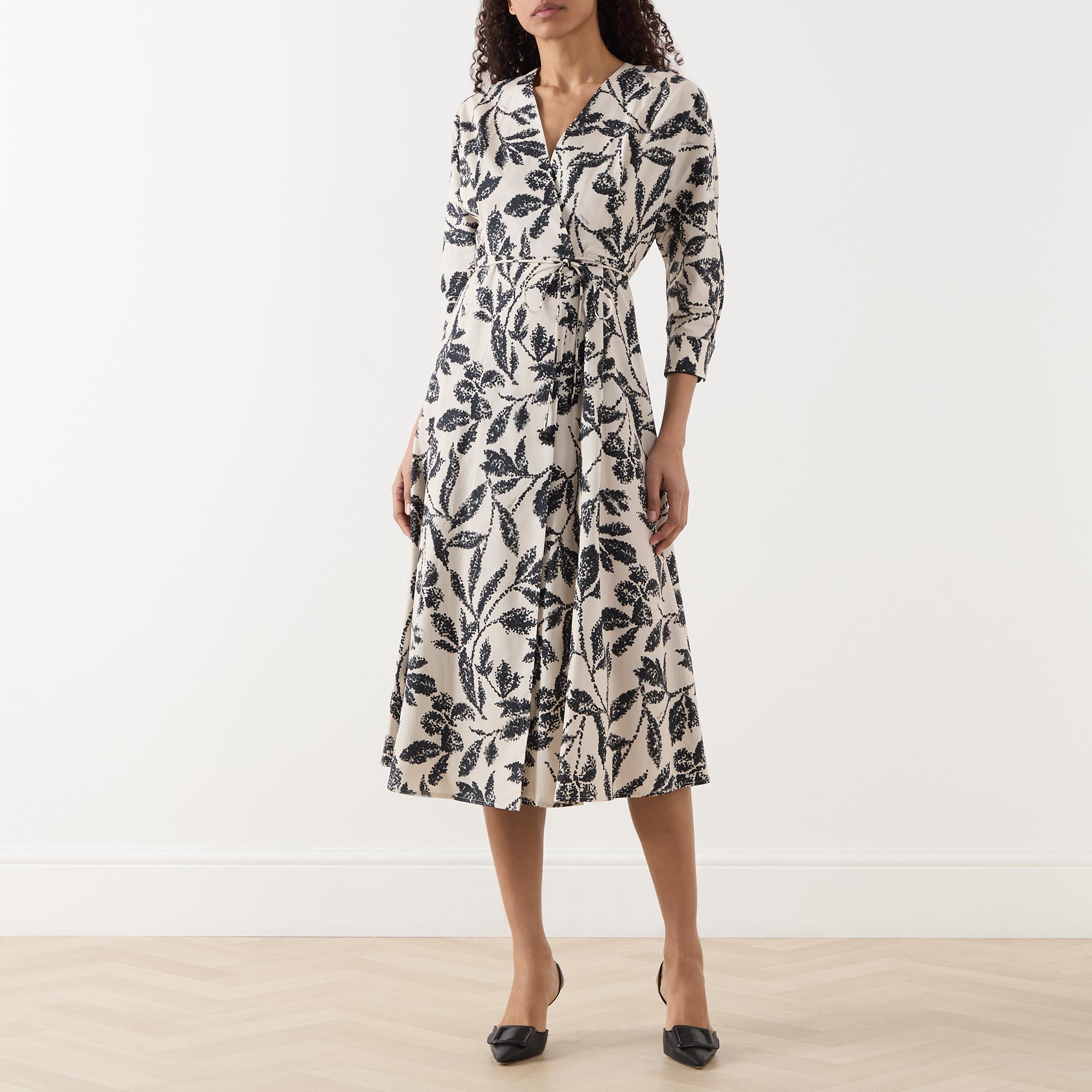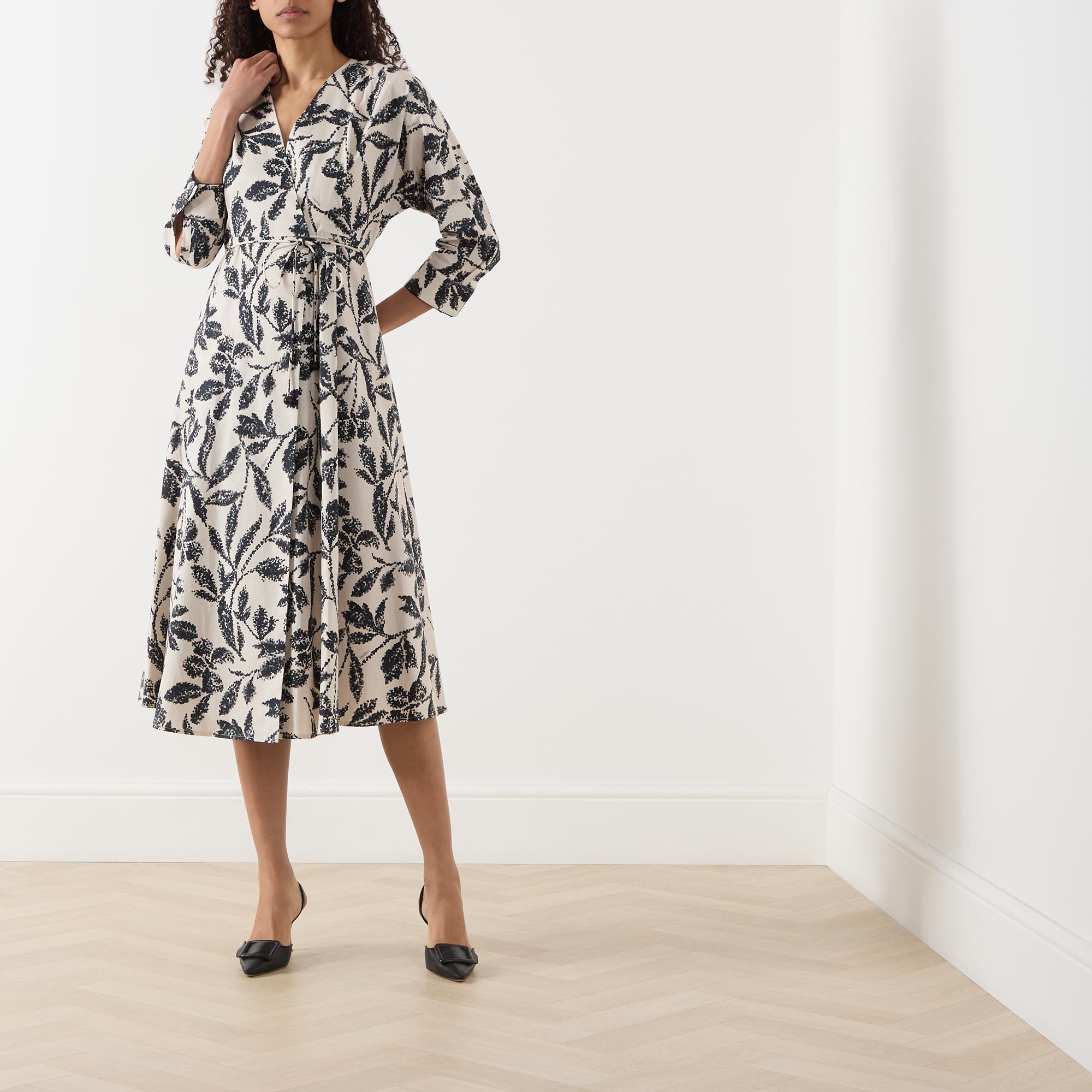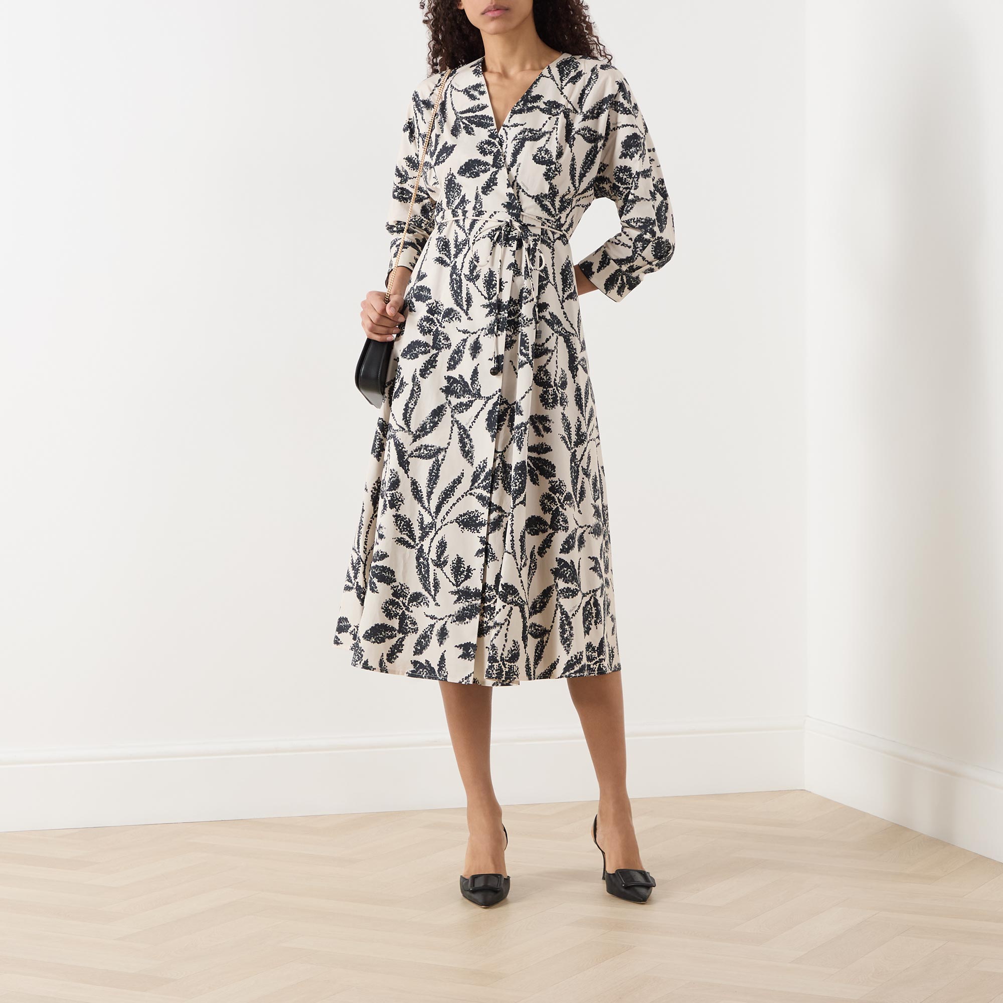 - V-neckline, three quarter length batwing sleeves, buttoned cuffs, wrap-style front, matching tie fastening, flared skirt, straight hem, monochrome pattern, midi length