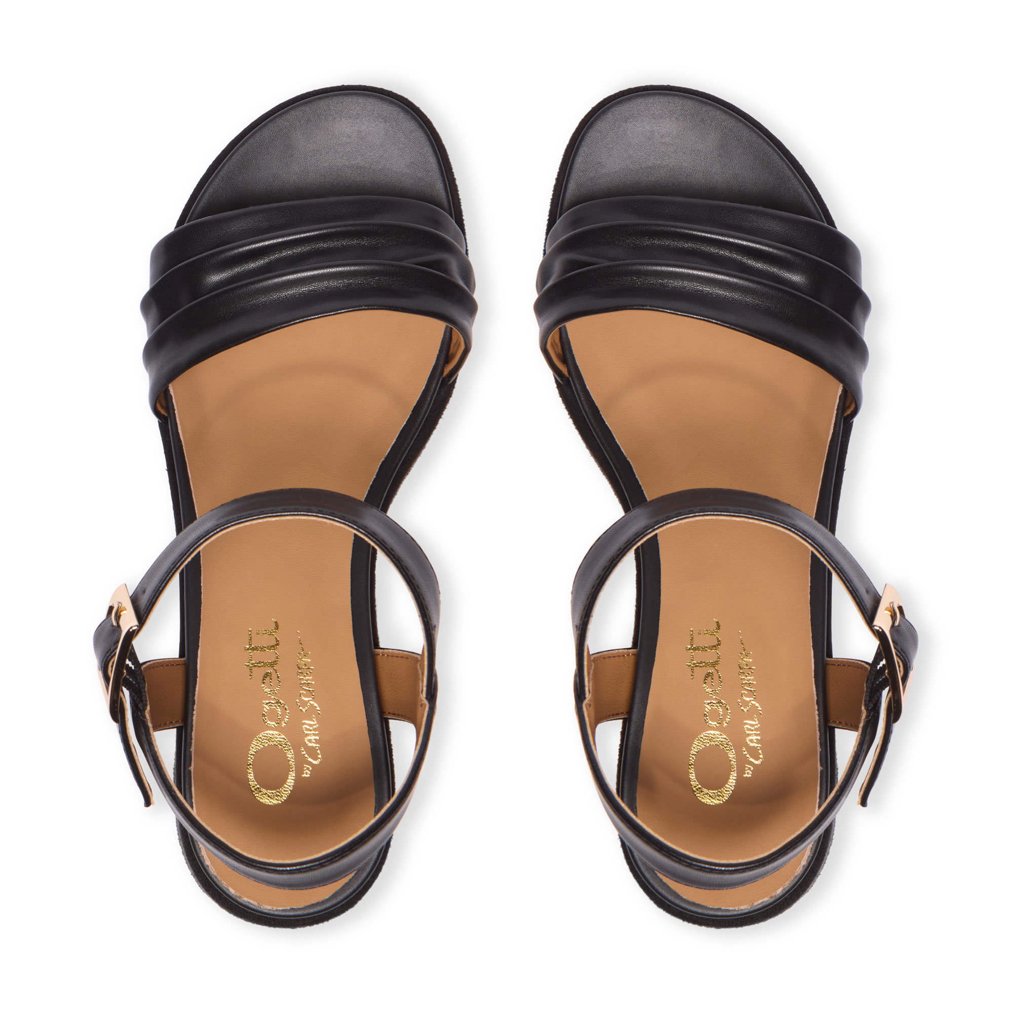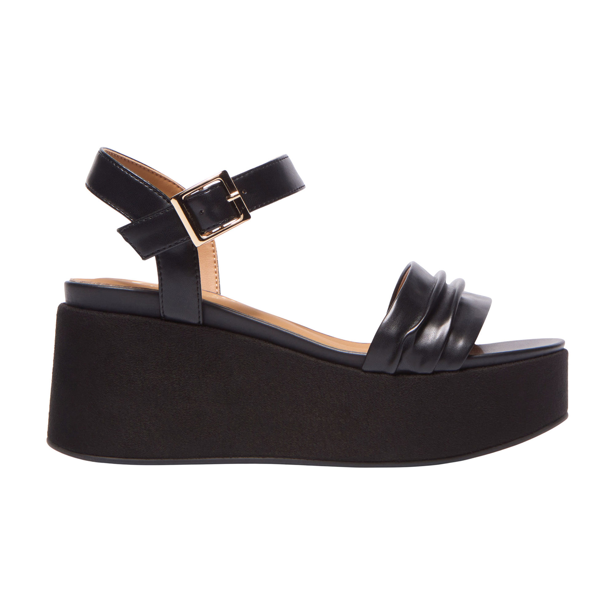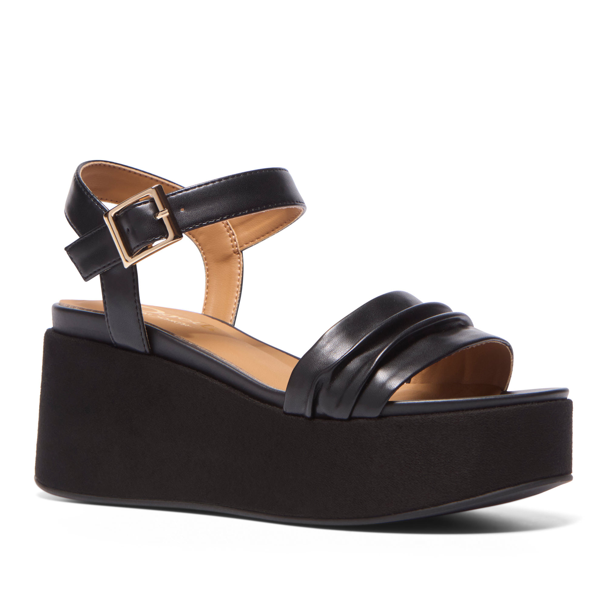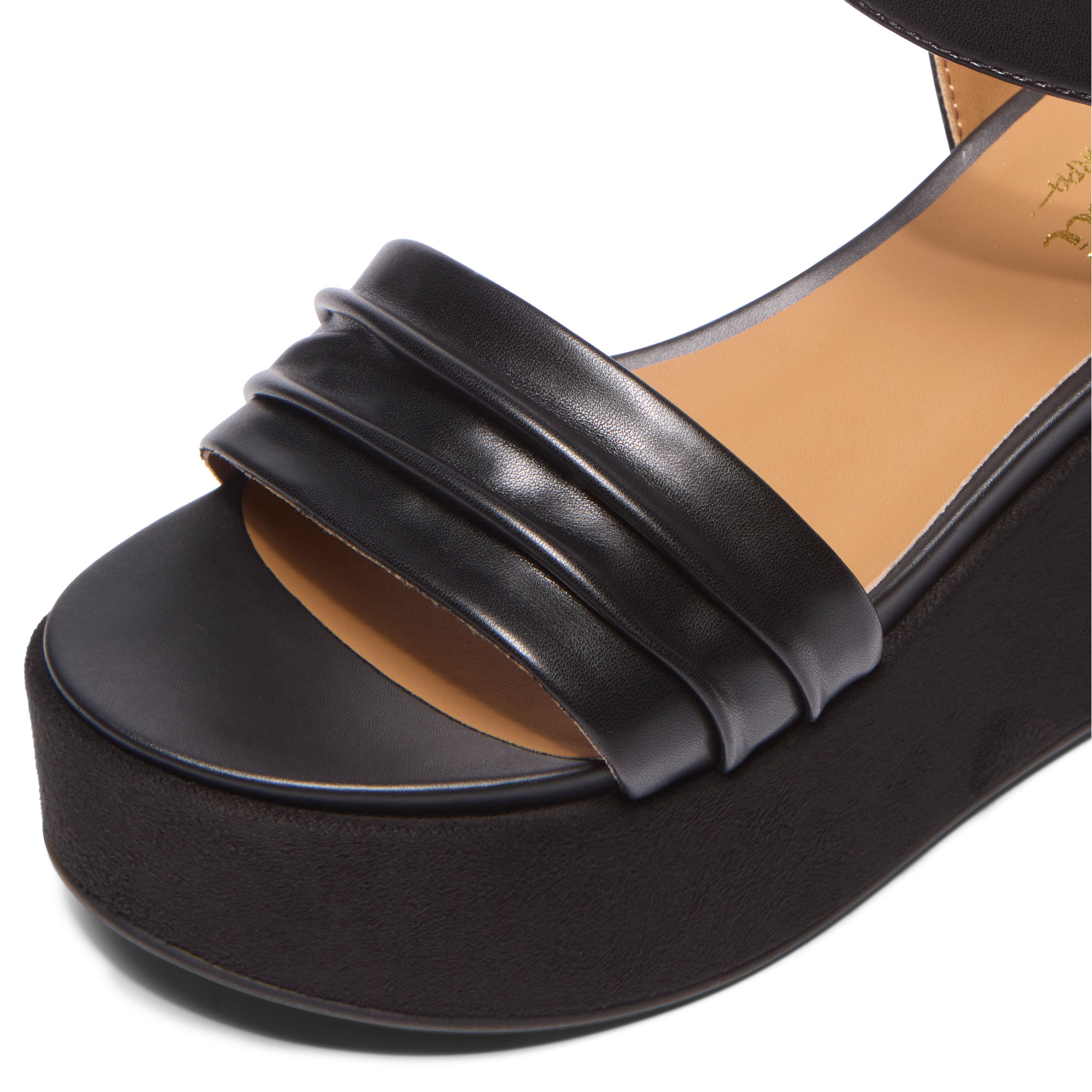 - Two-part back design, platform wedge sole, ruched upper, adjustable ankle fastening, polished silver-tone buckle fastening, soft leather sock