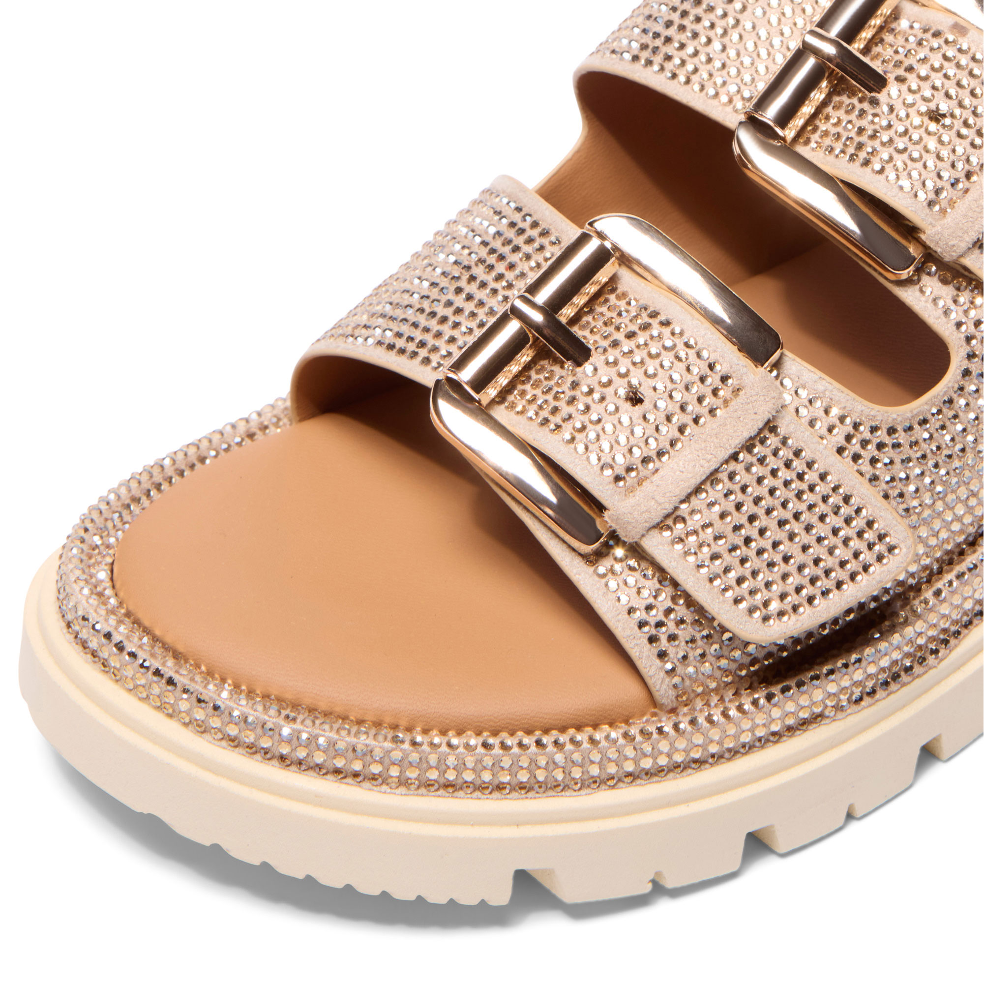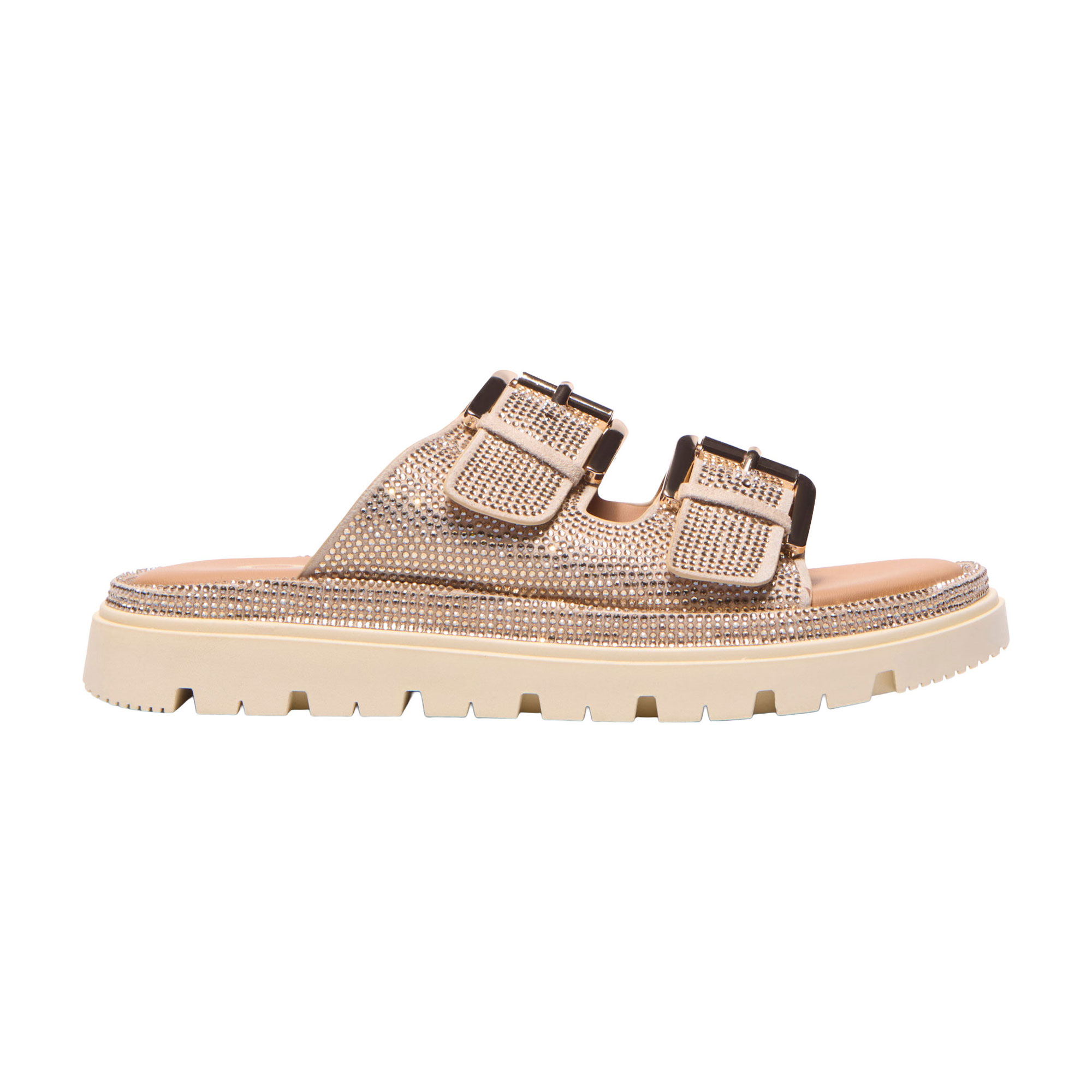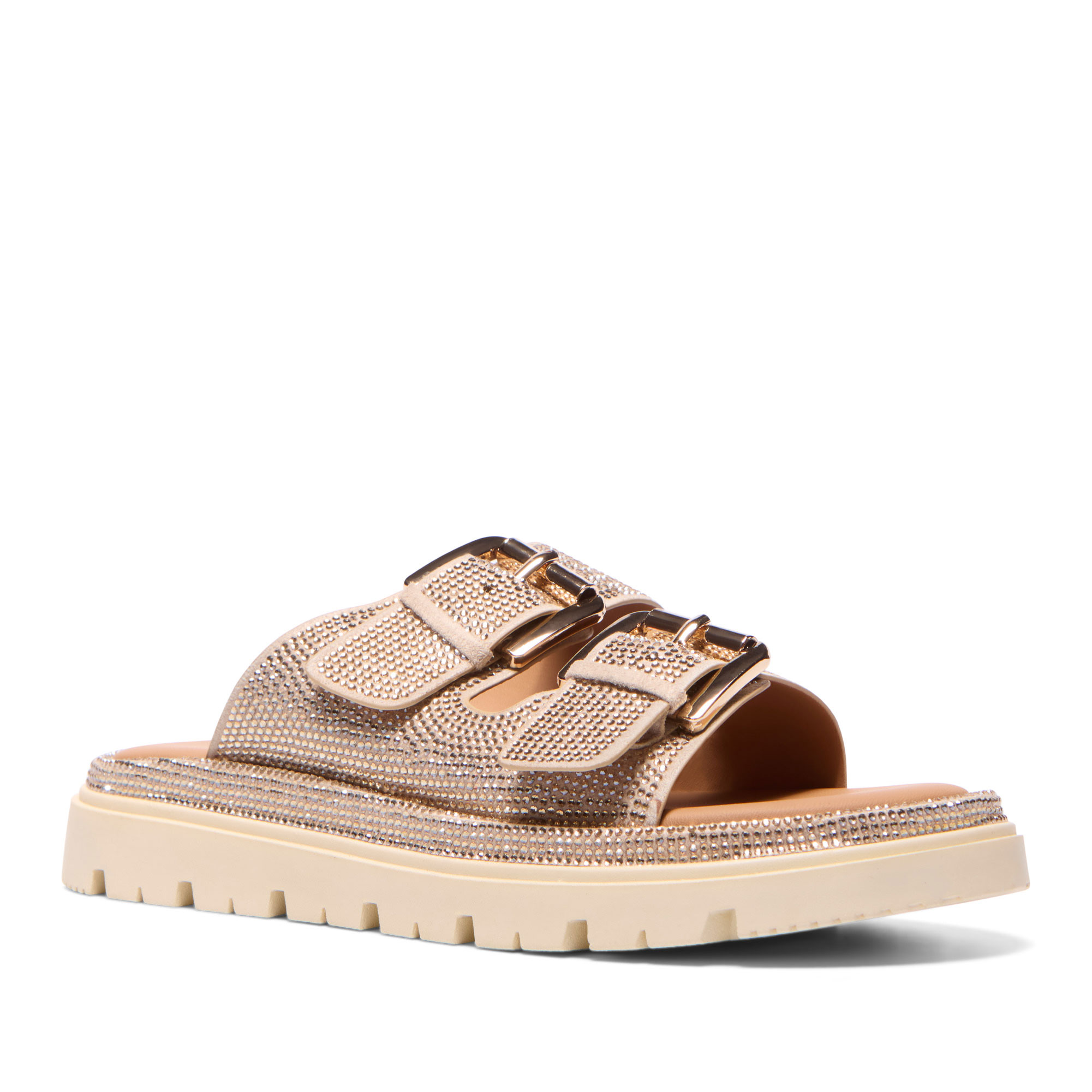 - Adjustable buckles, mule slider style, chunky cleated outsole, soft memory foam insole, dual straps with keepers, polished pin buckle hardware