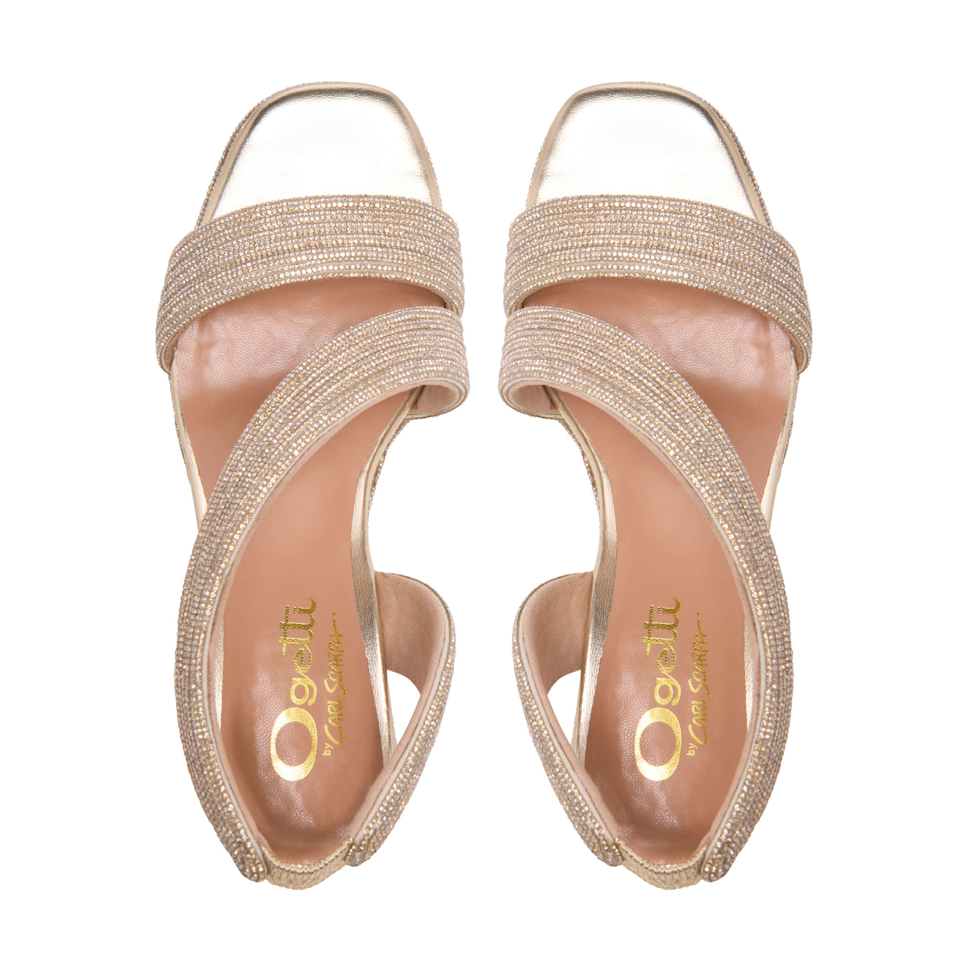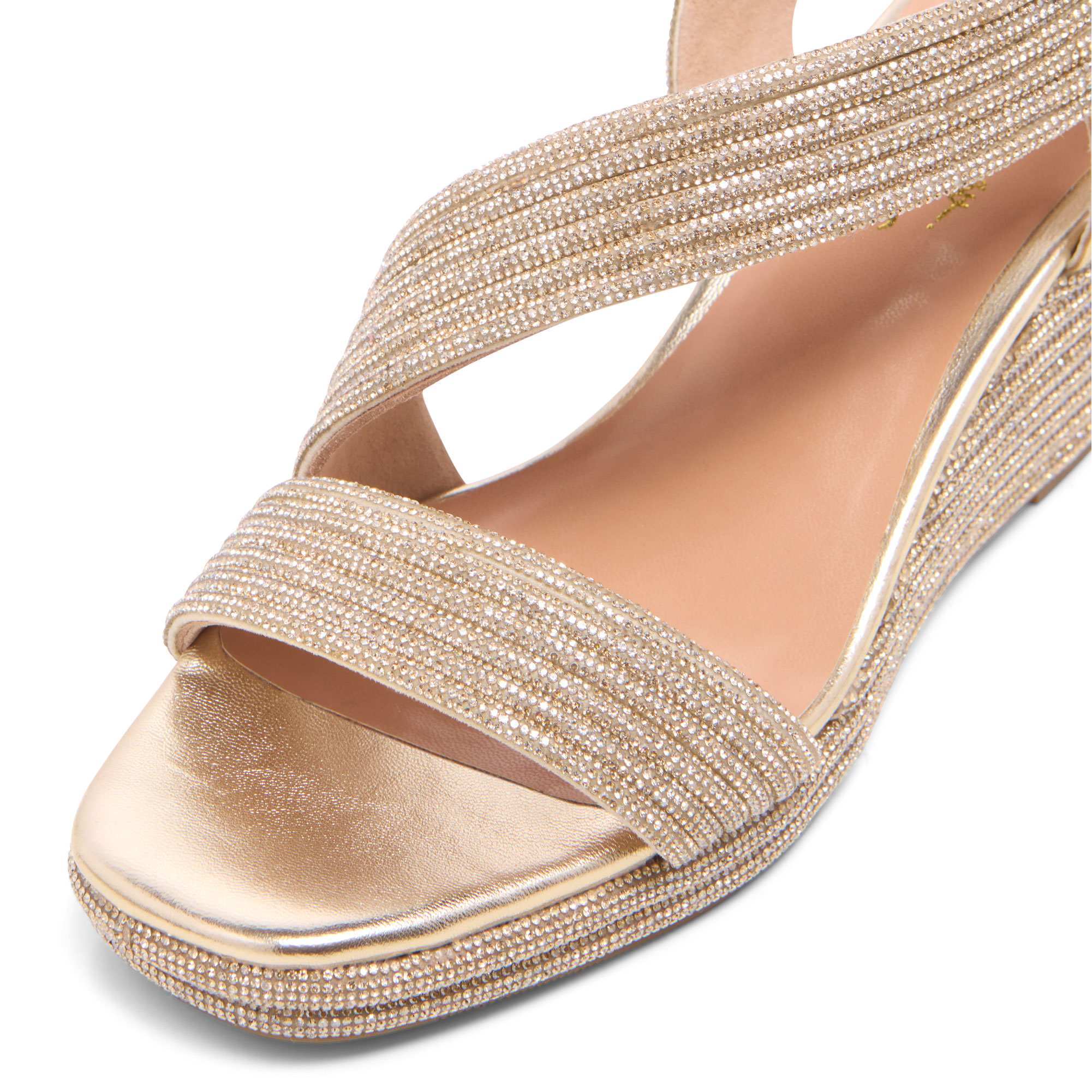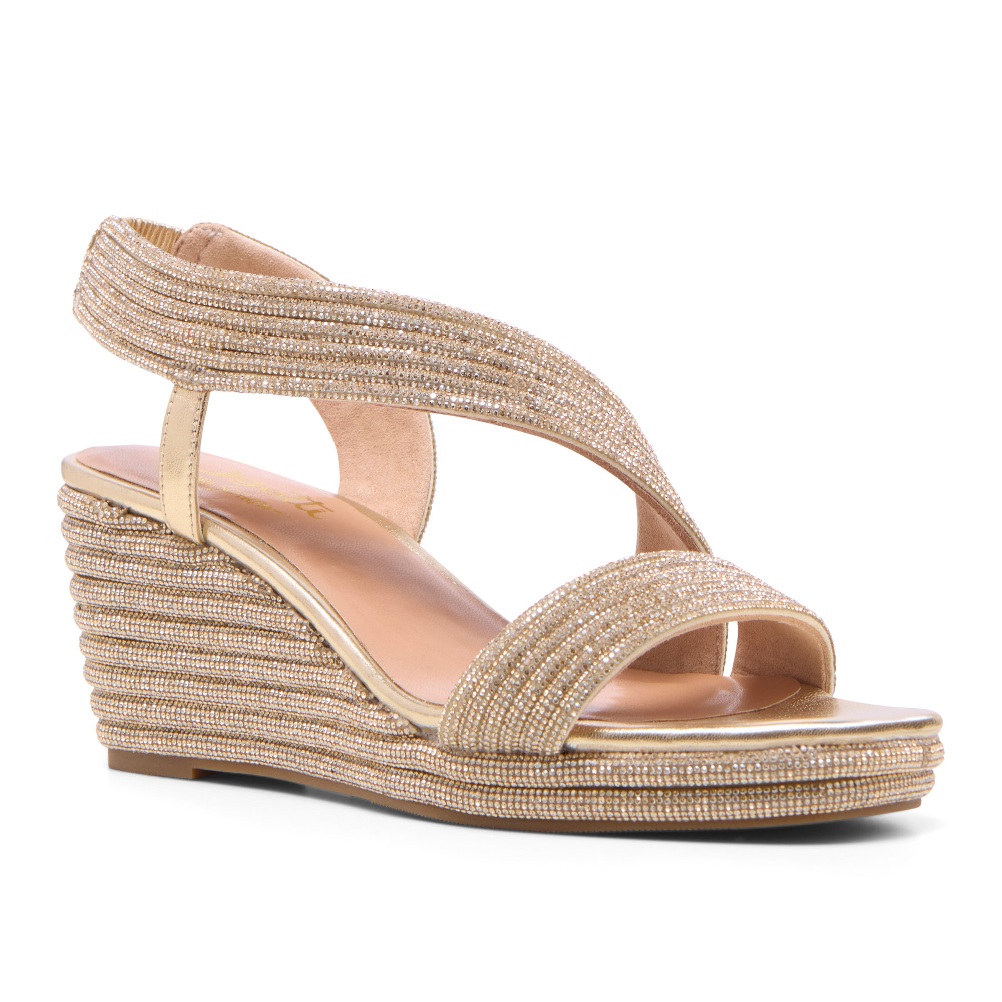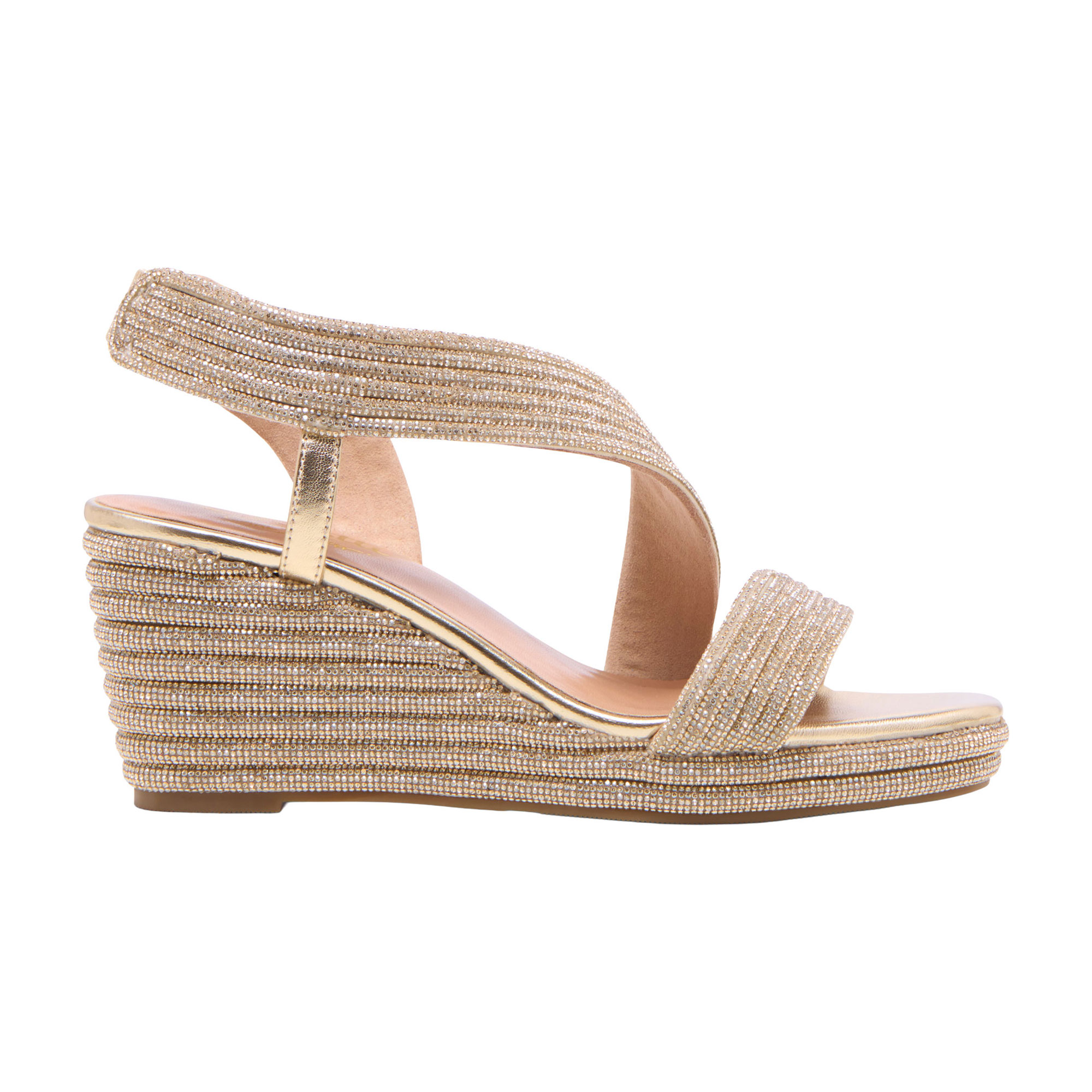 - Asymmetric style, crystal embellishment, cushioned straps, wedge sole, slip-on style, elasticated heel, curved cushioned straps, flexible elasticated heel