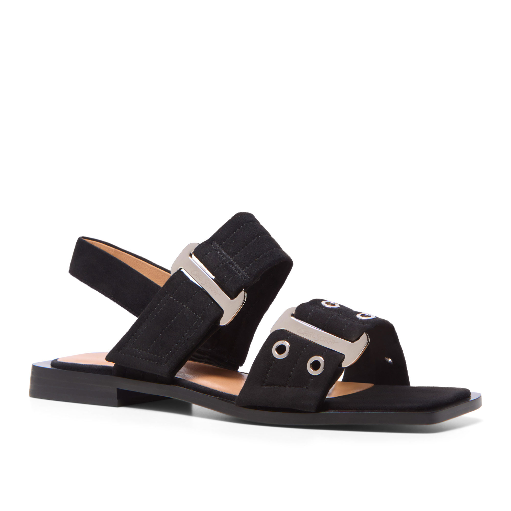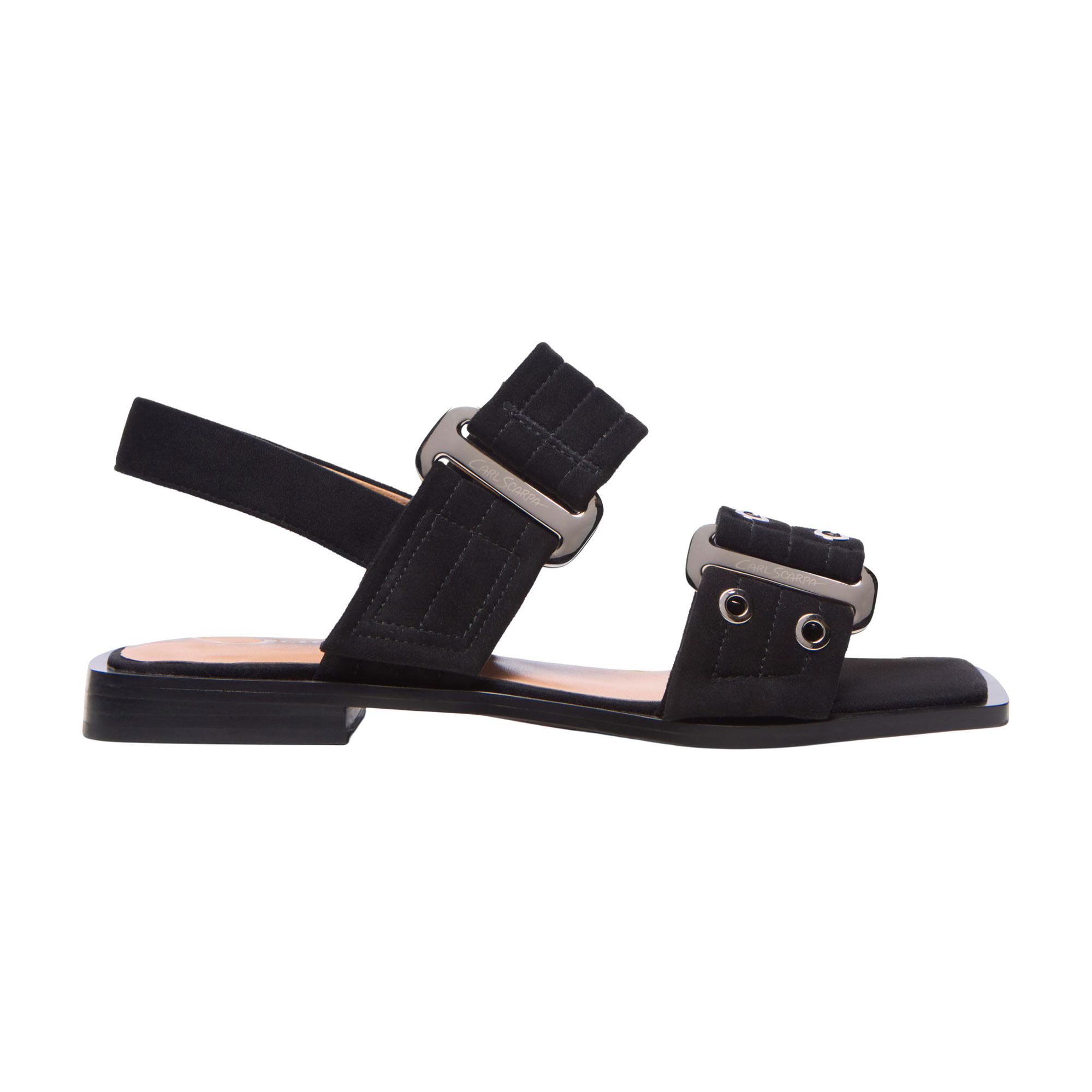 - Square toe, low heel, slingback silhouette, three-strap upper, instep and toe straps, tape and loop fastening, quilted detailing, polished hardware, logo detail, suede finish