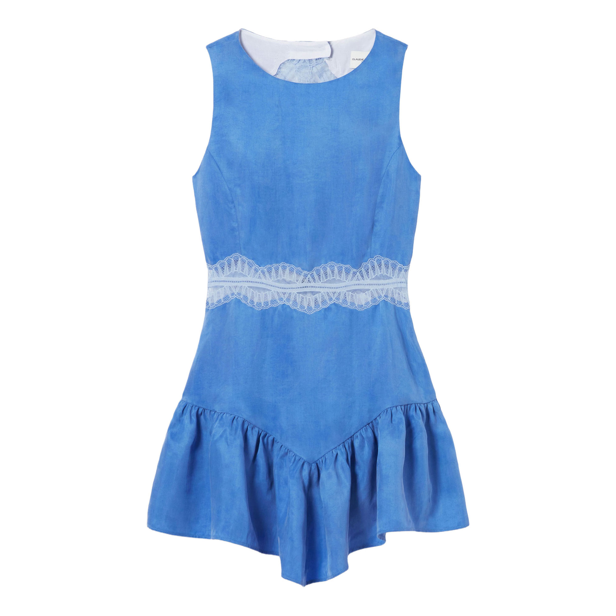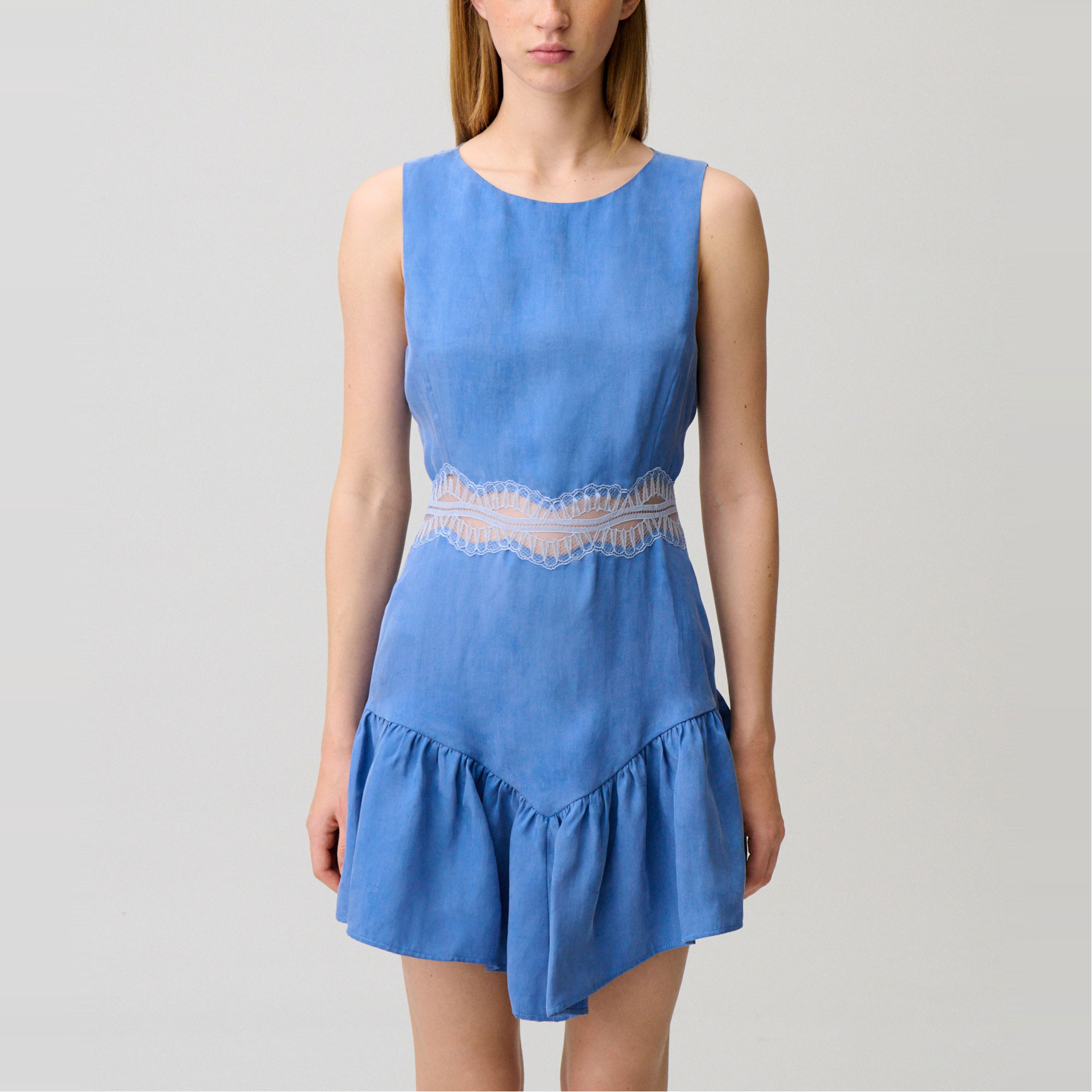 - Sleeveless, mini length, open back, contras lace detailing, round neckline, V-shaped panel, gathering, diamond shape at the back, invisible zip and hook fastening, layered upper back, invisible snap fasteners