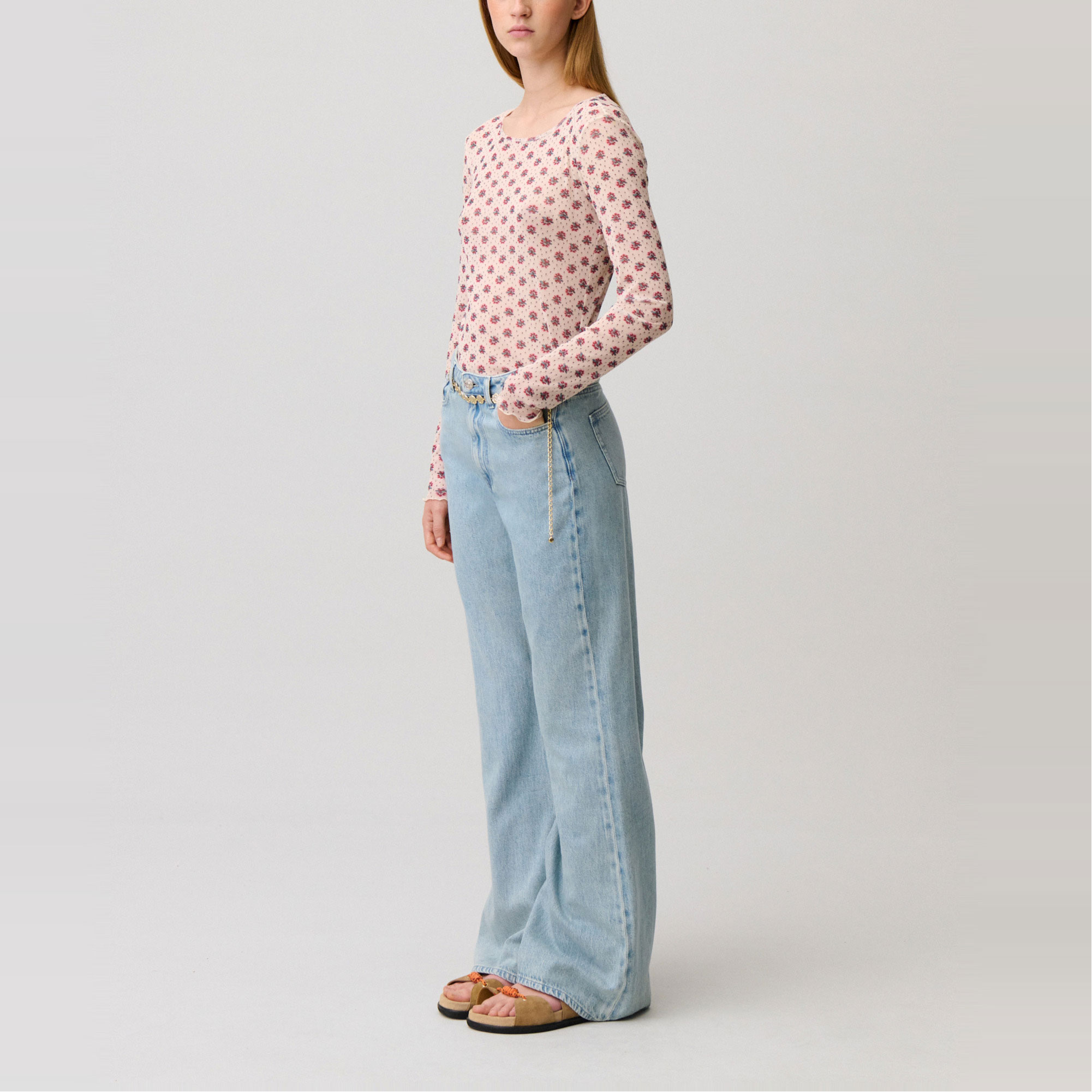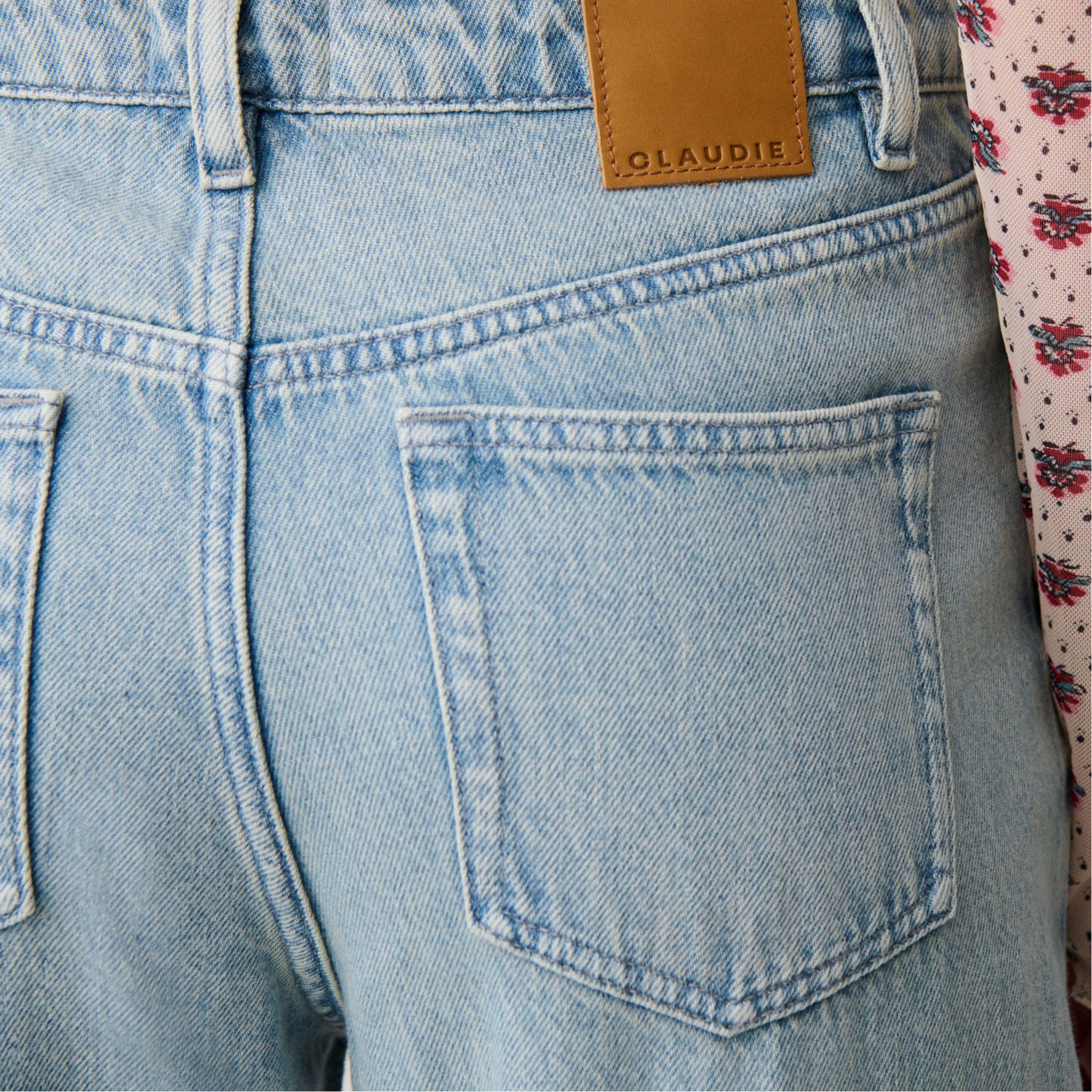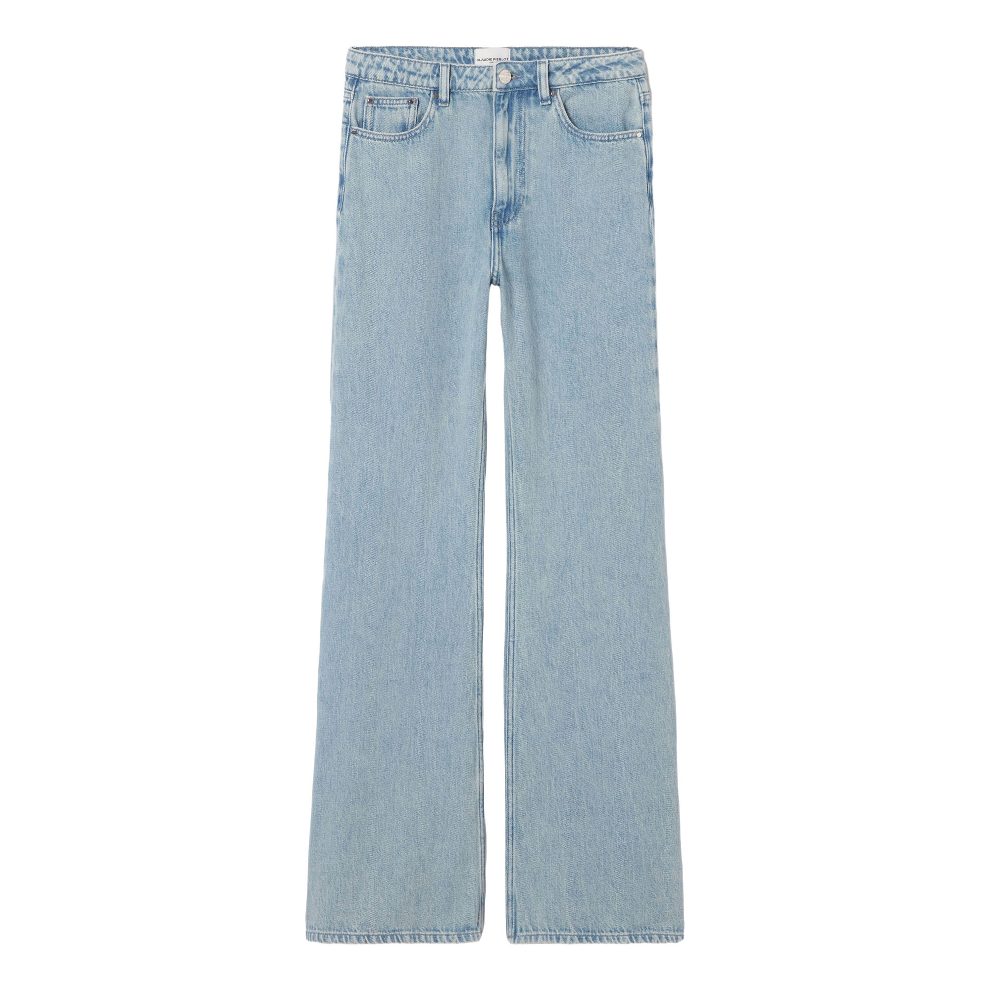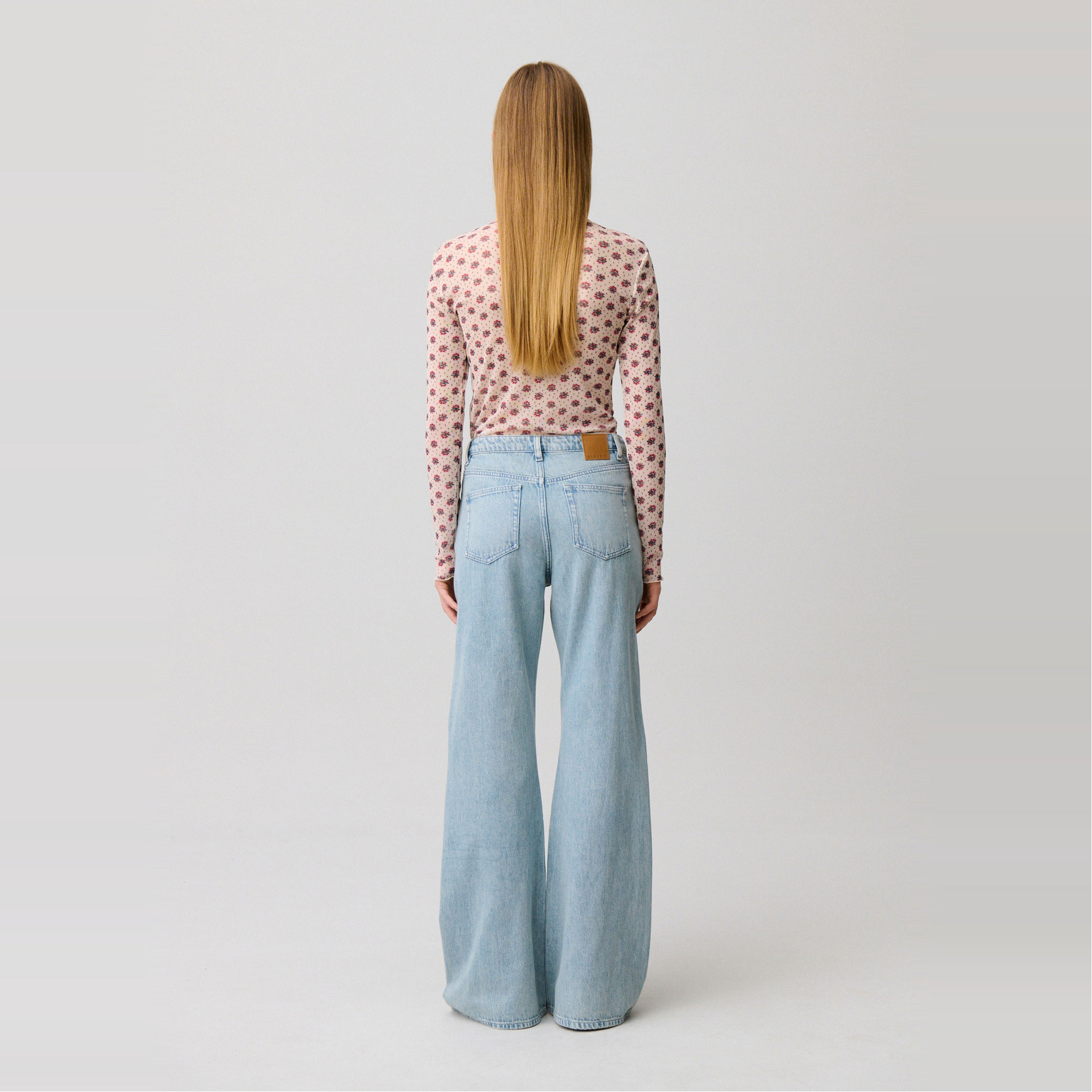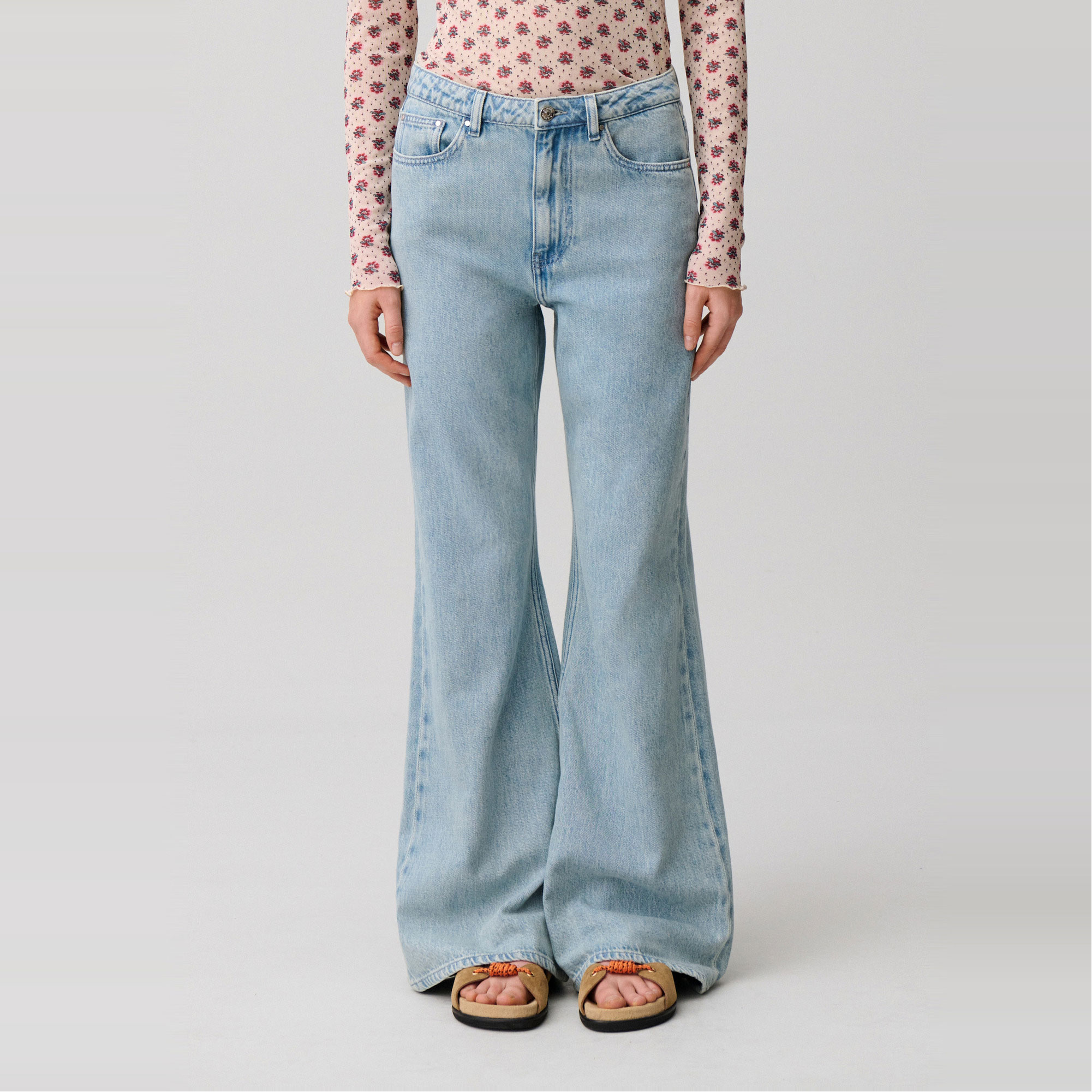 - Flared, denim fabric, five belt loops, front zip fastening, button fastening, square leather patch, two front pockets, one ticket pocket, two back patch pockets