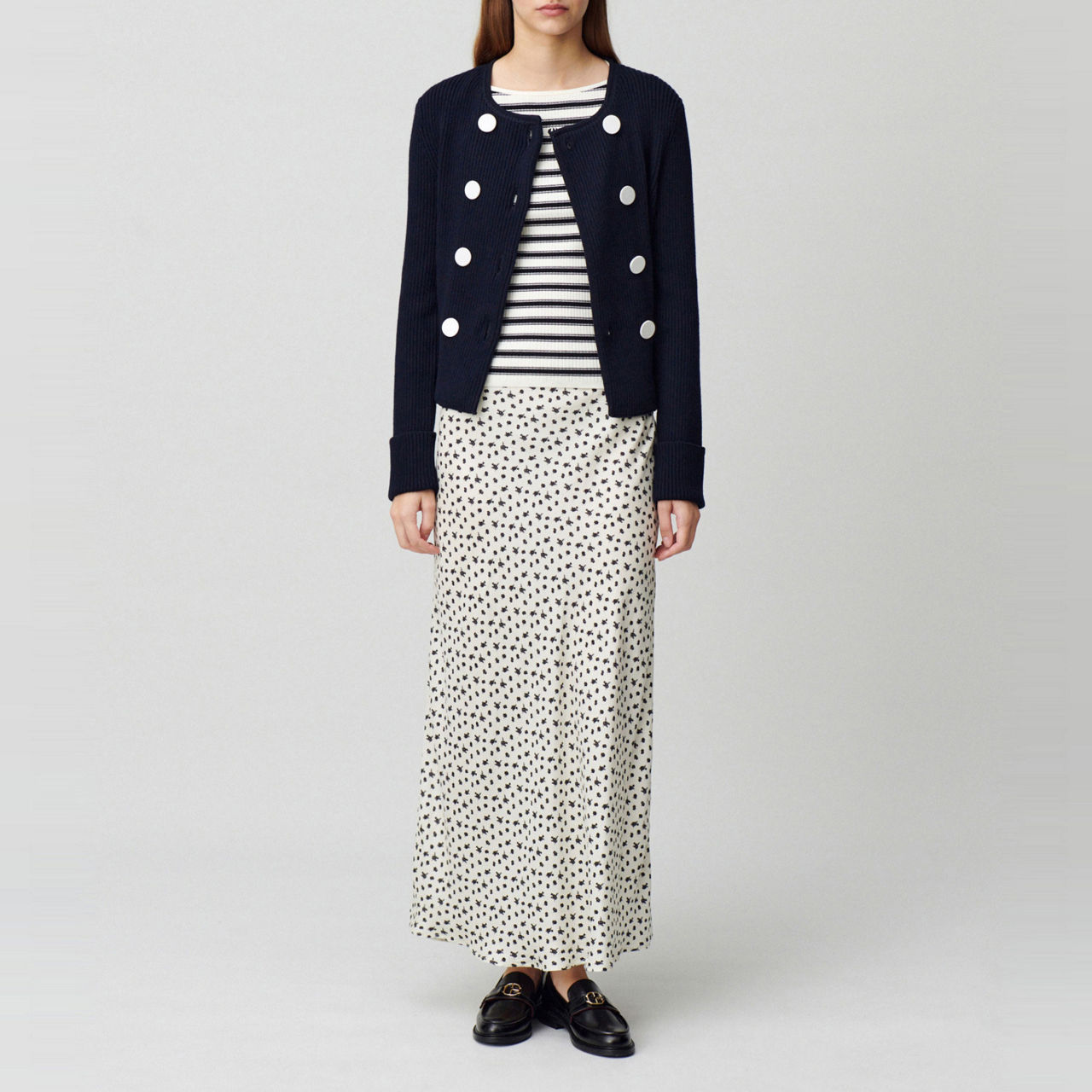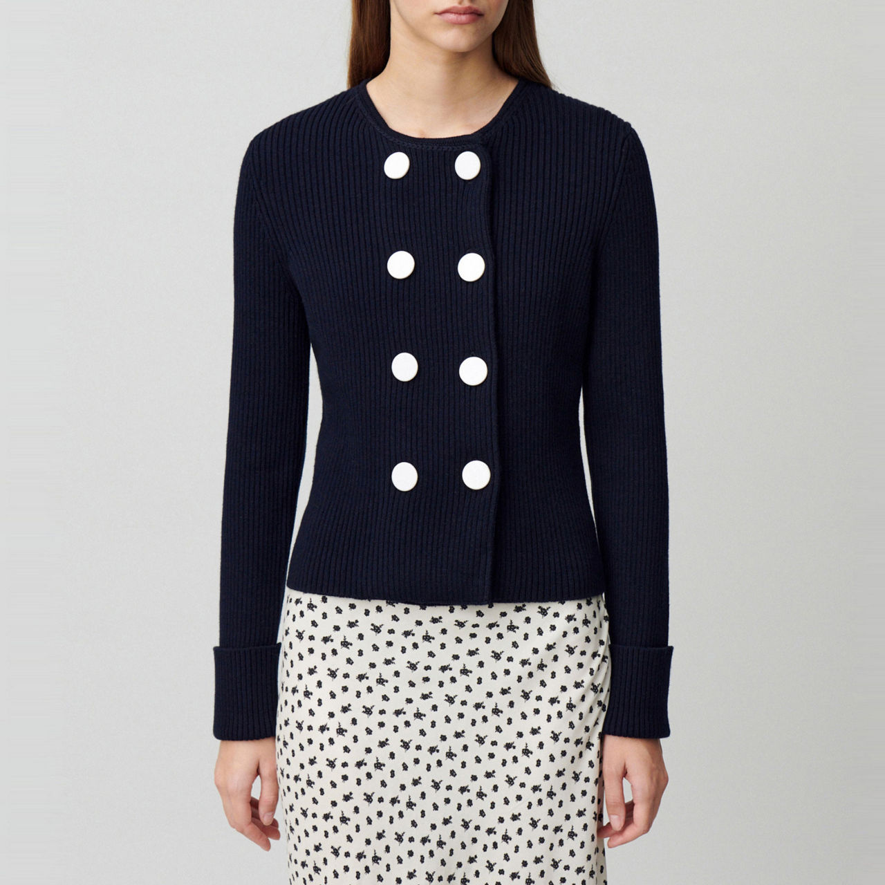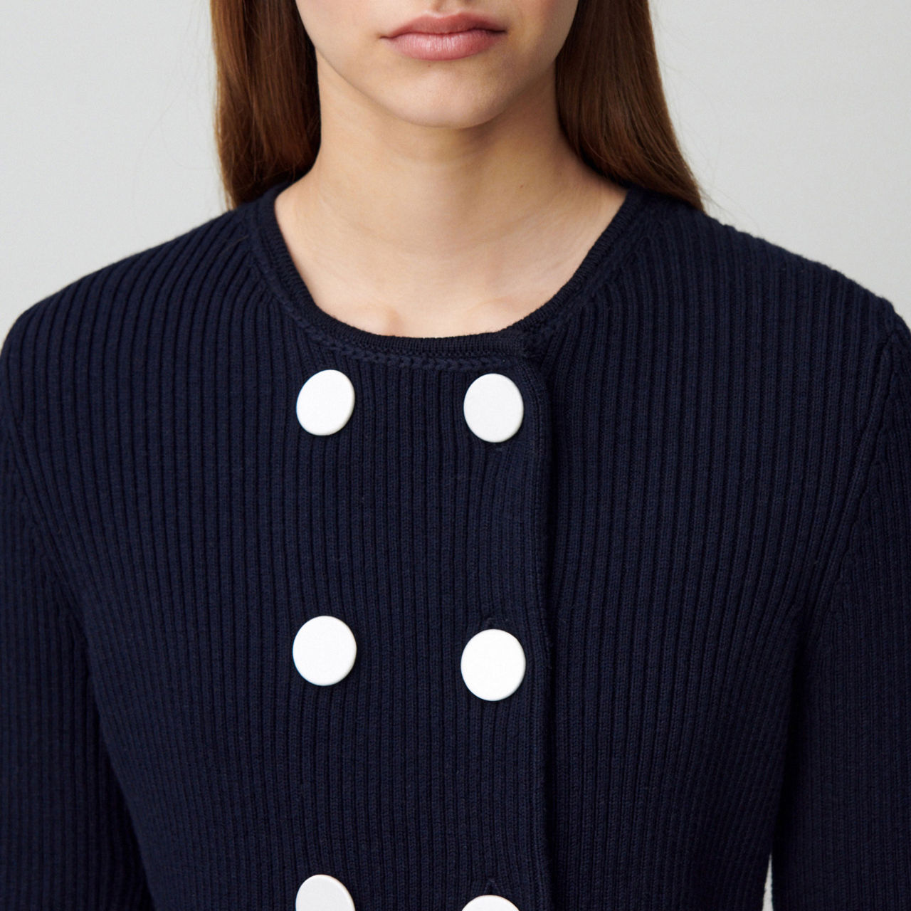 - Long sleeves, round neckline, double-breasted, button fastening, straight hemline, ribbed-knit finish