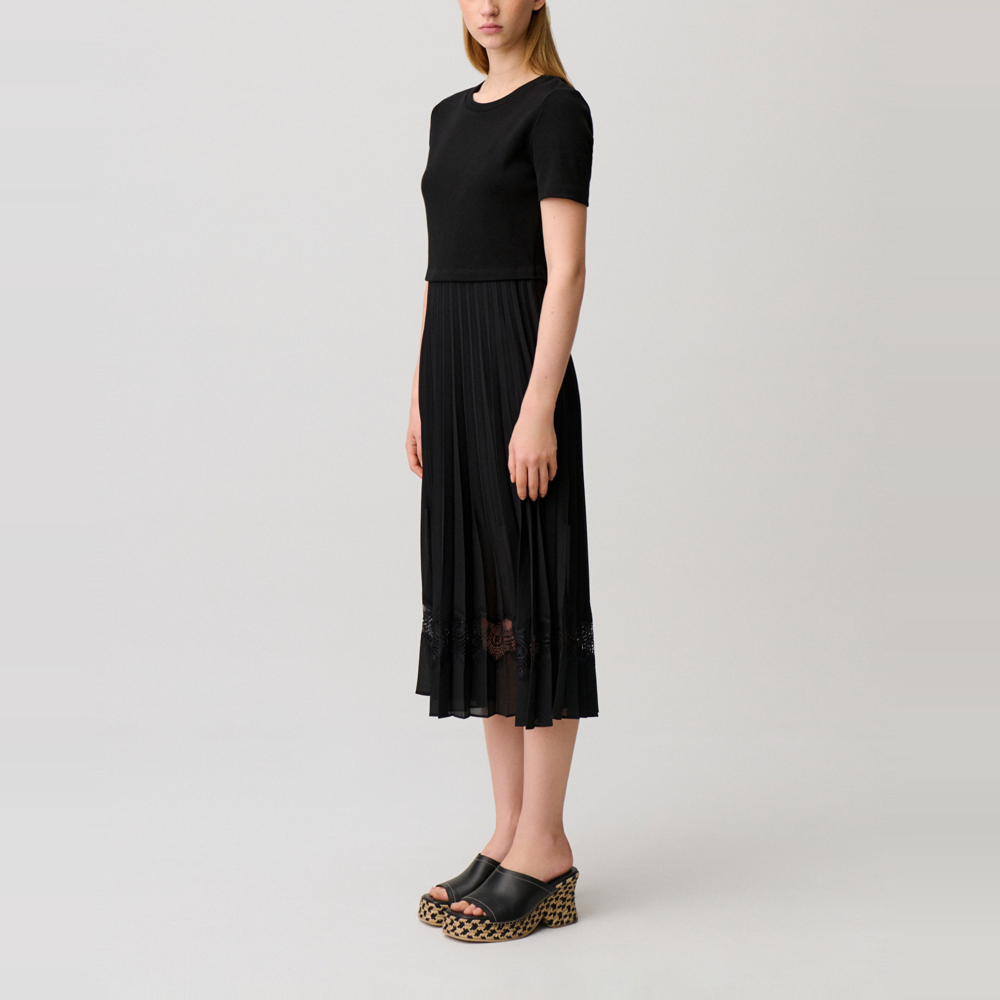 - Round neck, pleated skirt, lace detail, short sleeves, midi length.