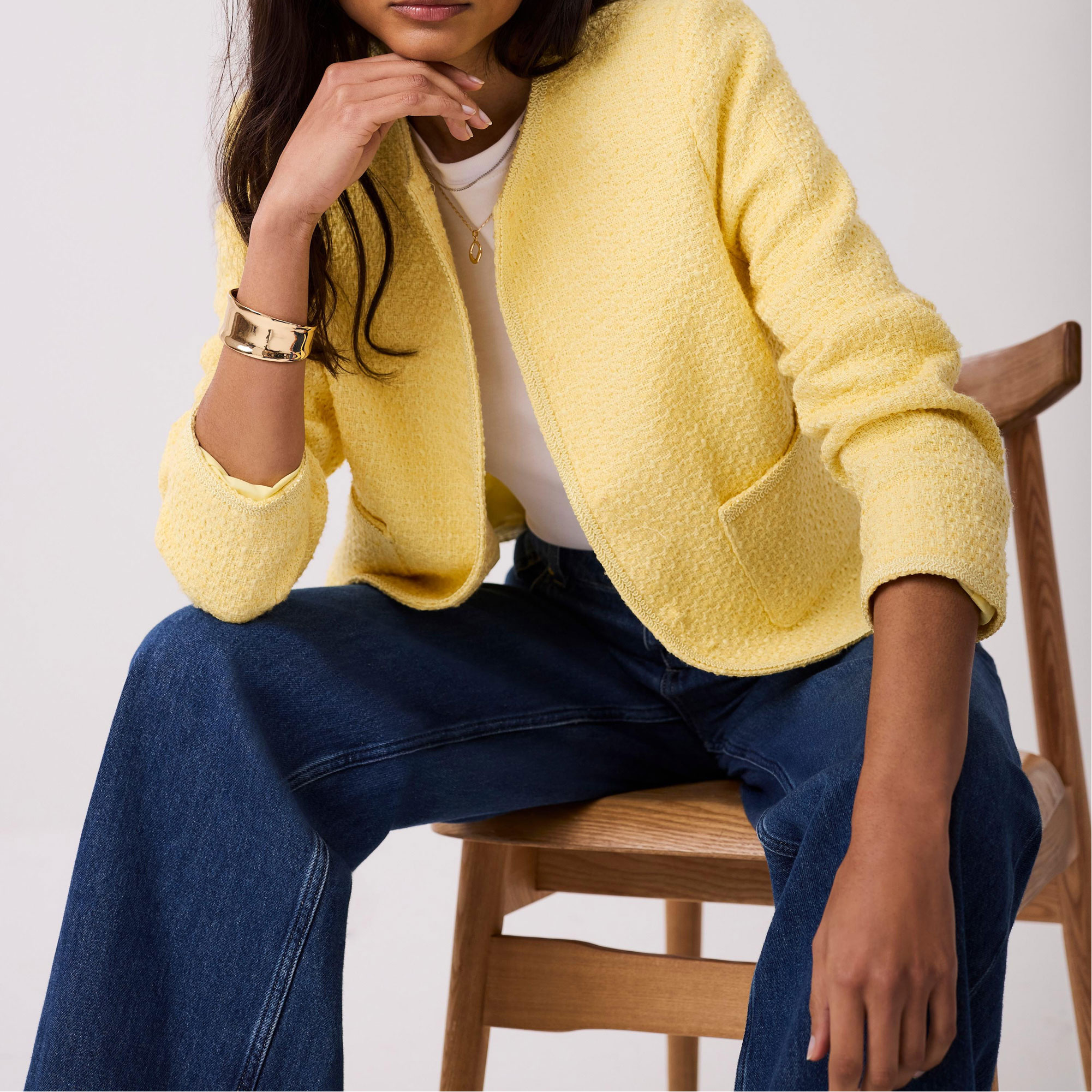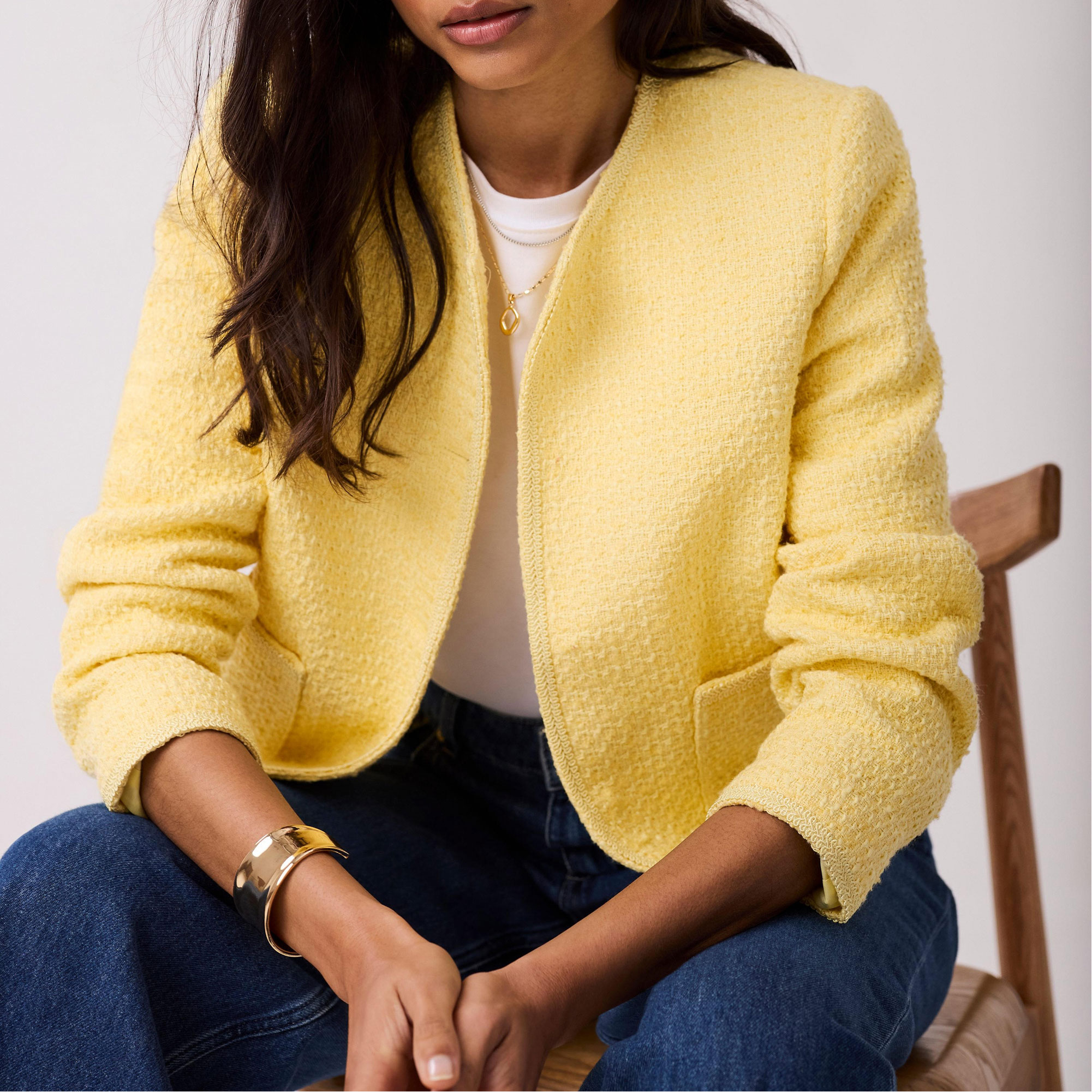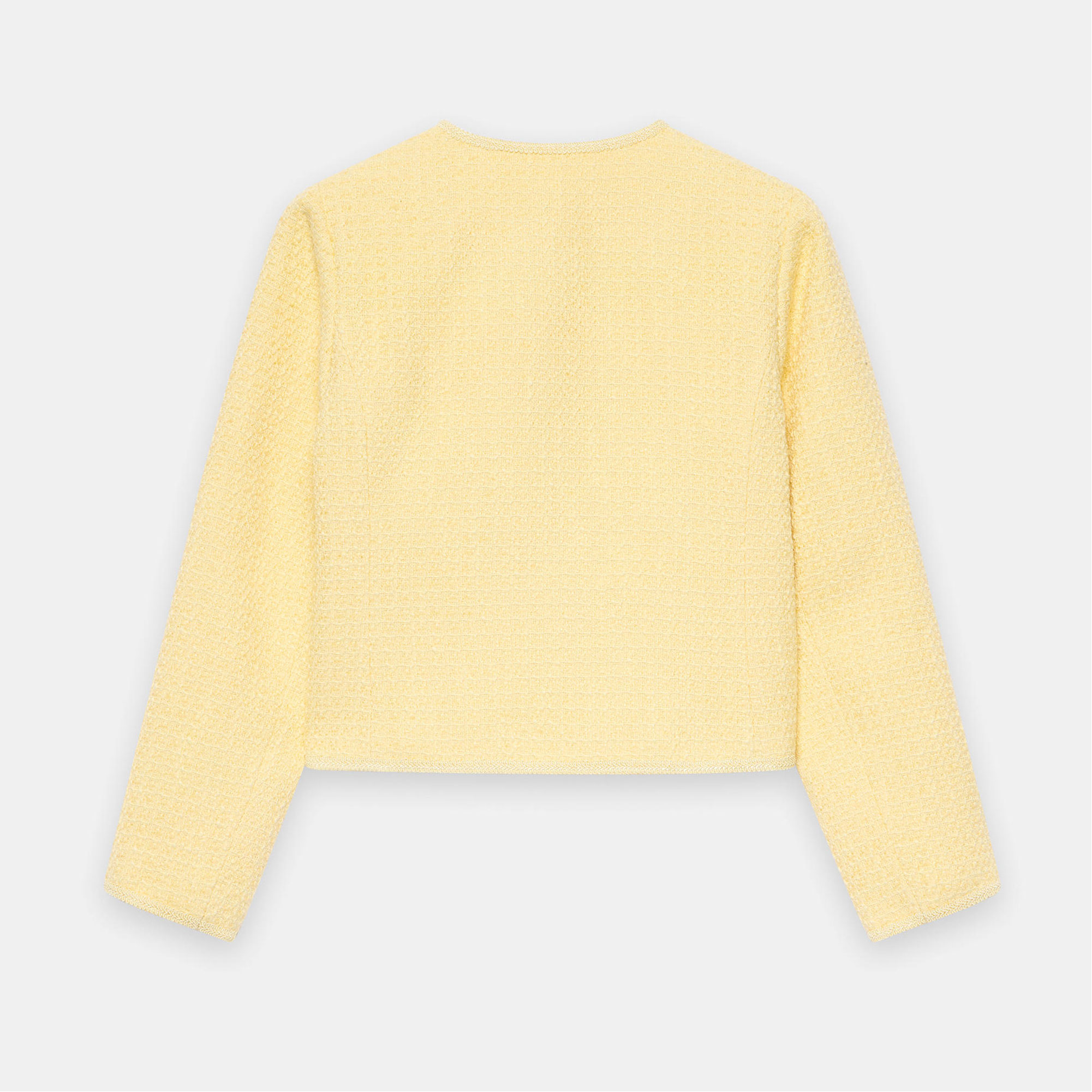 • Bouclé style, collarless crew neckline, three-quarter-length sleeves, square pockets, curved hemline