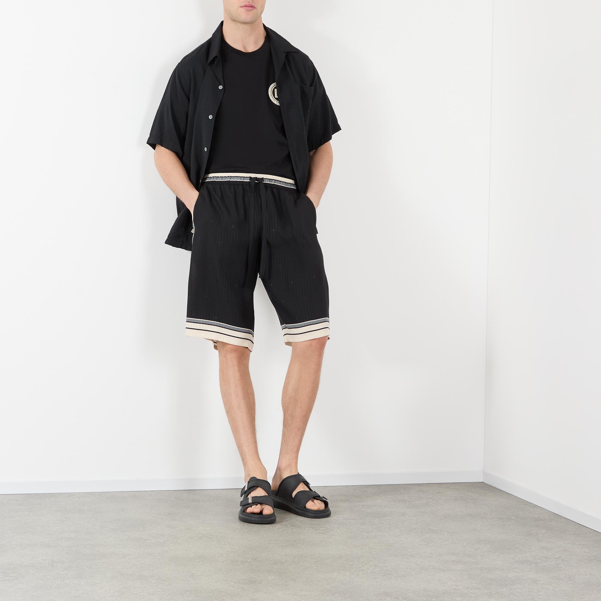 - Elasticated waistband with drawstring adjustable fit, French pockets to the front, rear back pocket with tucked edge, piping details, bermuda-style silhouette, stripe embellishment, logo print, smooth silk finish