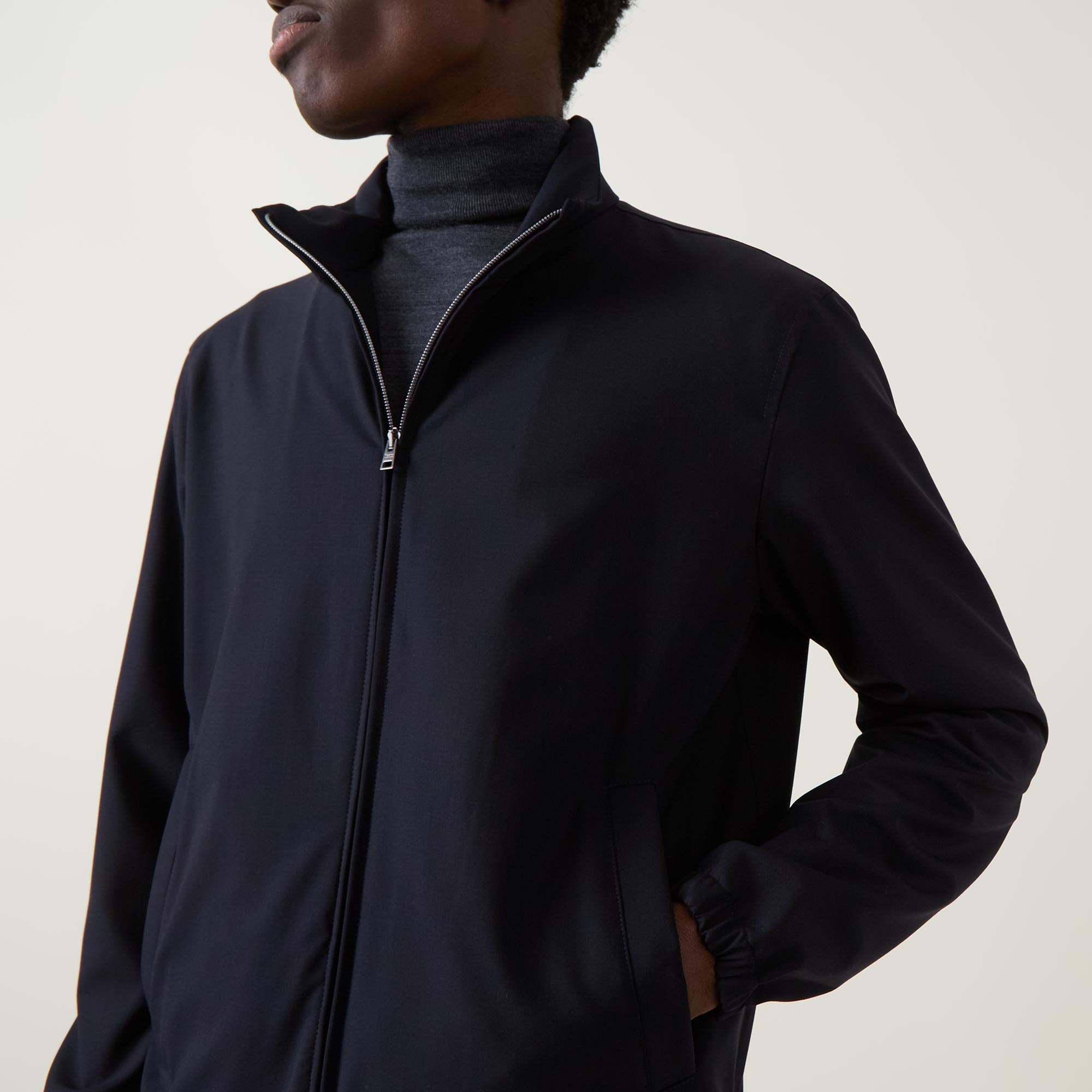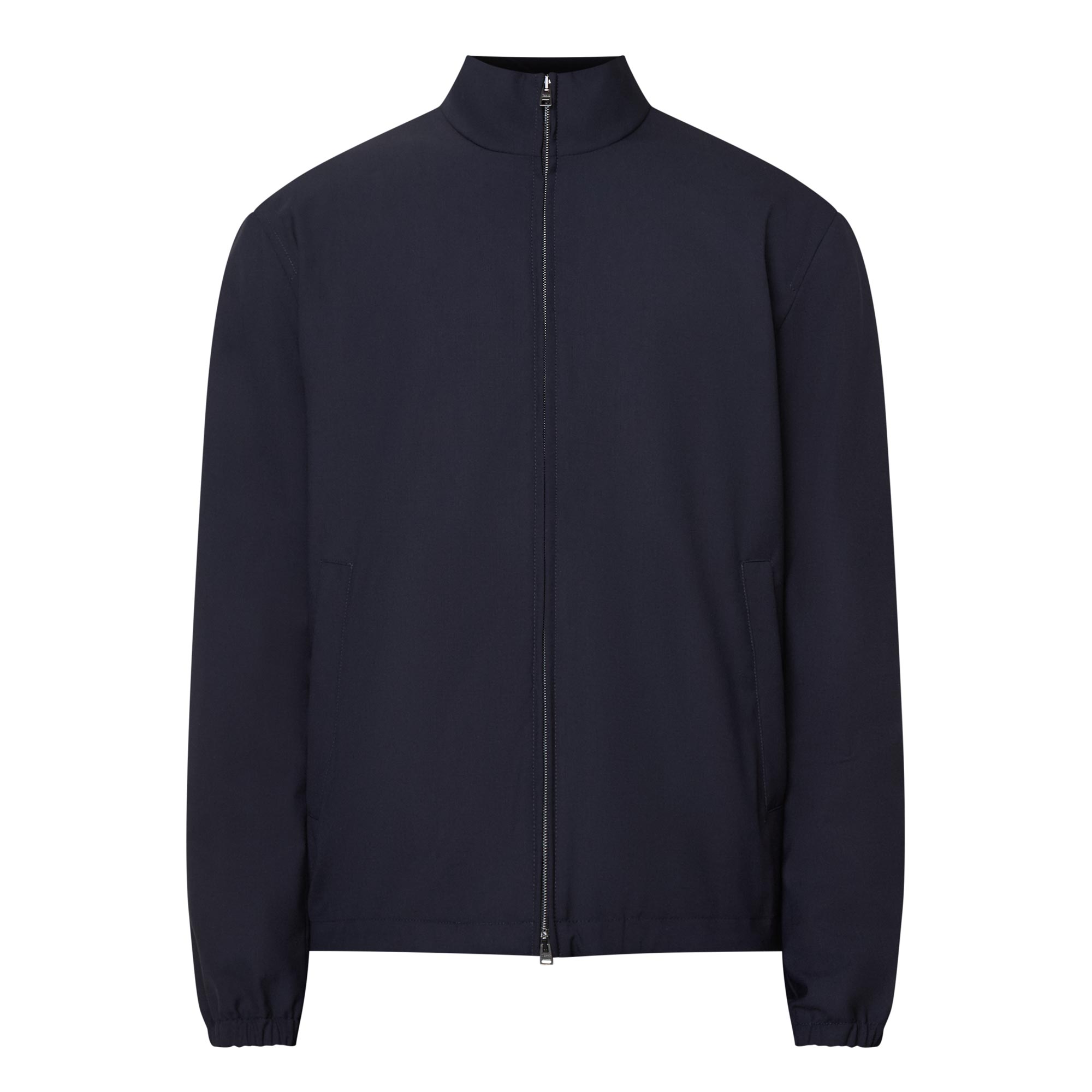- Stand-up collar, long sleeves, dropped shoulders, full zip-through fastening, two side in-seam pockets, elasticated cuffs, rear logo detail, straight hemline