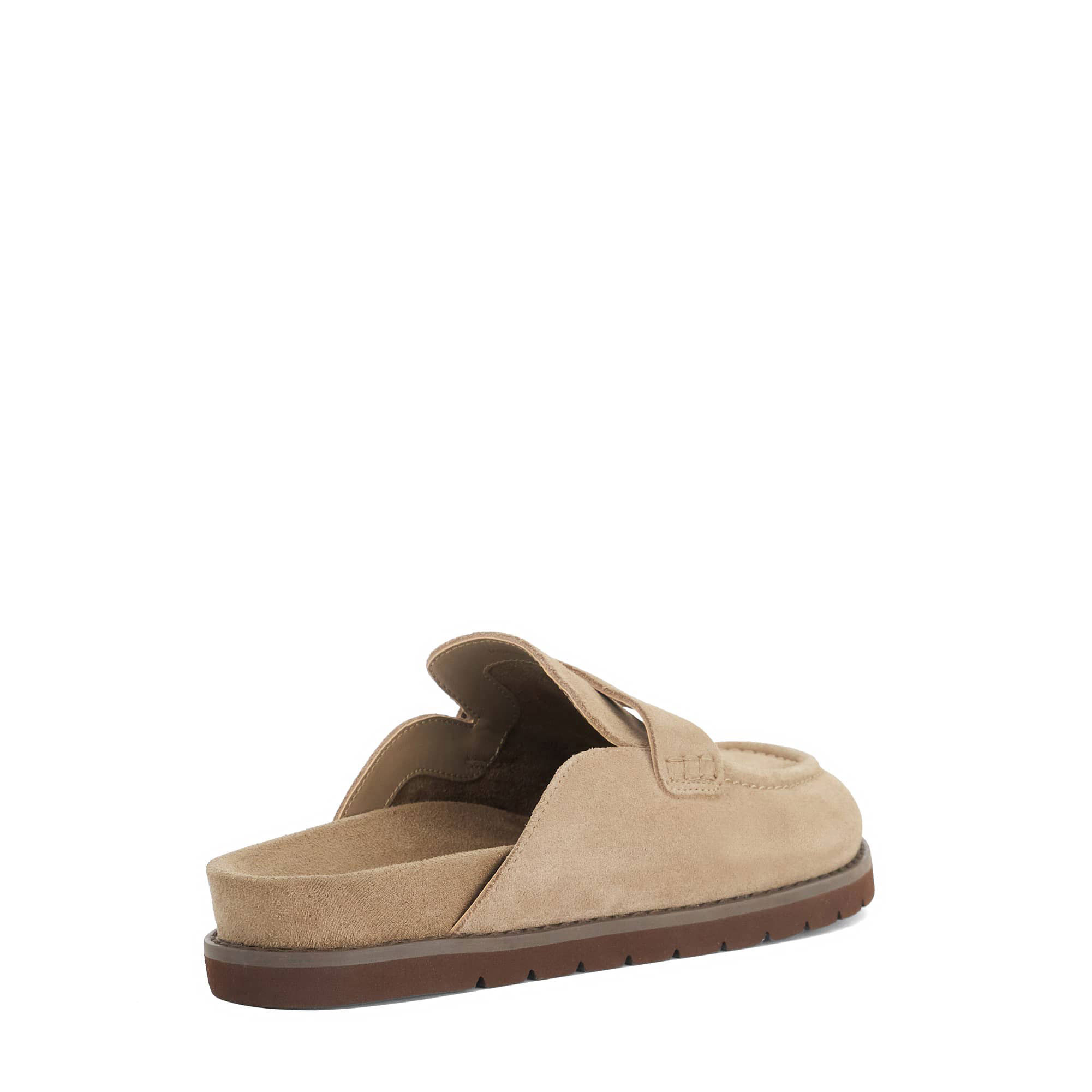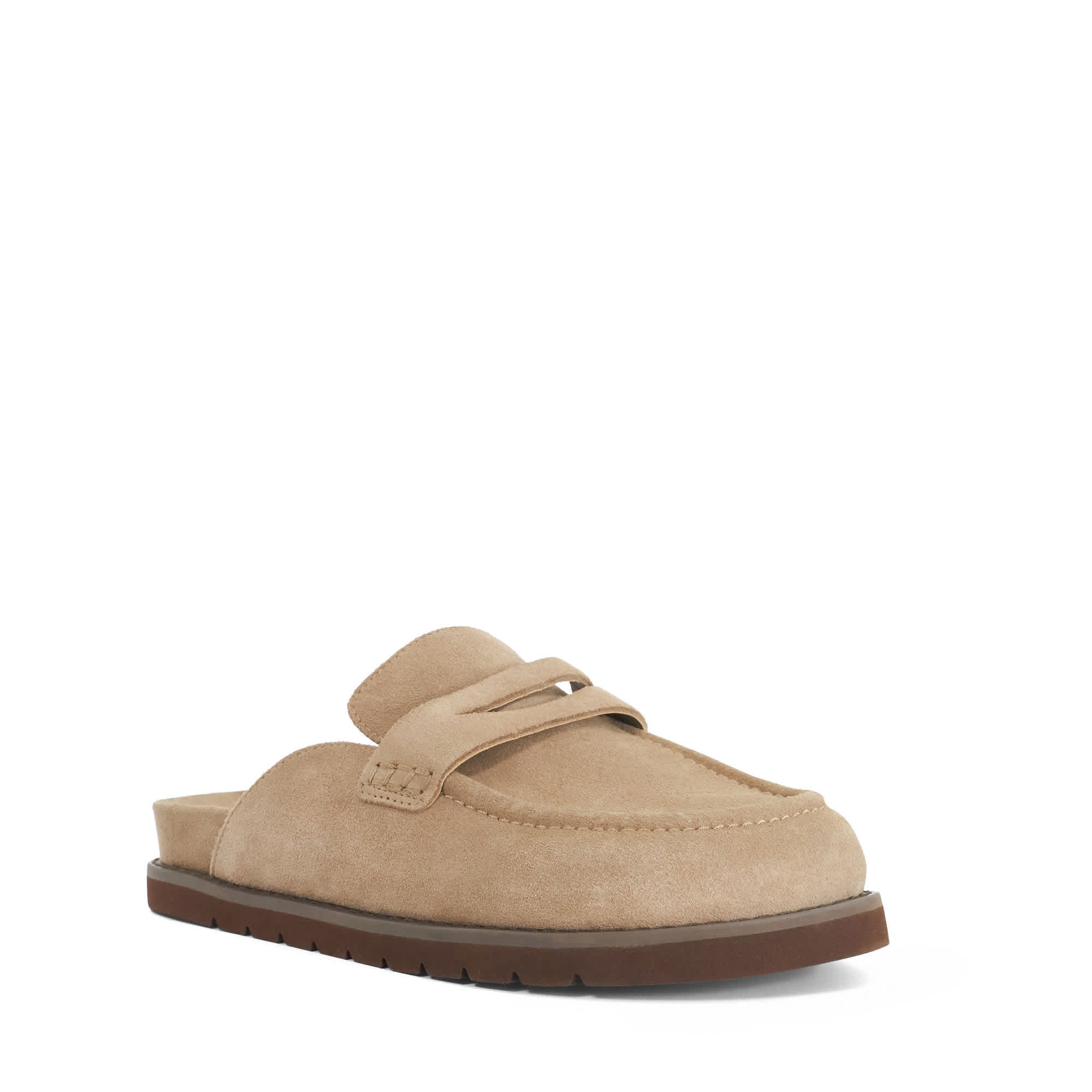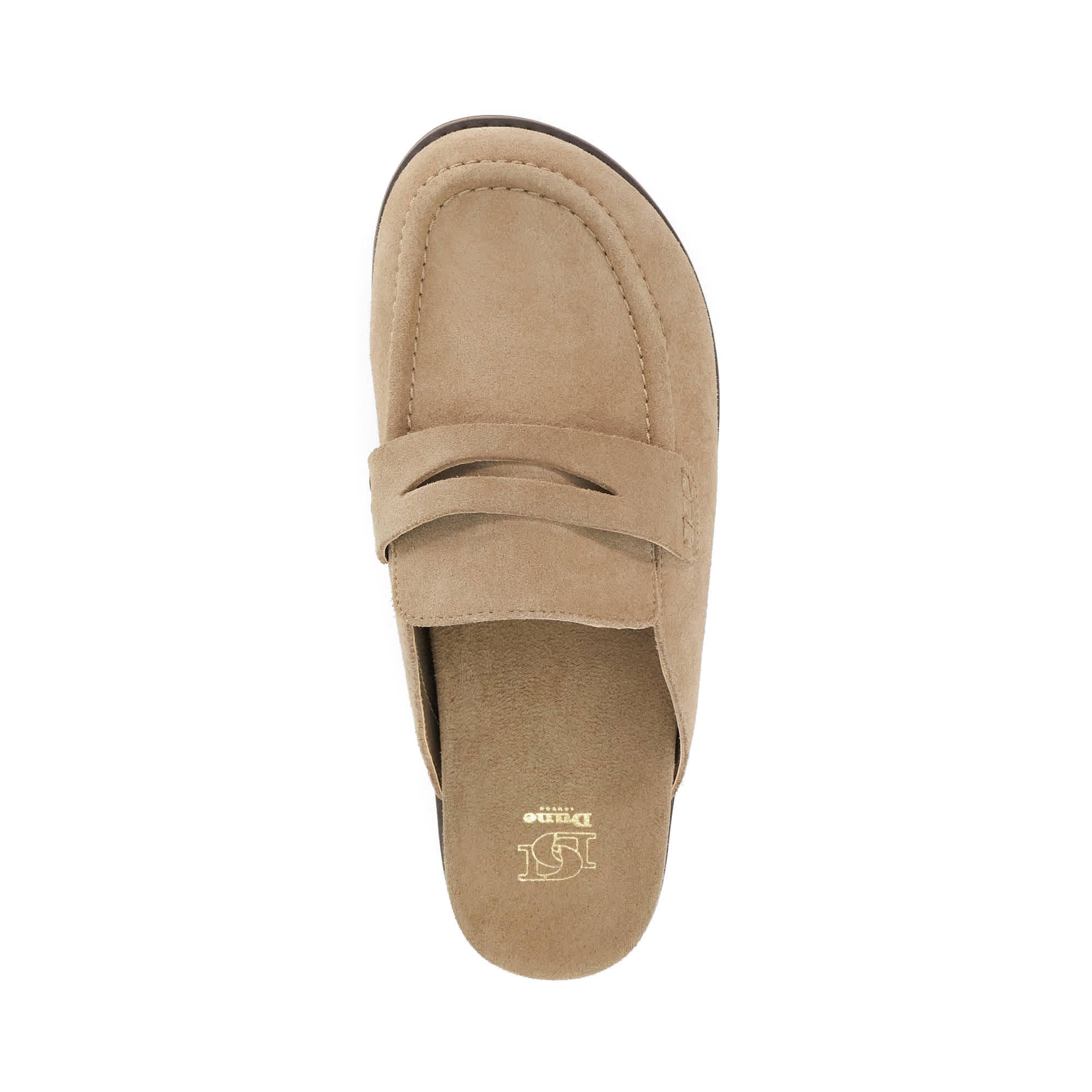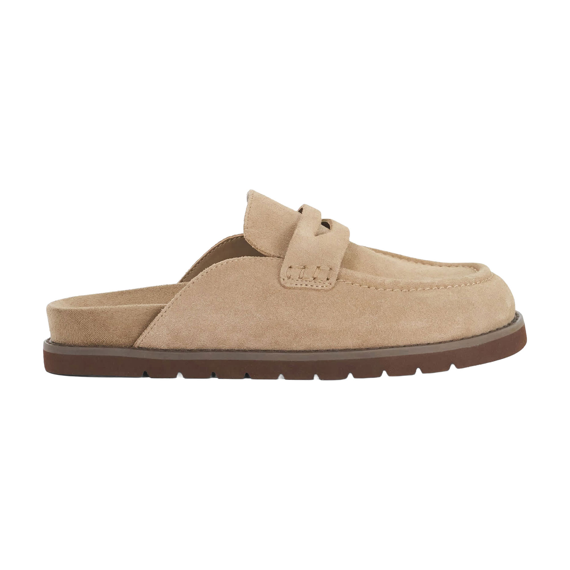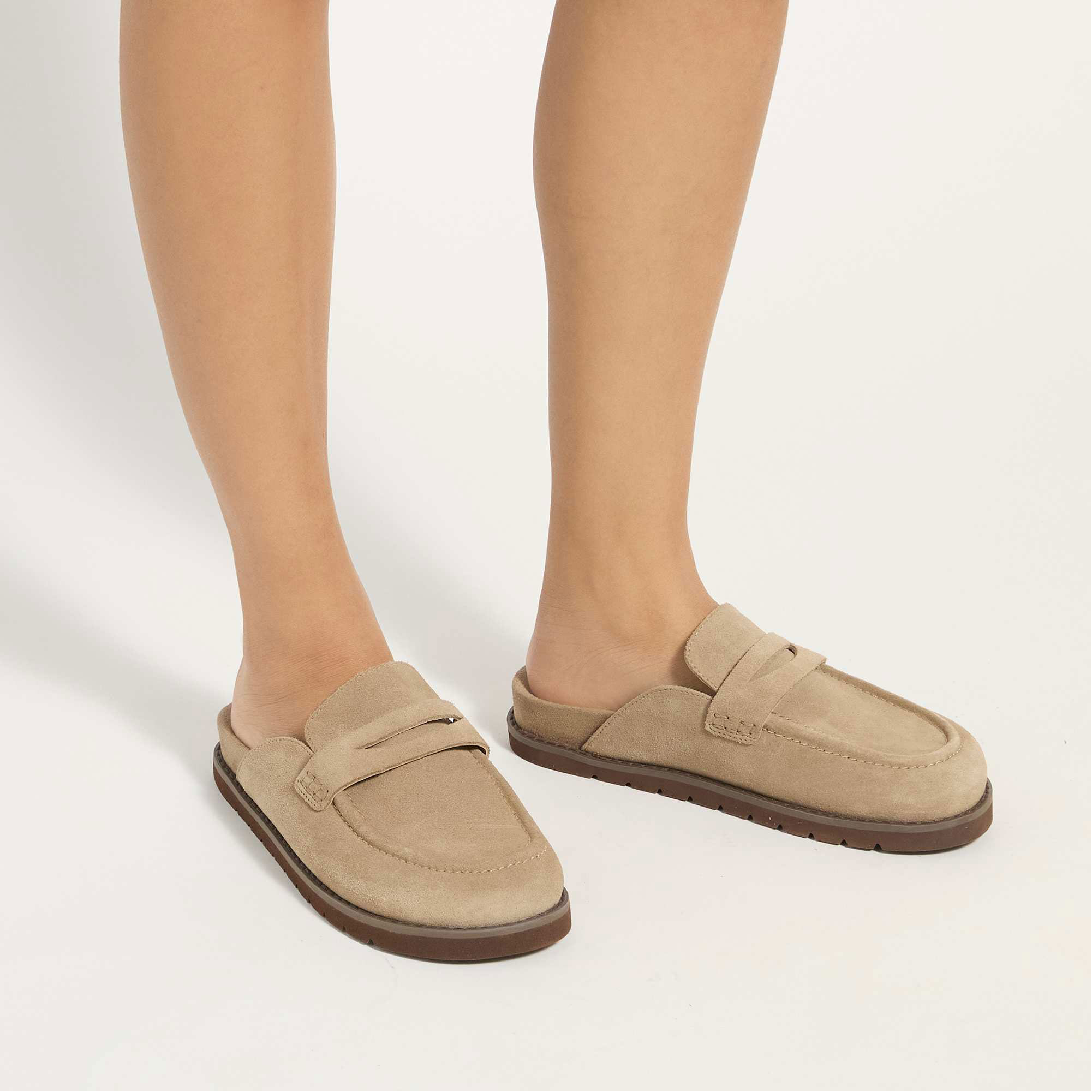 - Backless, soft suede, slip-on silhouette, lightweight EVA sole, fabric lining, round toe, flat heel