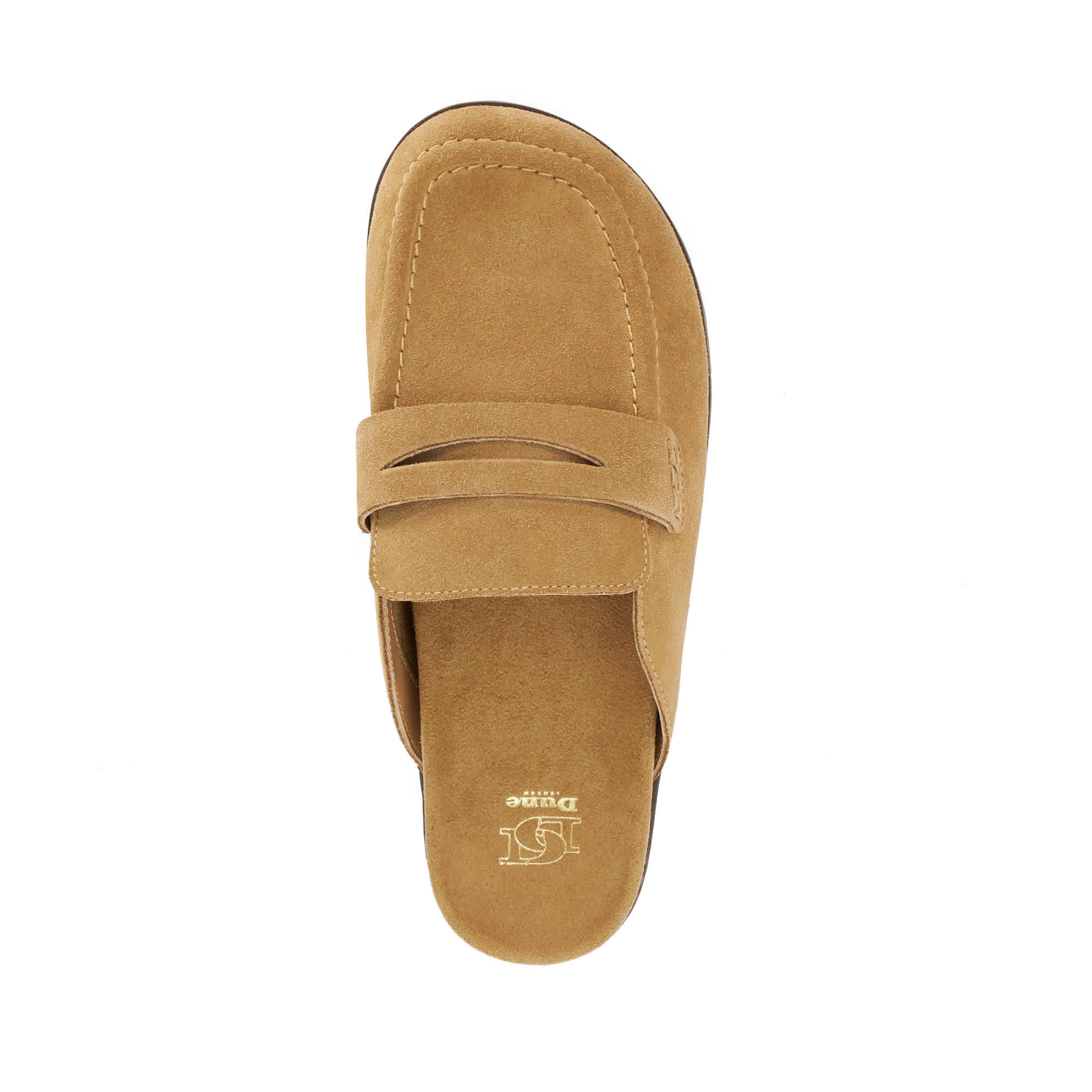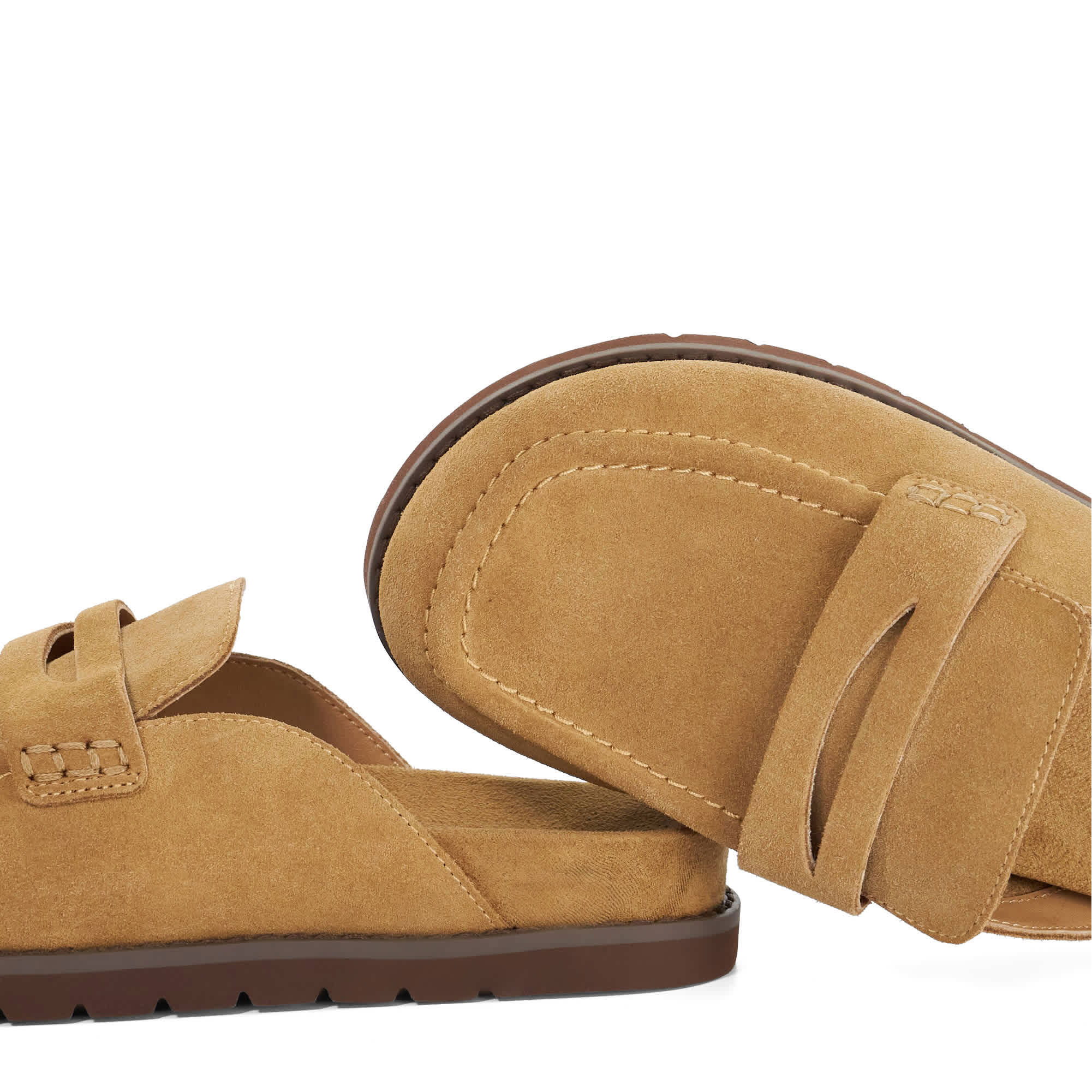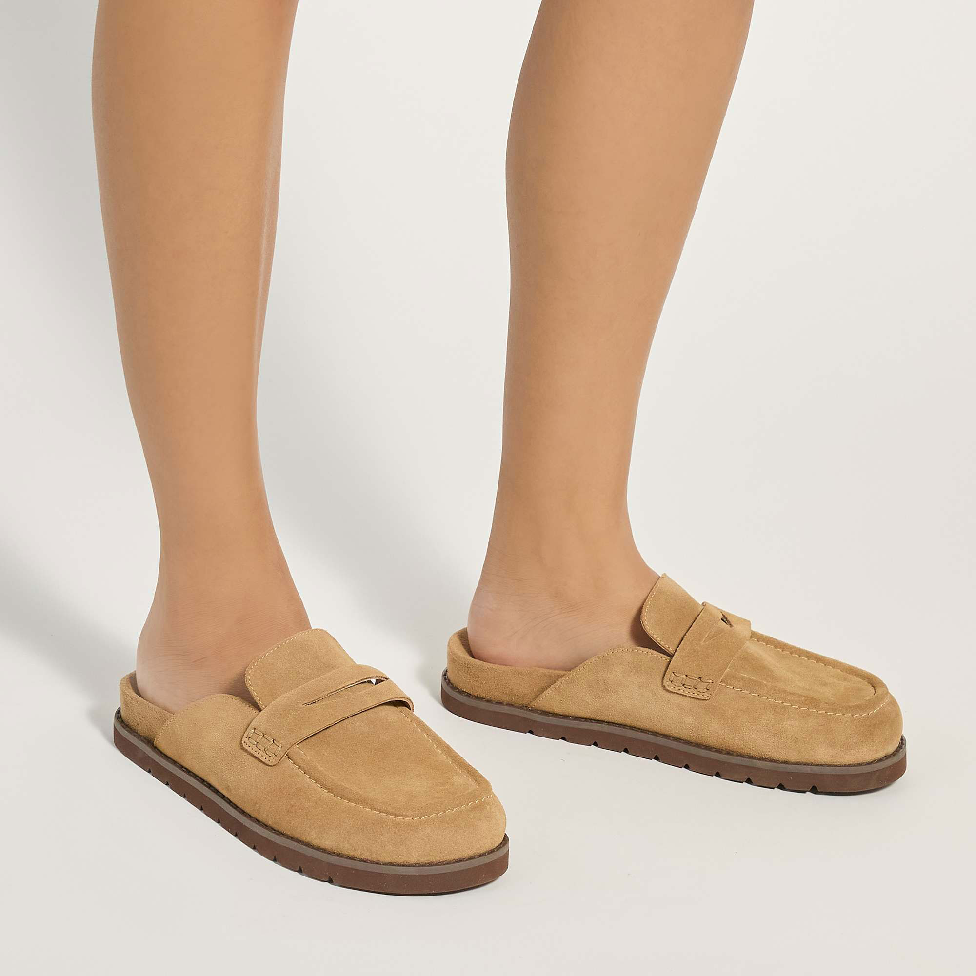 - Backless loafers, soft suede, slip-on silhouette, lightweight EVA sole, fabric lining, round toe, flat heel