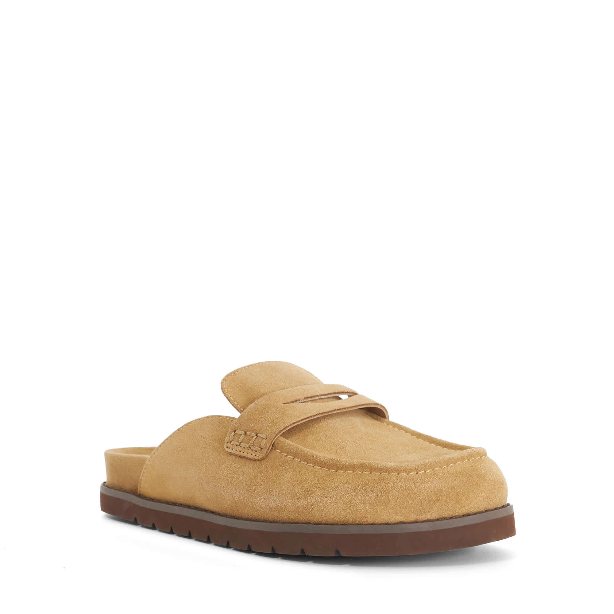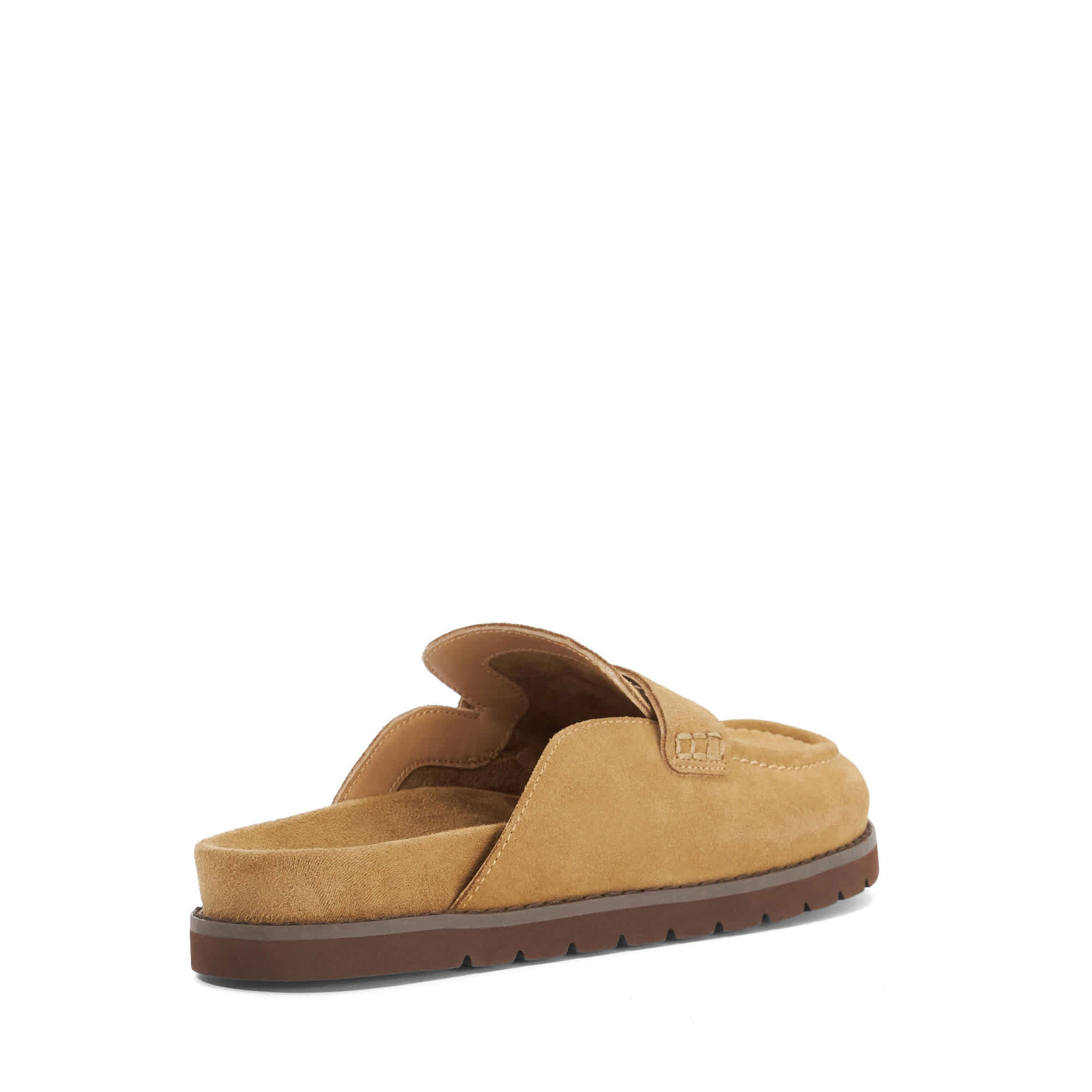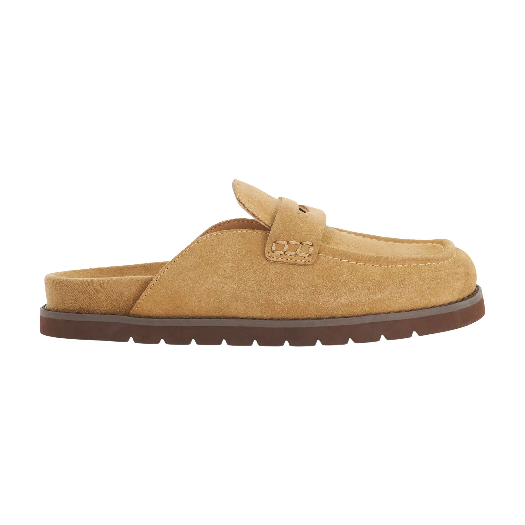 - Backless loafers, soft suede, slip-on silhouette, lightweight EVA sole, fabric lining, round toe, flat heel
